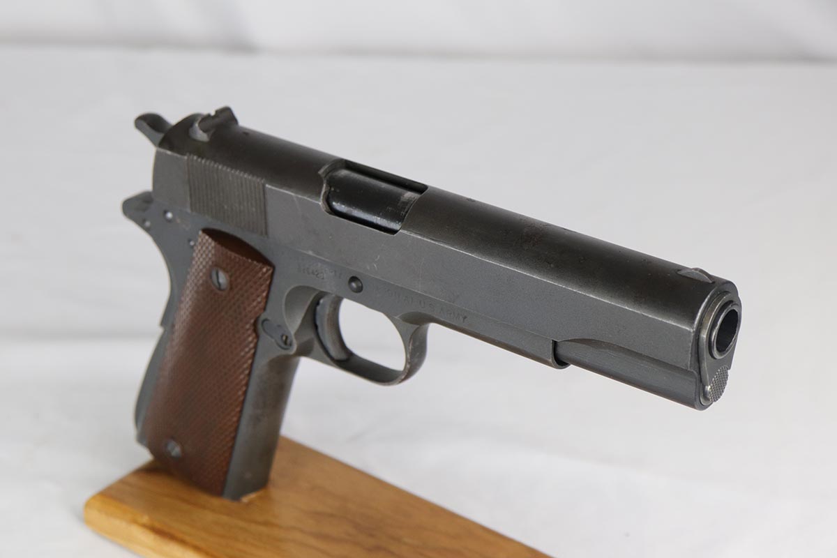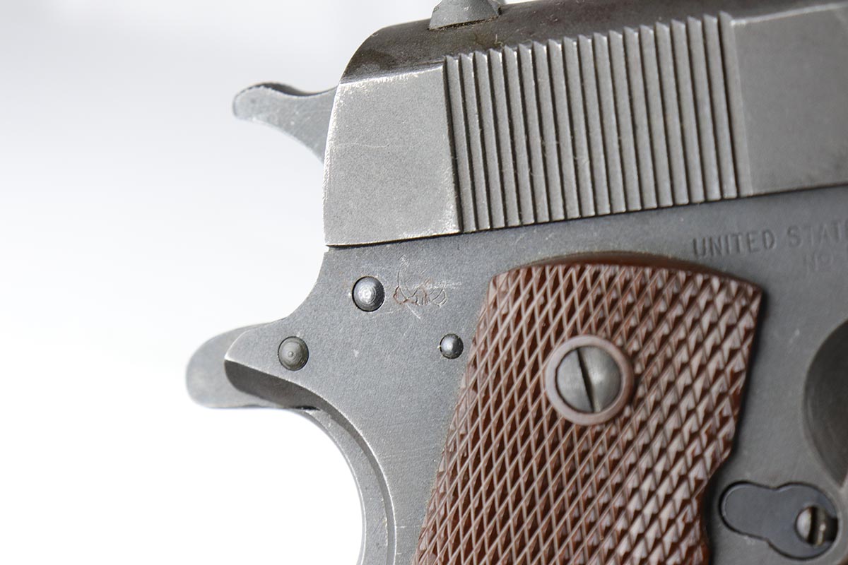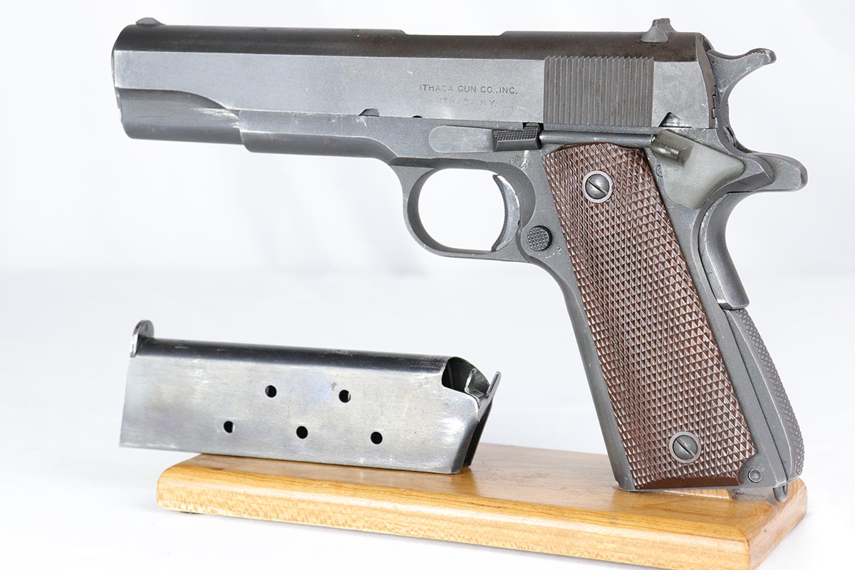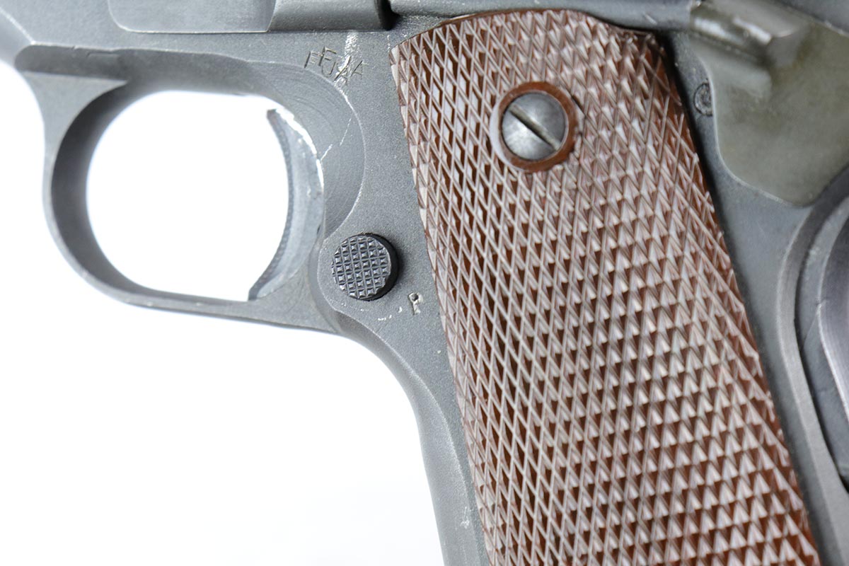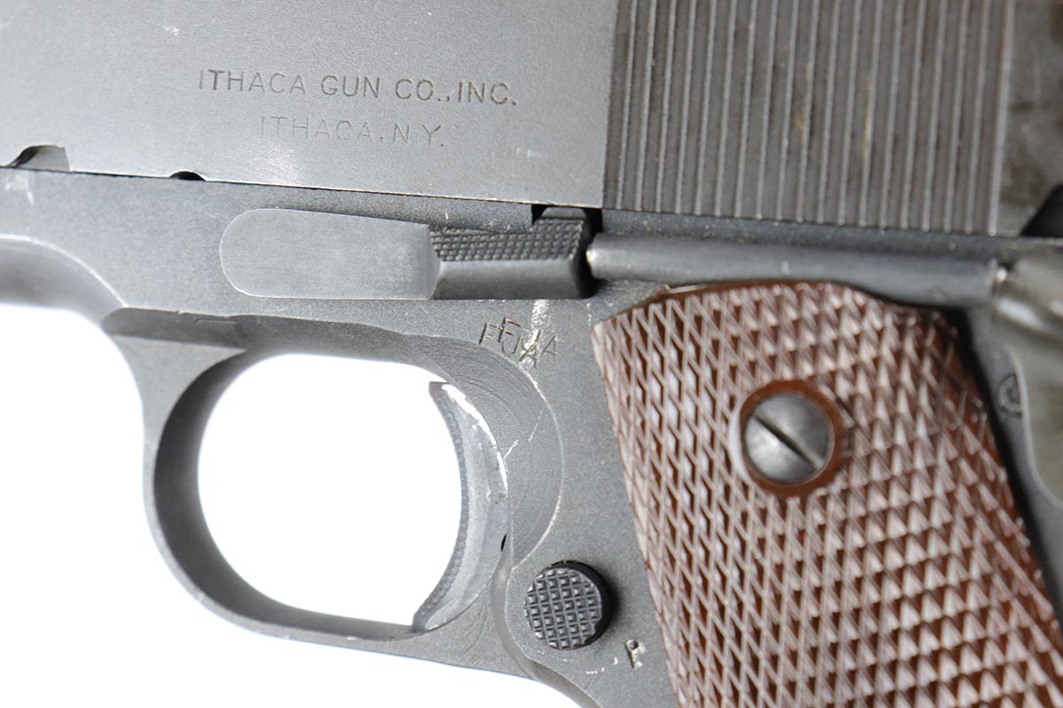 3/20/18 – This is a nice and original example of a WW2 era 1911A1, produced by Ithaca in 1943. The parkerized finish rates at about 93-95% with freckling along the top of the slide and some thinning on the front strap. HS marked barrel. ‘S’ marked magazine. Excellent bore.