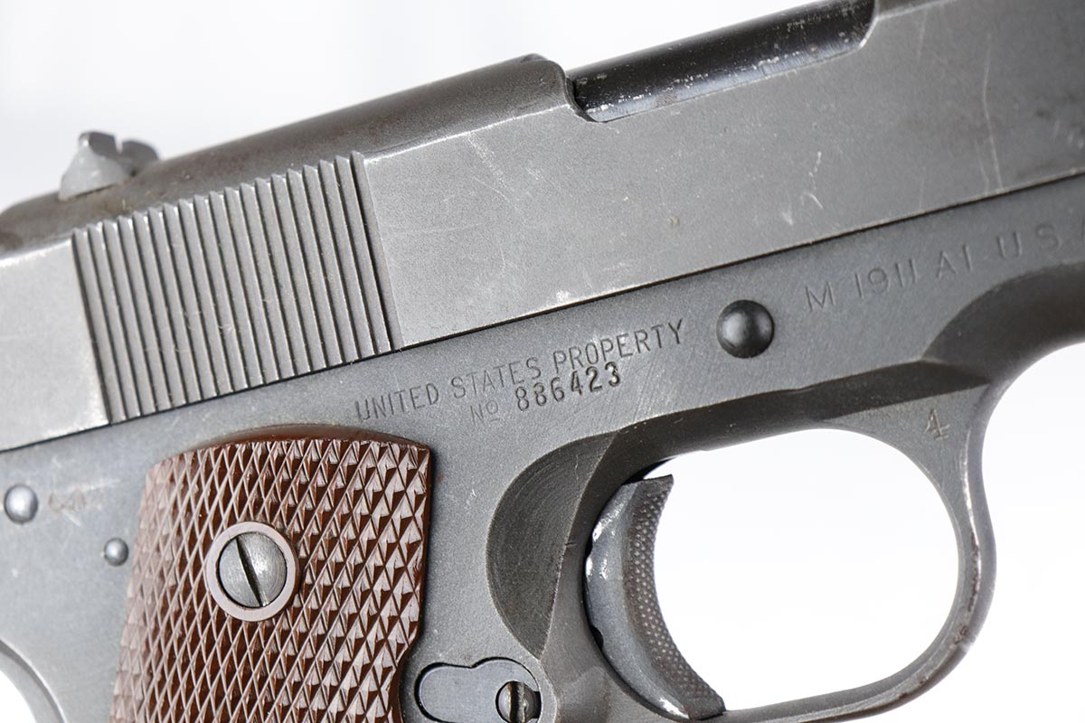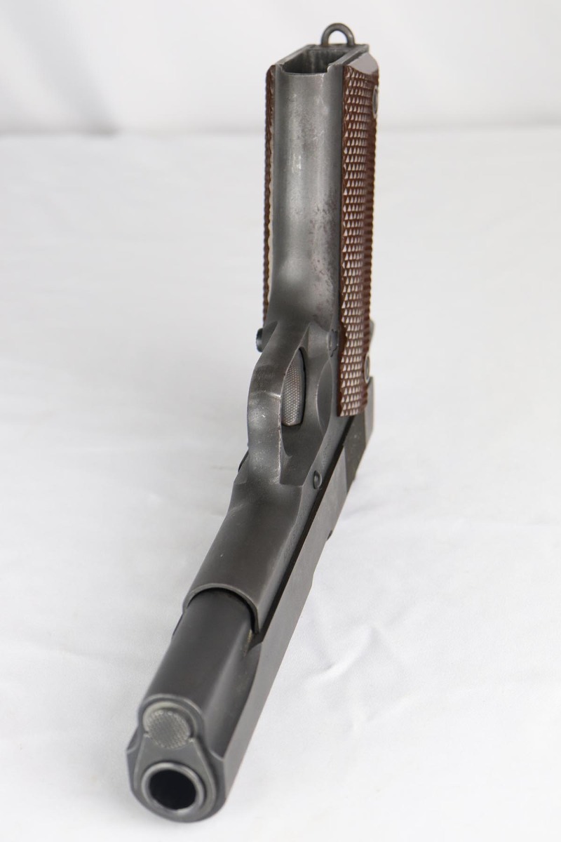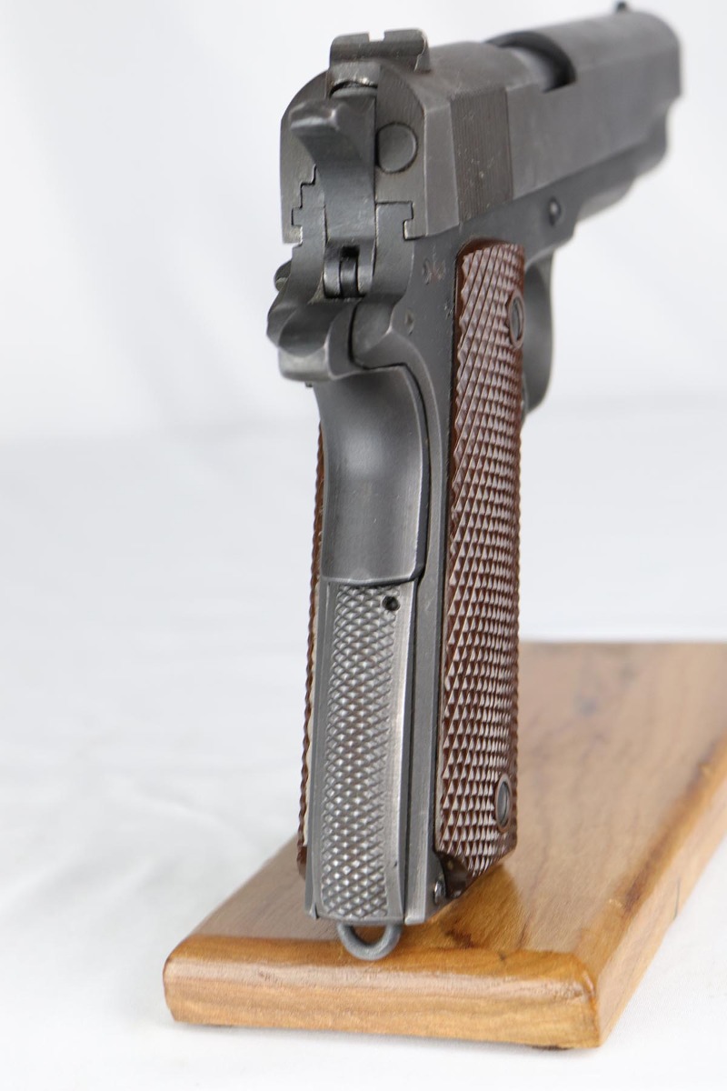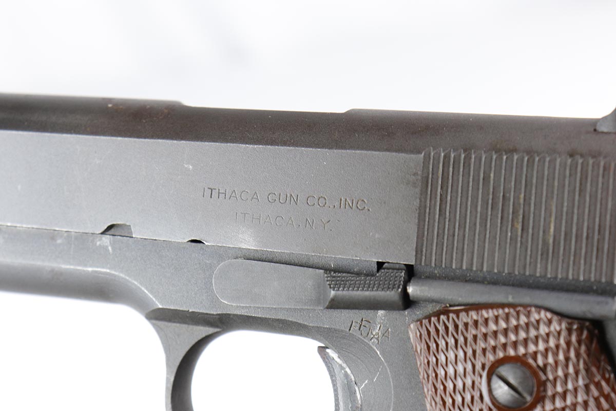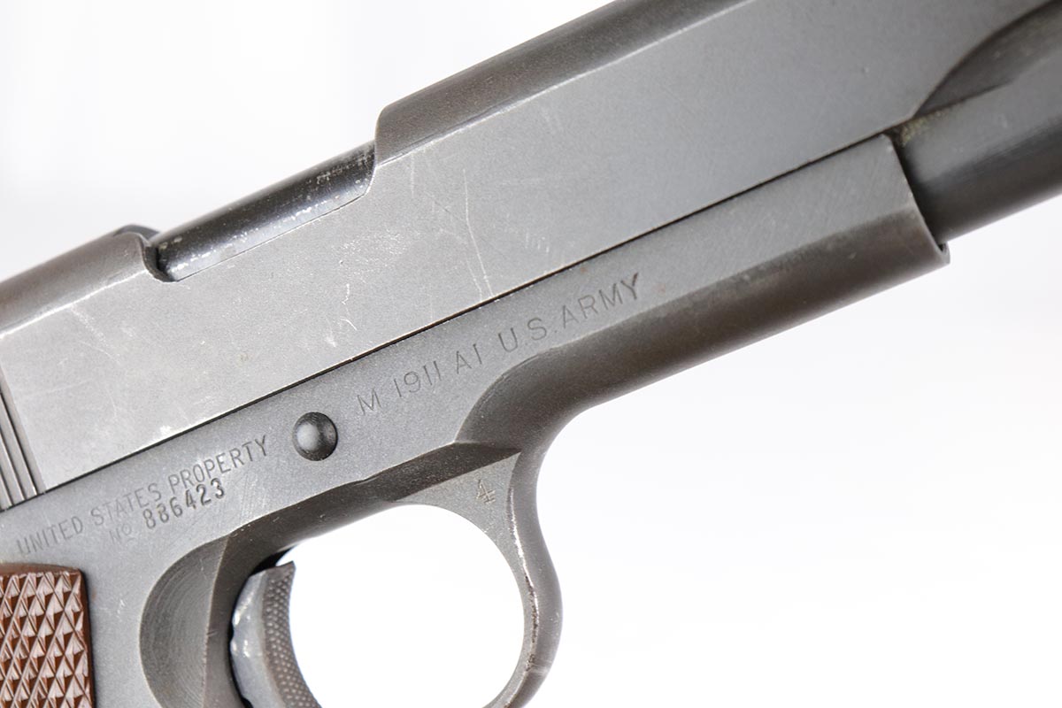3/20/18 – This is a nice and original example of a WW2 era 1911A1, produced by Ithaca in 1943. The parkerized finish rates at about 93-95% with freckling along the top of the slide and some thinning on the front strap. HS marked barrel. ‘S’ marked magazine. Excellent bore.