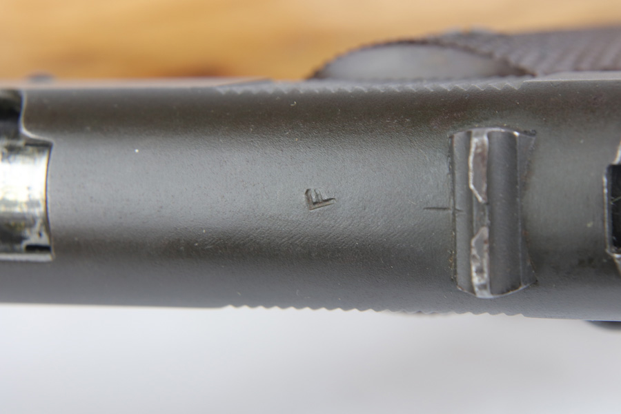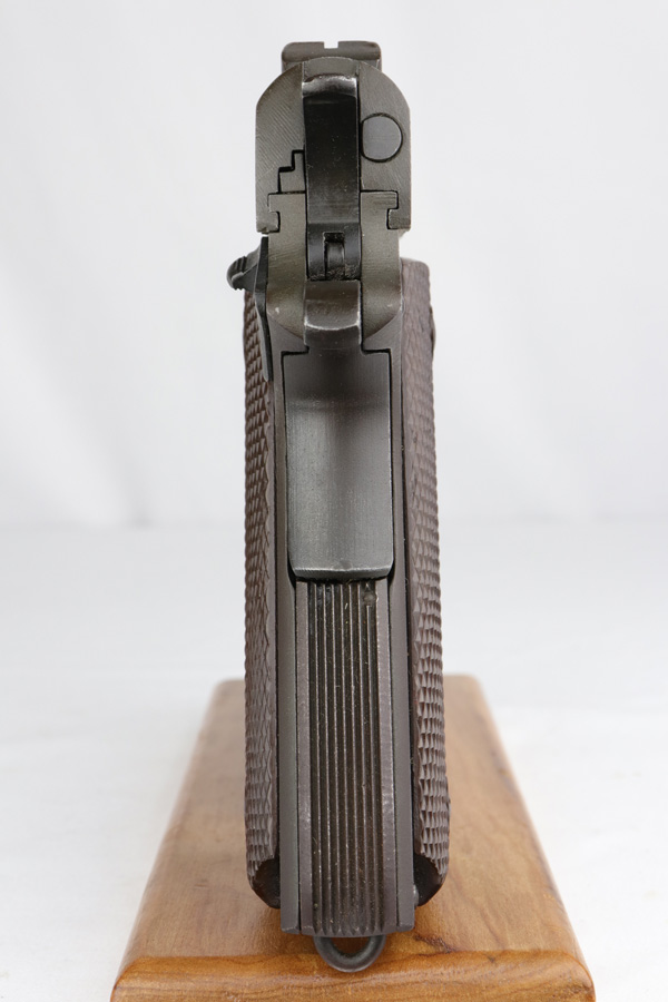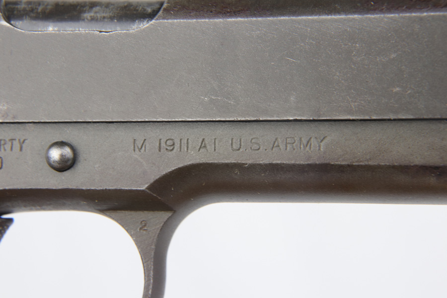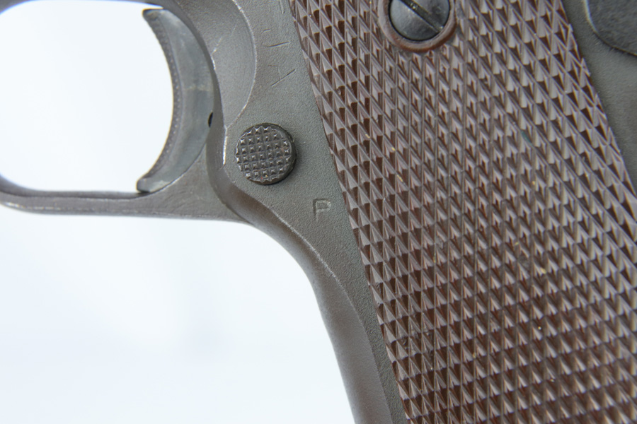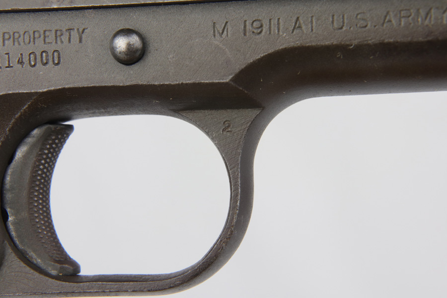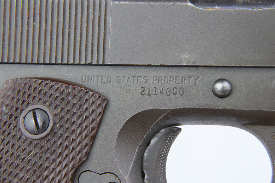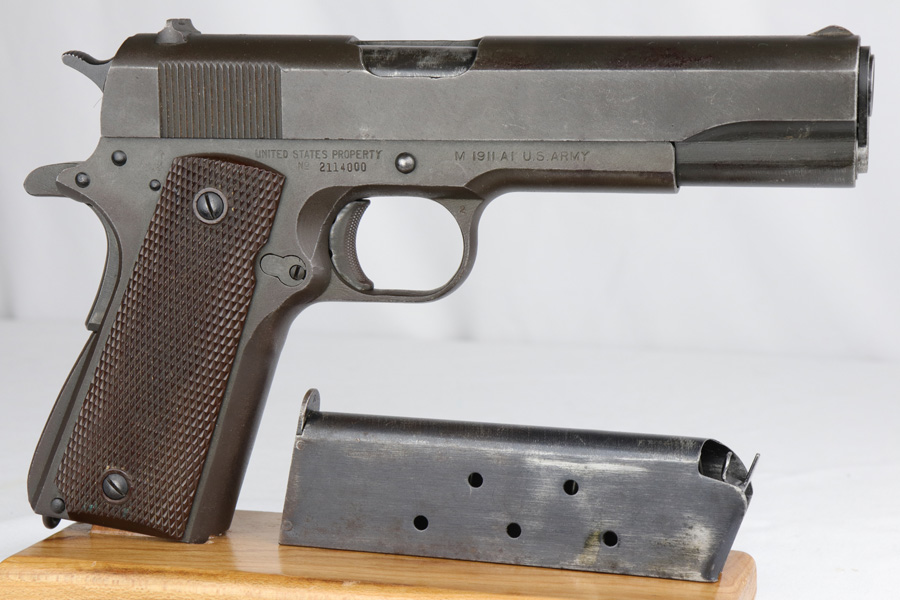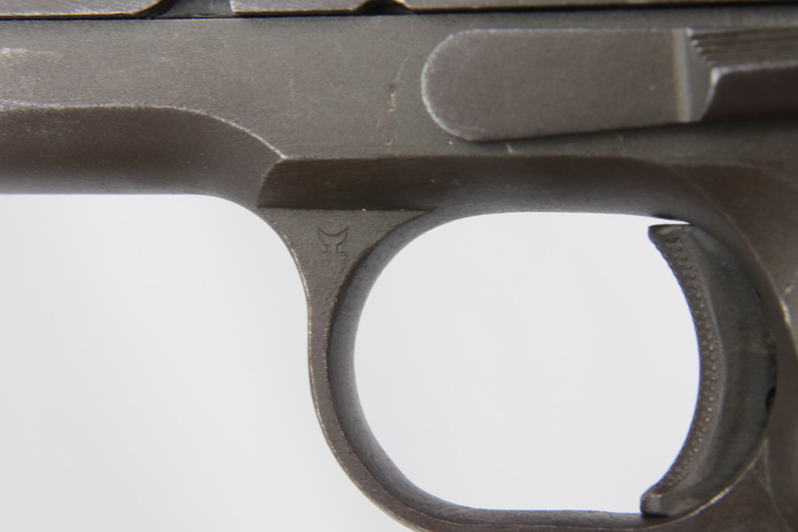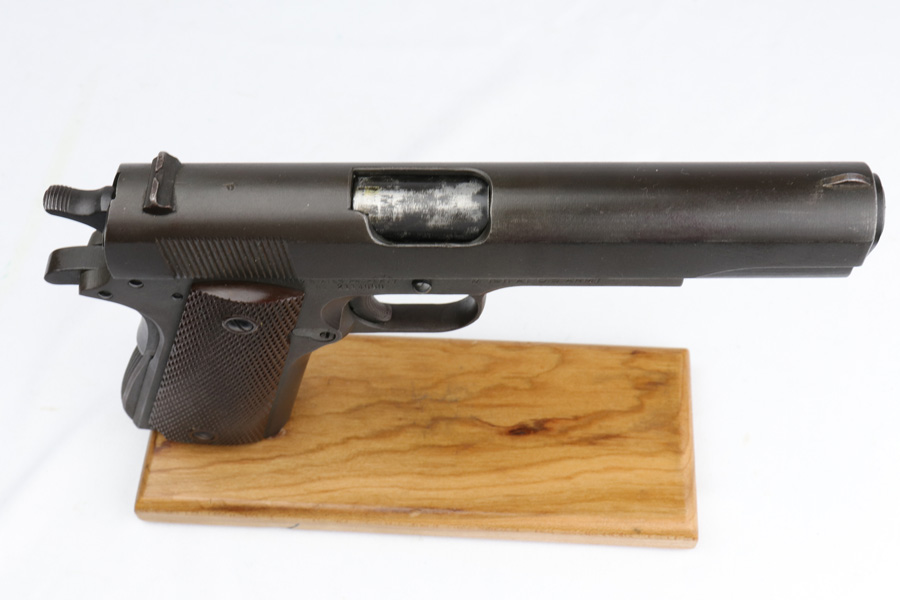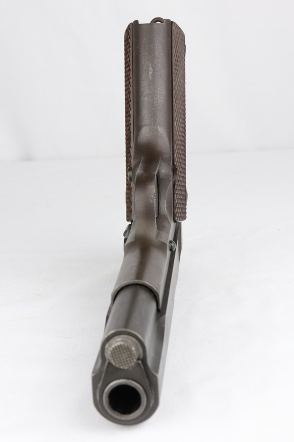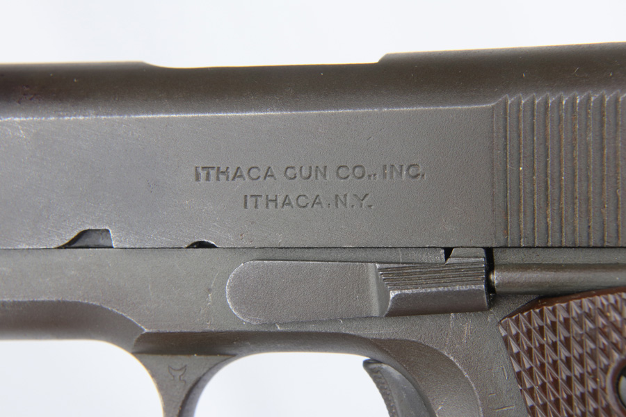 12/4/18 – This is a late Ithaca M1911A1 from World War II, manufactured in 1945 for US Army issue. The pistol is all original and correct with 97% parkerized finish remaining, showing only minor edge wear. Excellent grips and bore. John Wood inspector mark. ‘R’ marked magazine.