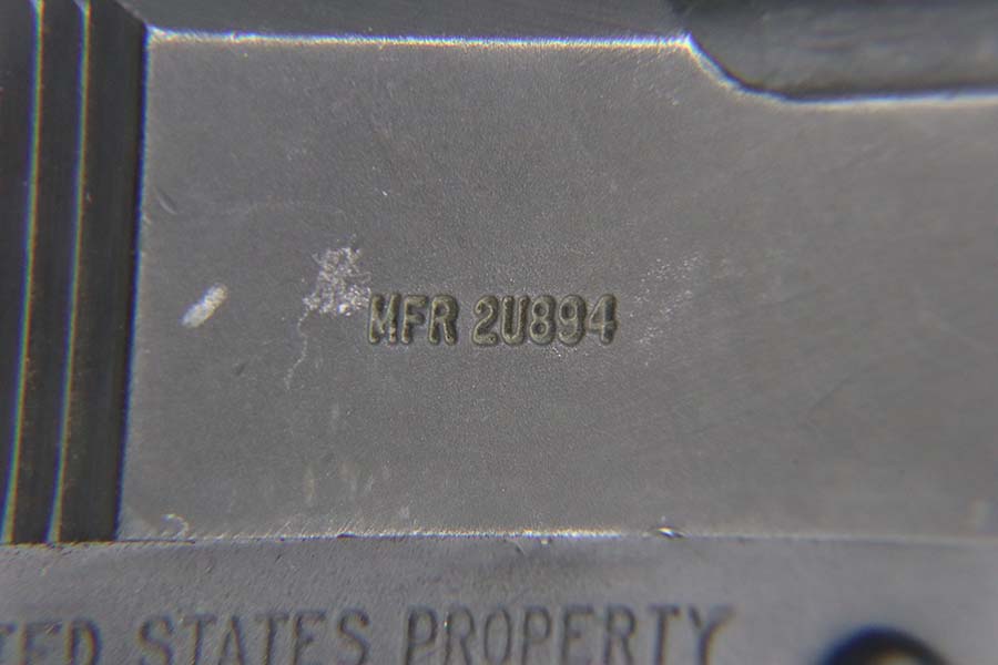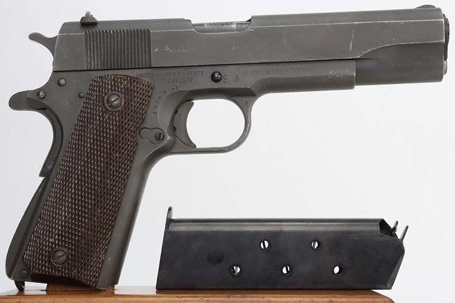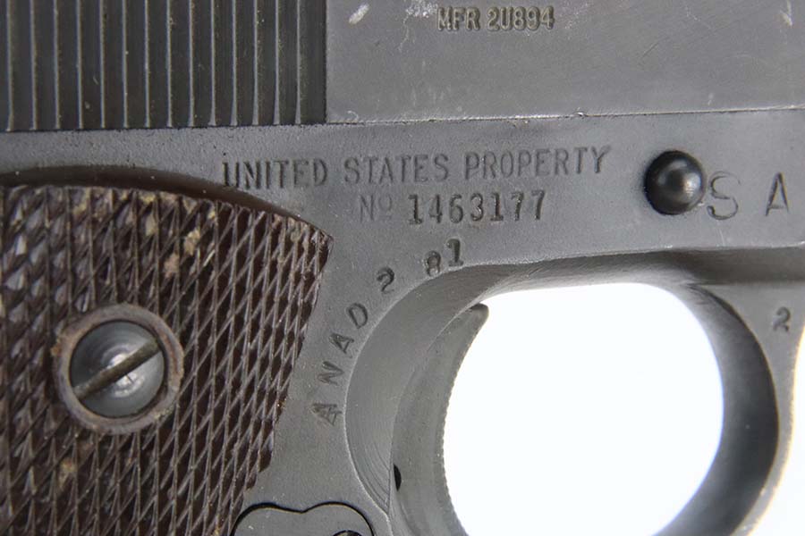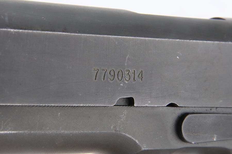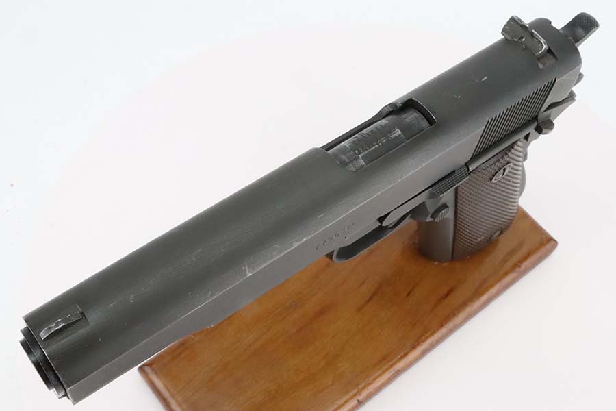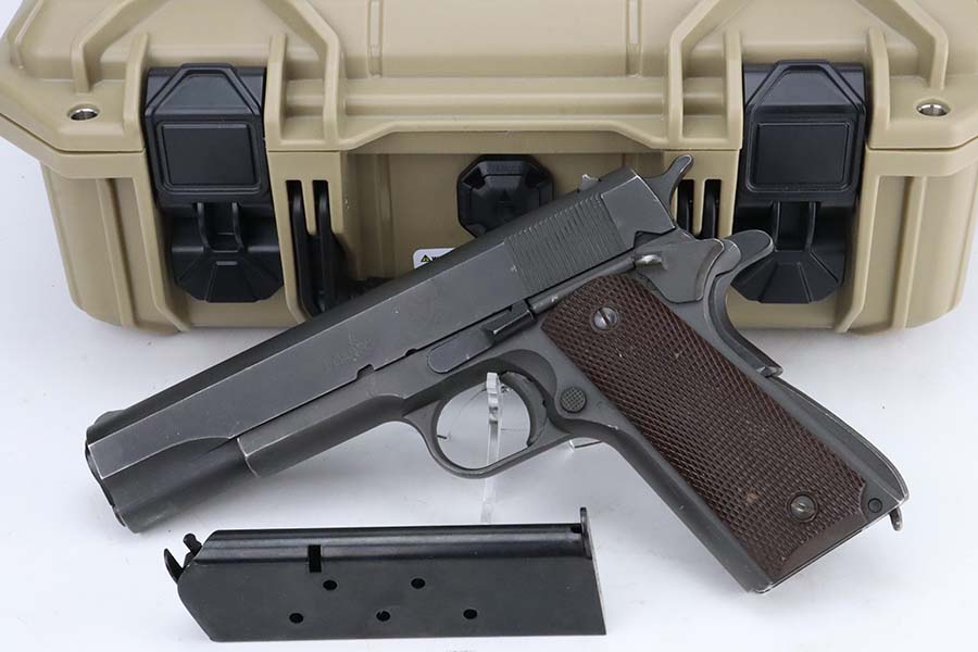 3/8/24 – This is an Ithaca 1911A1 issued to the US military in 1943. Modern replacement slide and barrel. It was restored and sold to the American public through the Civilian Marksmanship Program (CMP). It comes with an owners manual, CMP Pelican-style case, and one post-war magazine. The gun itself has retained about 97% of its finish with just some very light scuffs and handling marks here and there. Fitted with period-correct reddish plastic grips. The bore has strong rifling, but there is very light pin-pricking throughout.