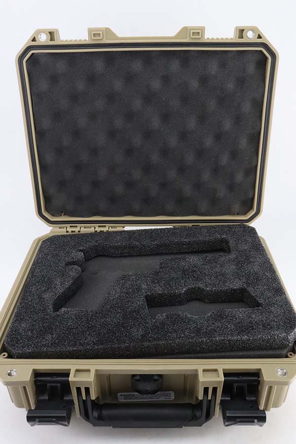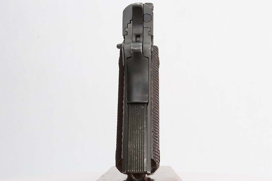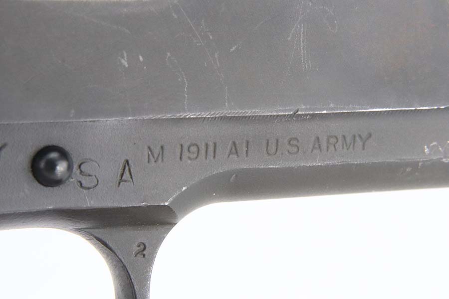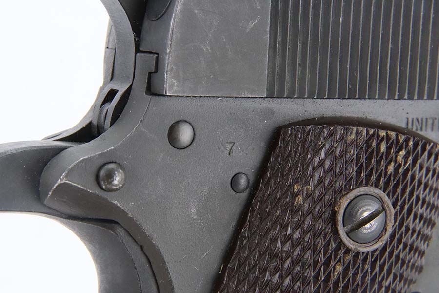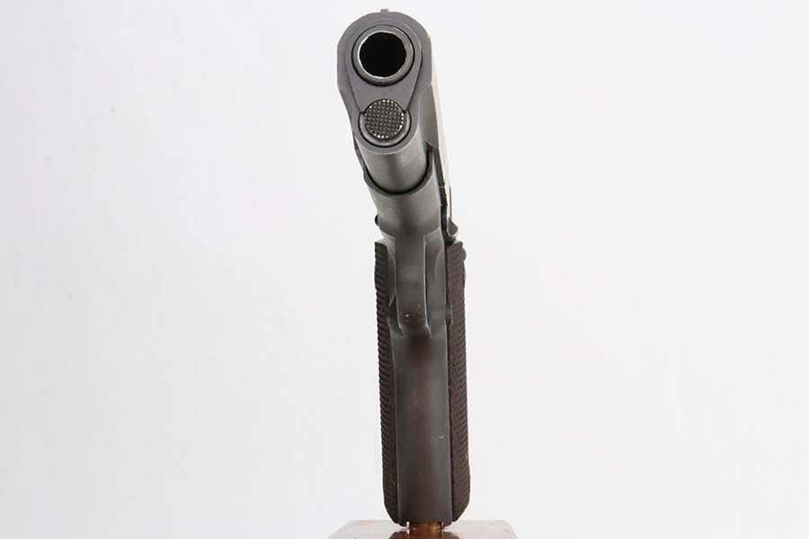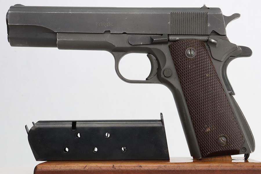 3/8/24 – This is an Ithaca 1911A1 issued to the US military in 1943. Modern replacement slide and barrel. It was restored and sold to the American public through the Civilian Marksmanship Program (CMP). It comes with an owners manual, CMP Pelican-style case, and one post-war magazine. The gun itself has retained about 97% of its finish with just some very light scuffs and handling marks here and there. Fitted with period-correct reddish plastic grips. The bore has strong rifling, but there is very light pin-pricking throughout.