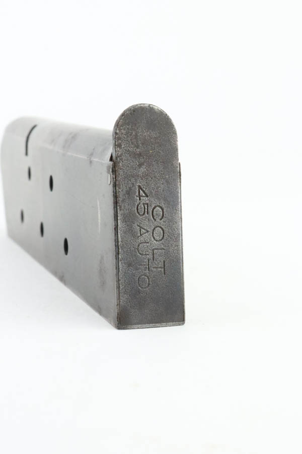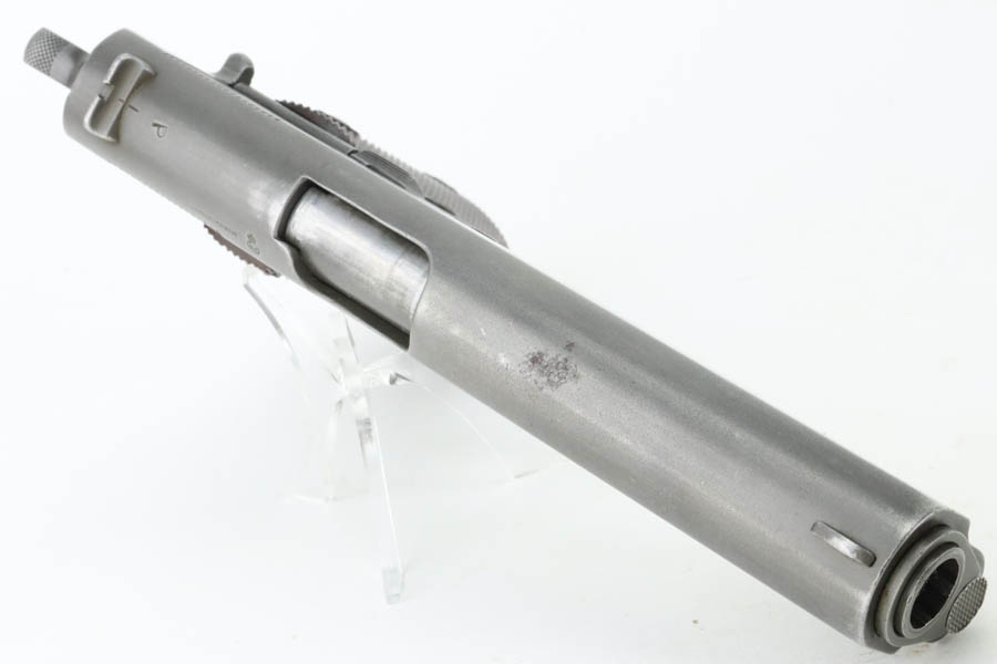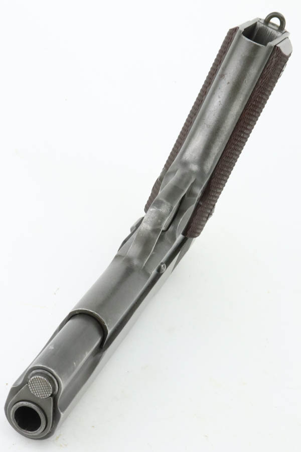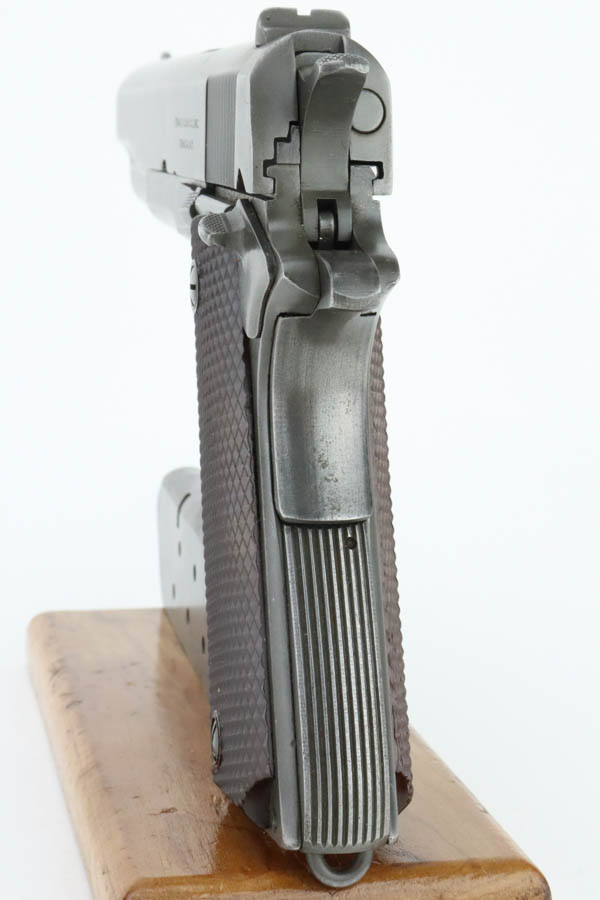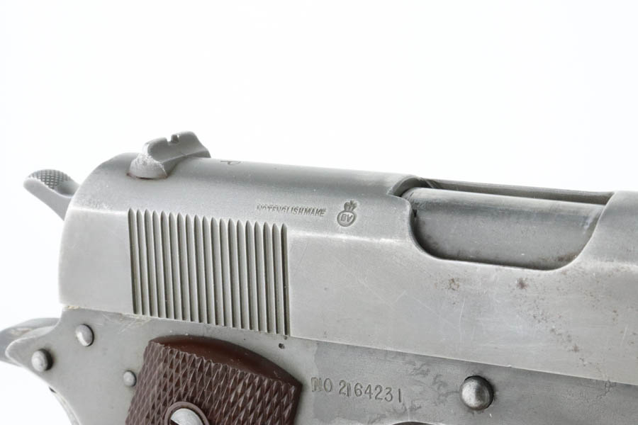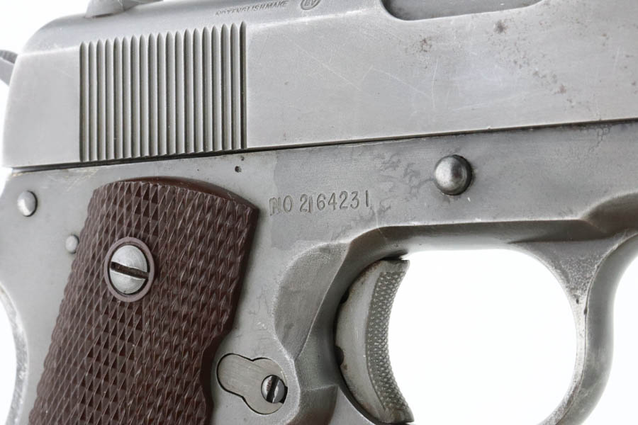 7/1/24 – This is a nice example of an Ithaca / Remington 1911A1. The slide was made by Ithaca and the frame was made by Remington Rand. From the serial number on the frame, it was manufactured in 1945. For some reason, the serial number and inspection initials on the frame have been reapplied. High Standard barrel. The finish rates roughly 80% with fairly even thinning throughout. Fitted with period-correct reddish-brown plastic grips. Comes with a post-war commercial magazine. Excellent bore.