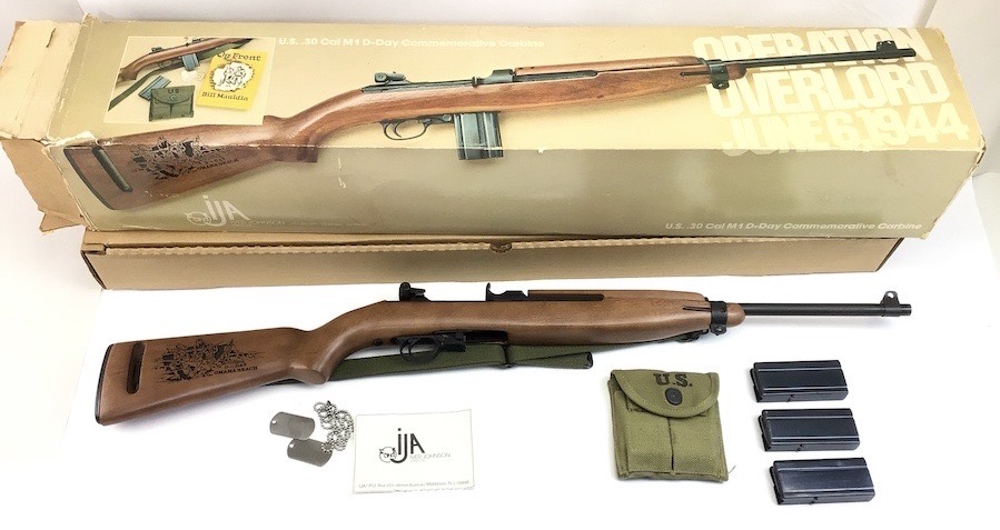 8/7/23 – Mint condition. ANIB, D-Day Commemorative M1 Carbine by Iver-Johnson. These were the only carbine manufactured by Iver Johnson with the Middlesex markings on the left side of the receiver. Manufactured between 1980 and 1982, these were the first commemorative carbine released by anyone. Made to commemorate the 1944 Omaha Beach “Operation Overlord”. Beautiful laser engraving on the right side of the stock. Includes original box, 3, 15 round magazines stamped “U” on the spine, canvas double magazine pouch, 20″ x 20″ color poster of D-Day invasion, registration card and a set of dog tags. Fully operational.
