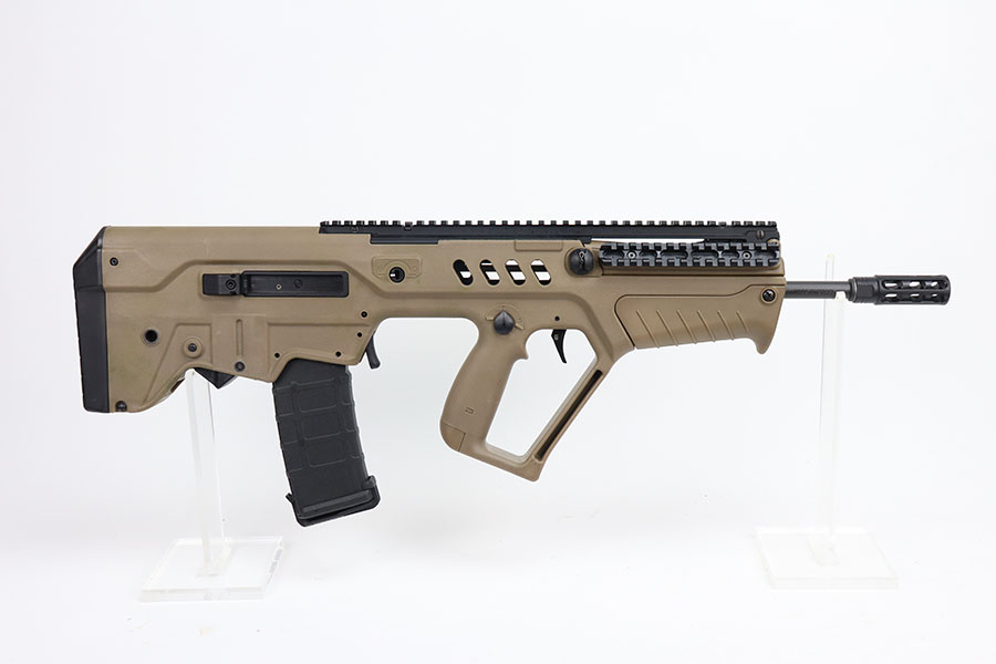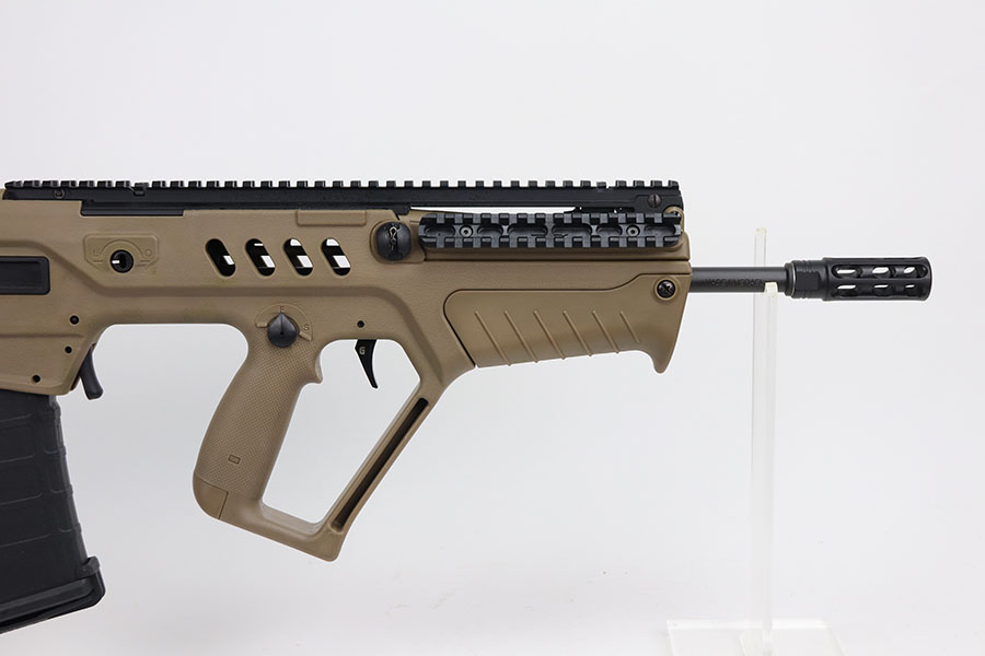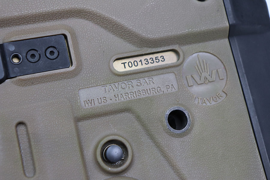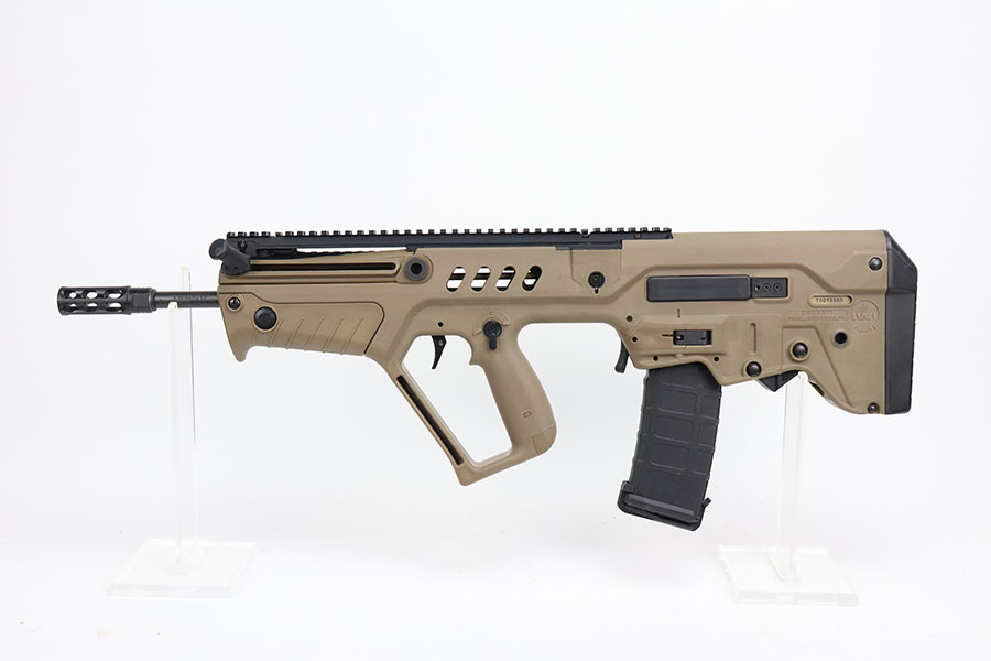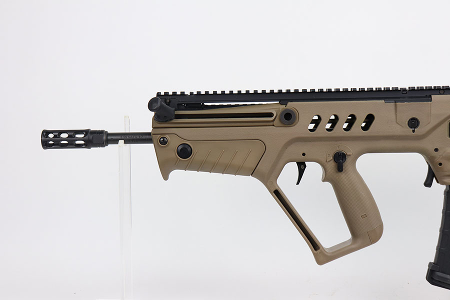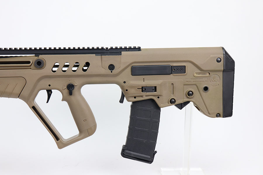 4/1/21 – This is an IWI Tavor SAR rifle with 16.5 inch barrel and 30 round magpul magazine. In 2013, IWI started a US subsidiary, IWI US, which is manufacturing the semi-automatic TC-21 as the Tavor SAR for U.S. sales. The weapon is manufactured with a combination of Israeli and US parts. IWI US had shipped 50,000 Tavor SARs to US civilian customers by early 2016. Flat dark earth (FDE) finish shows minor age and handling wear but excellent condition overall. This particular example was upgraded with the Geissele trigger pack and bow trigger, and also has a super compensator installed. Excellent bore that shows very little use. Also includes the barrel takedown tool.