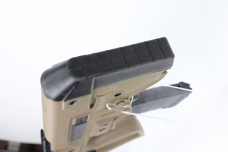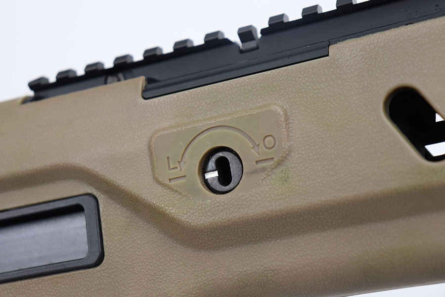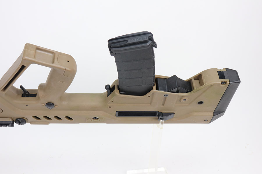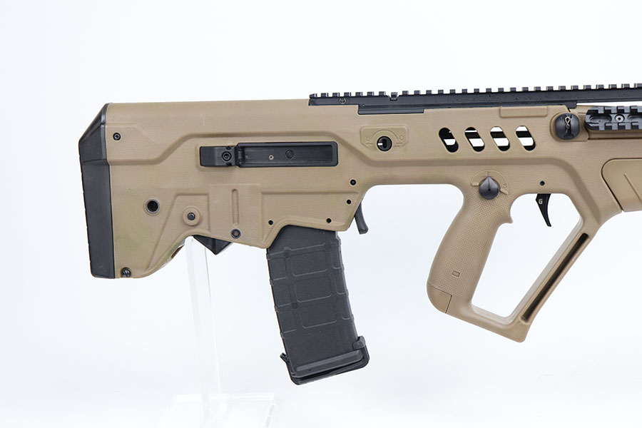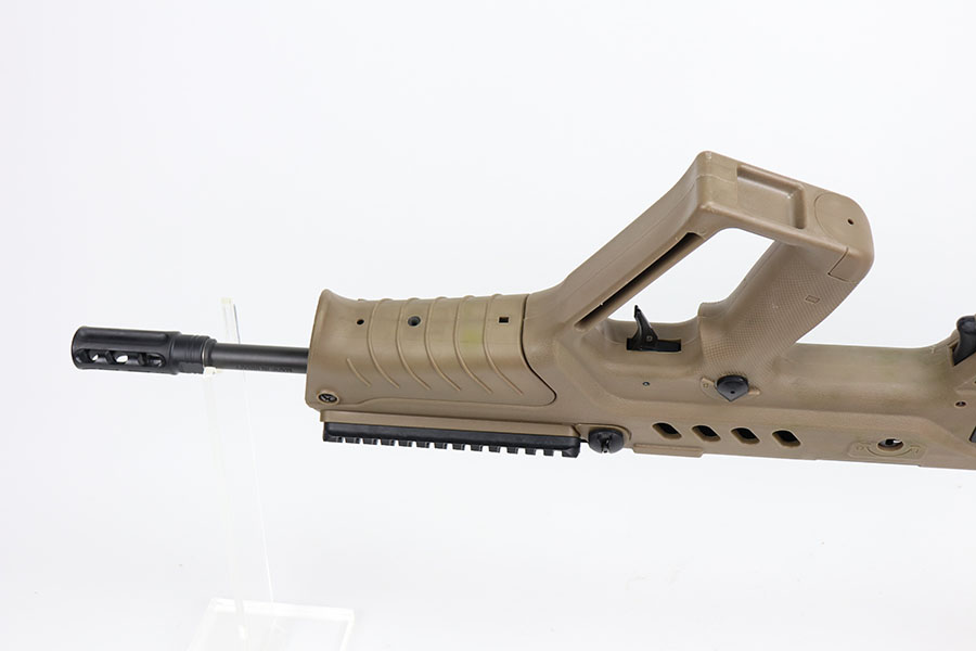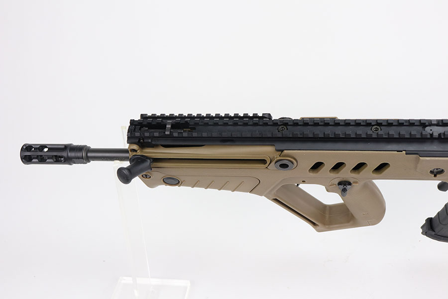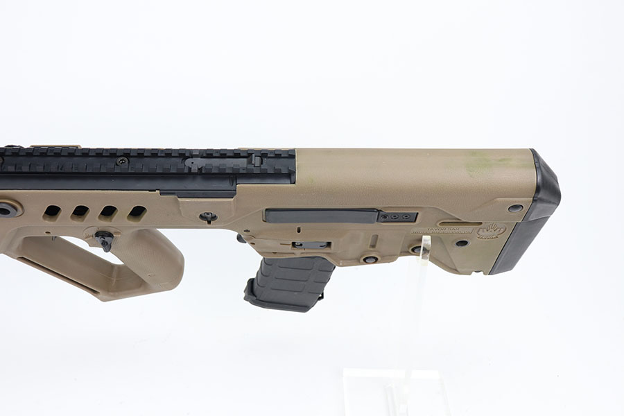 4/1/21 – This is an IWI Tavor SAR rifle with 16.5 inch barrel and 30 round magpul magazine. In 2013, IWI started a US subsidiary, IWI US, which is manufacturing the semi-automatic TC-21 as the Tavor SAR for U.S. sales. The weapon is manufactured with a combination of Israeli and US parts. IWI US had shipped 50,000 Tavor SARs to US civilian customers by early 2016. Flat dark earth (FDE) finish shows minor age and handling wear but excellent condition overall. This particular example was upgraded with the Geissele trigger pack and bow trigger, and also has a super compensator installed. Excellent bore that shows very little use. Also includes the barrel takedown tool.