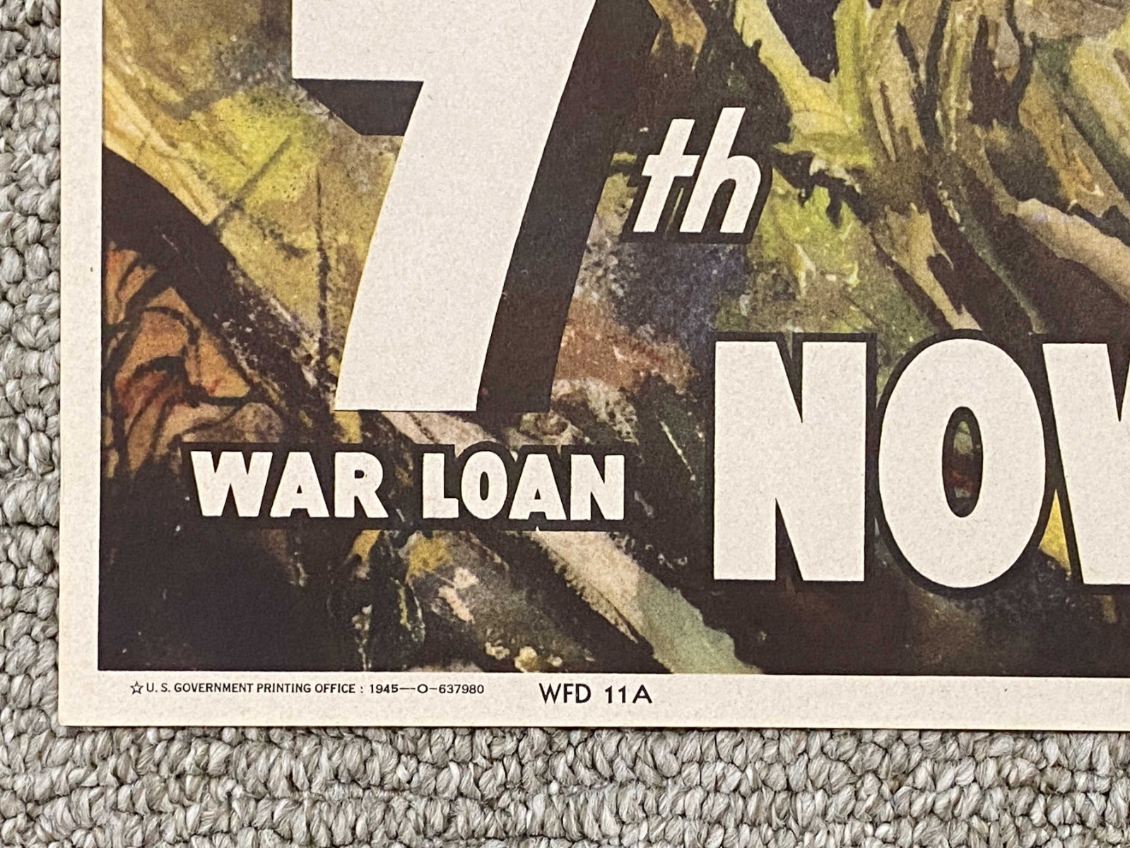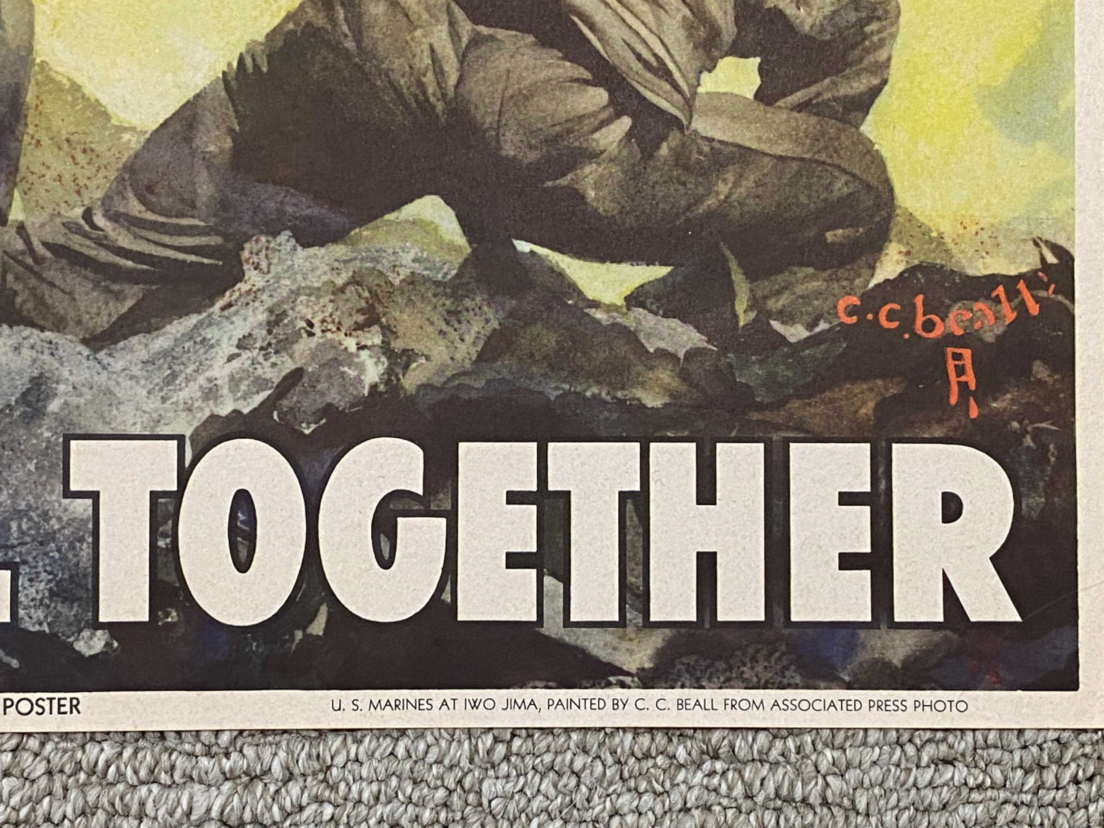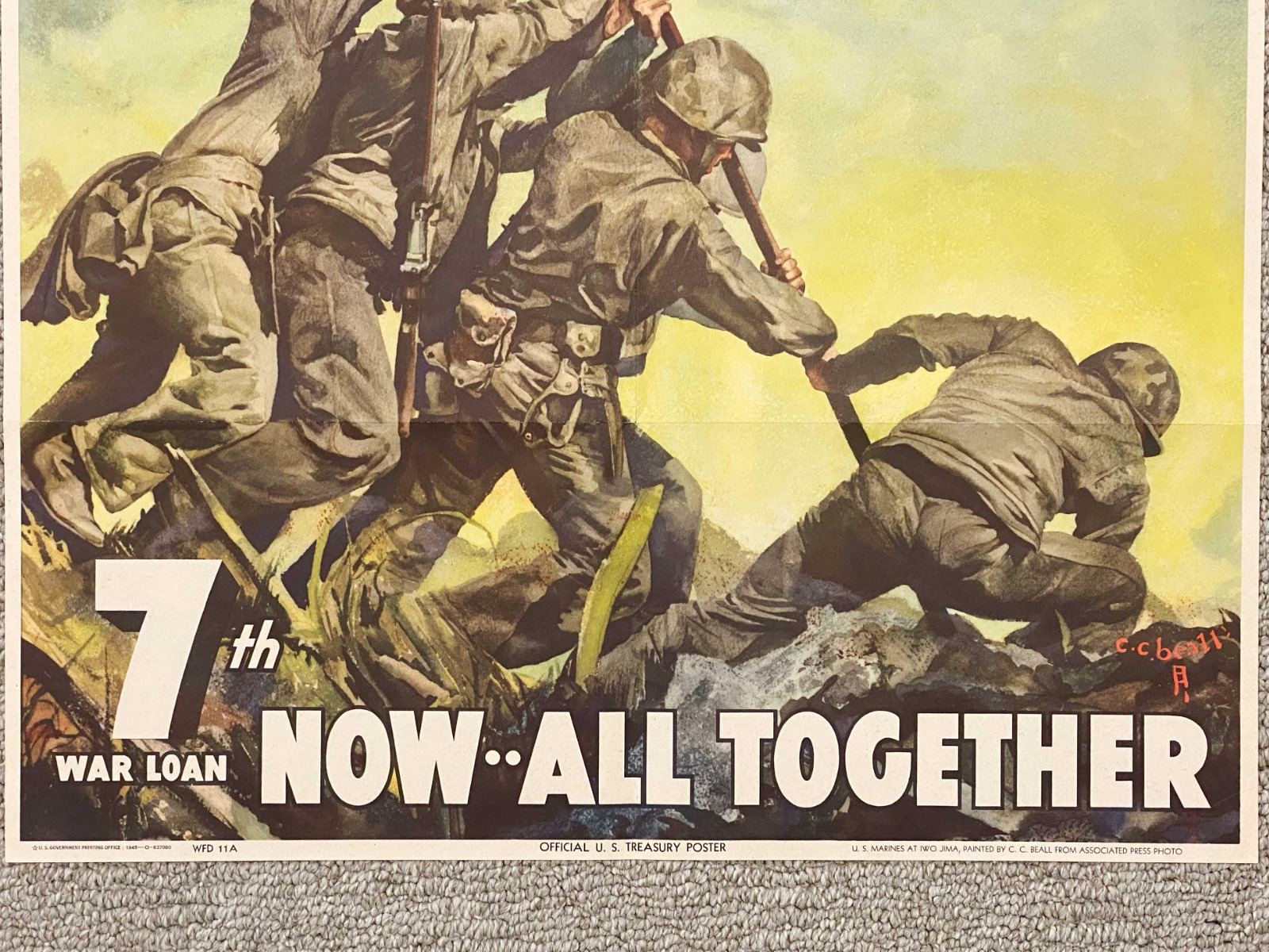 10/10/22 – This is an original 1945 dated printing of a US Propaganda / War Bond poster. The poster is in excellent condition and marked “7th War Loan… Now – All Together” and depicting the US Marines raising the flag at Iwo Jima. Vibrant colors and completely intact with some mild yellowing and typical signs of aging and folding, but no excessive wear. Dated 1945 and marked from the US Treasury as shown. Measures approx. 18.5 x 26 inches.