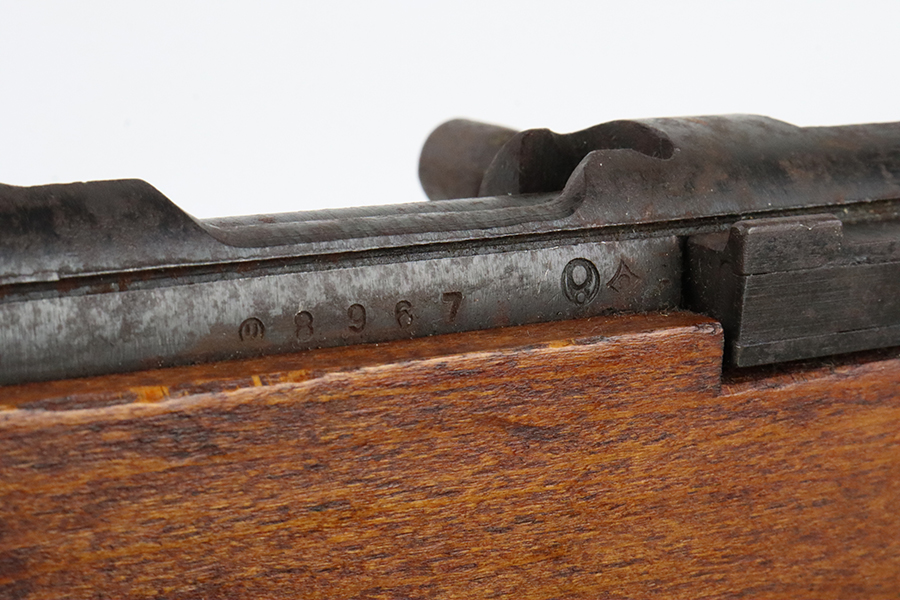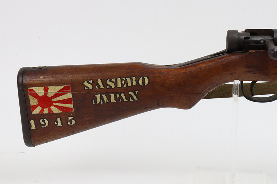 02/27/2024 – For sale is a Late war Type 99 Arisaka made at the Izawa Jyuko Factory around 1945. This is a 9th series rifle so it’s the last batch of rifles Izawa Jyuko made before the war ended. The rifle has many late war features like a simplified stock, barrel bands, single peep rear sight, and bolt. The rifle has a bolt mismatch but is another late-series bolt. The Imperial Mum has also been ground away as typical from bringbacks. The stock has an Imperial Navy flag painted with the words “Sasebo, Japan 1945” which was likely done by the GI that brought the rifle home. Sasebo is a port city in western Japan. The bore is fairly dark with moderate rifling.