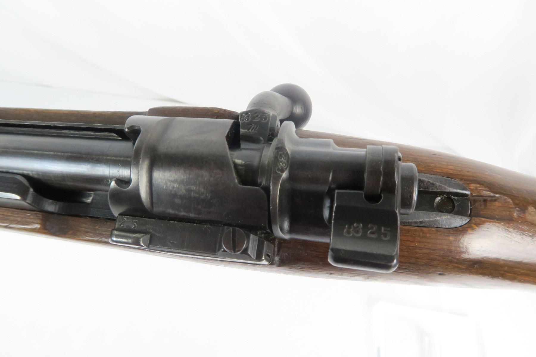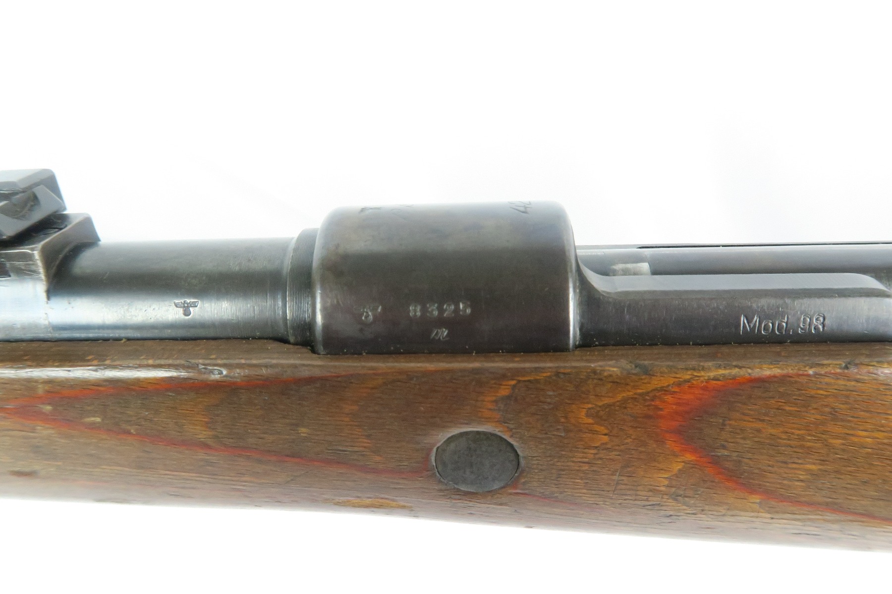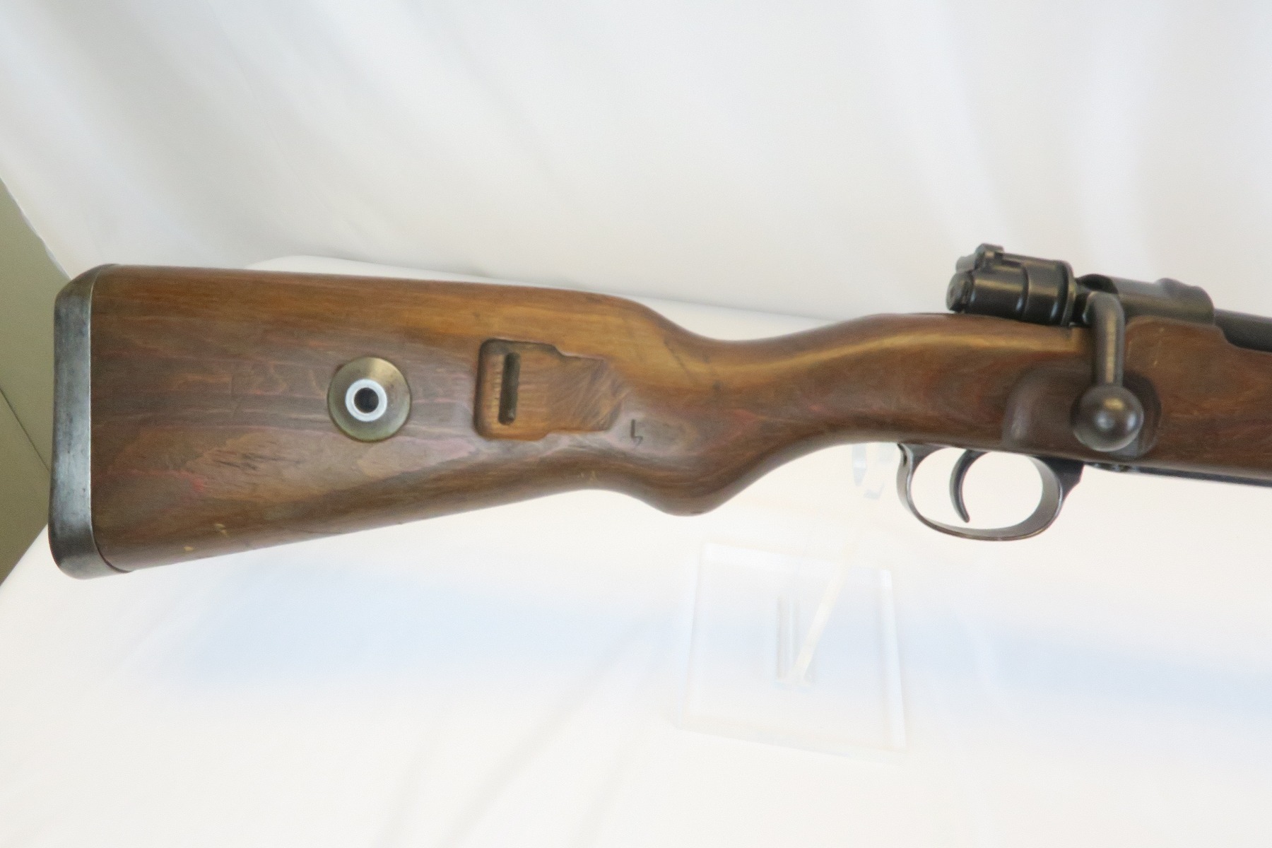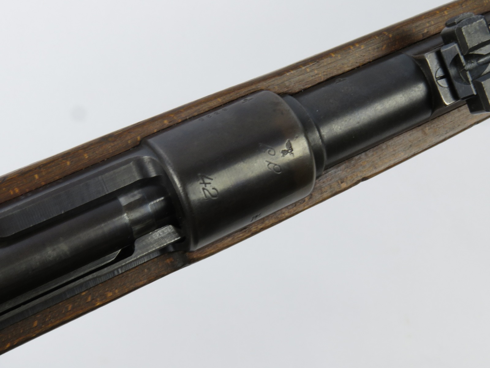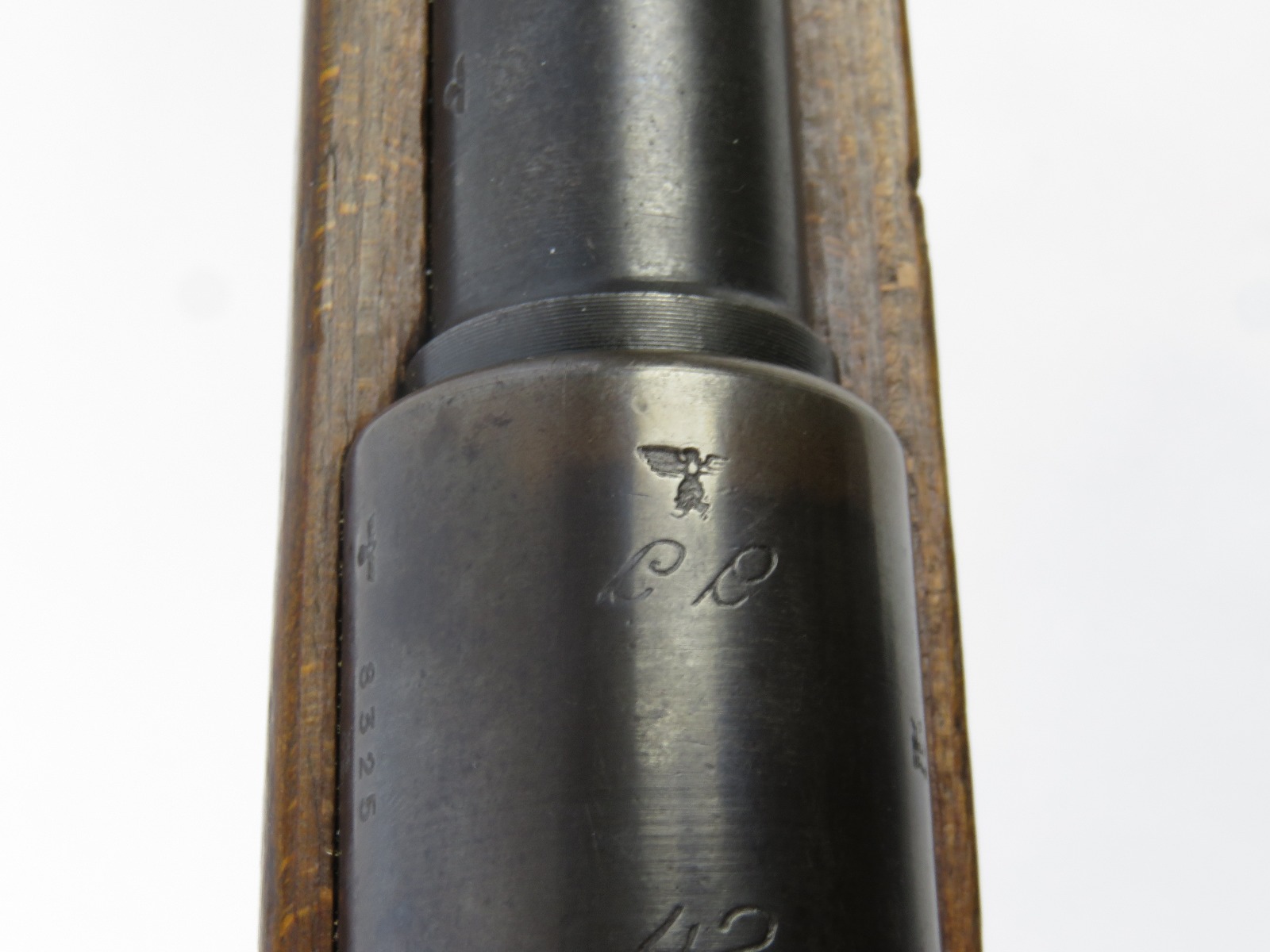 12/29/17 – This is an original WW2 production “CE” K98 Rifle. The receiver is marked “CE” which is a J.P. Sauer & Sohn manufacturing code. The rifle receiver is dated 42, and serial numbered 8325m. The rifle is all matching except for the barrel band and stock. The bolt, receiver, rear sight, and floor plate are all matching numbed. The butt plate is waffen proofed with a “bpr” code. The wood stock is serial numbered 6139 and “P” proofed. The wood is in great condition with a nice reddish striping throughout the wood. The wood has no cracks or chips. The metal has some wear and there is a significant amount of bluing loss, but there is no significant rust or pitting to note. The bore has strong rifling but there appears to be patina/residue within the rifling and throughout the bore, which leaves us with a rating of about 6 or 7 out of 10. Priced to sell based on condition, guaranteed all original.