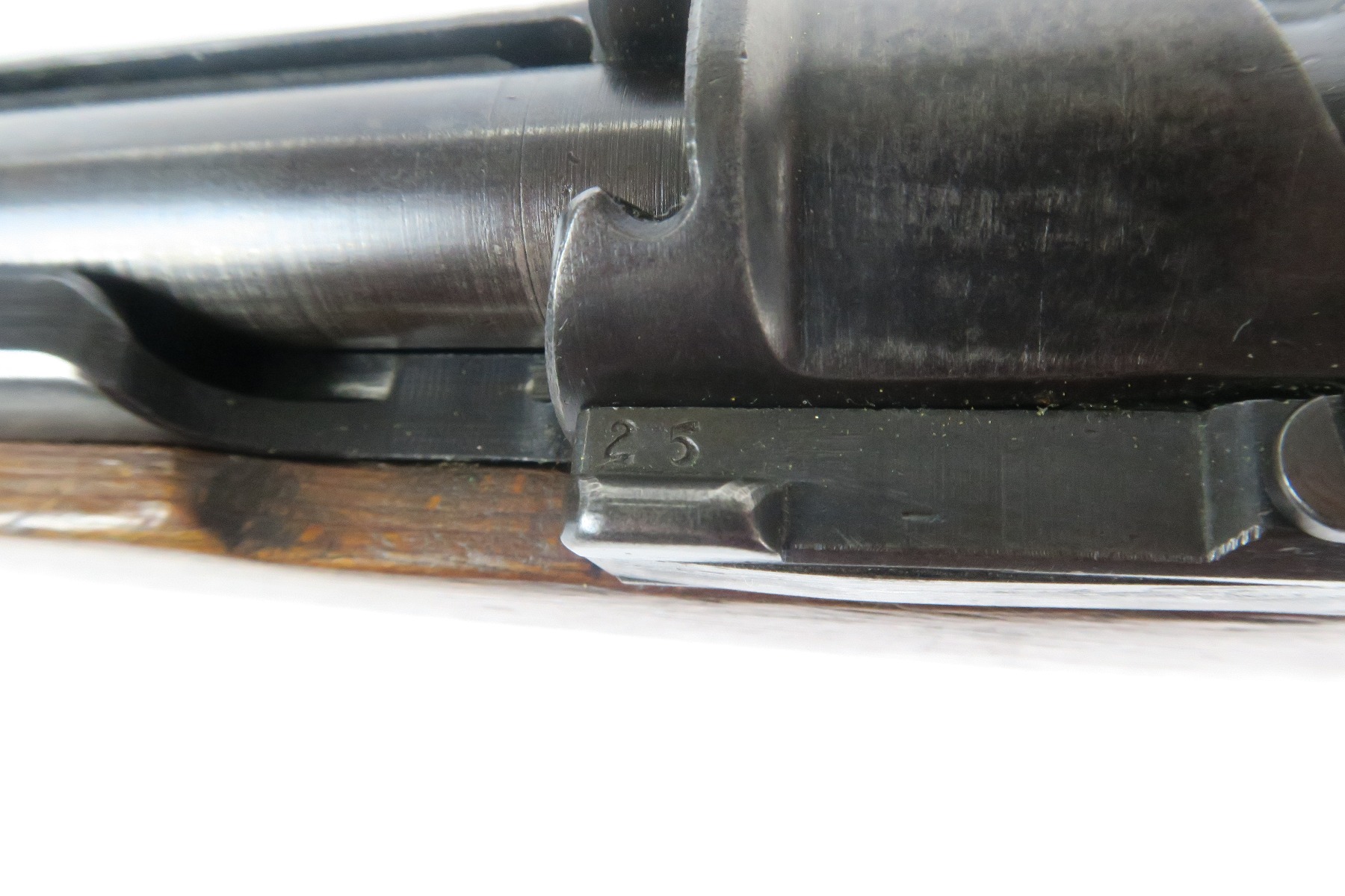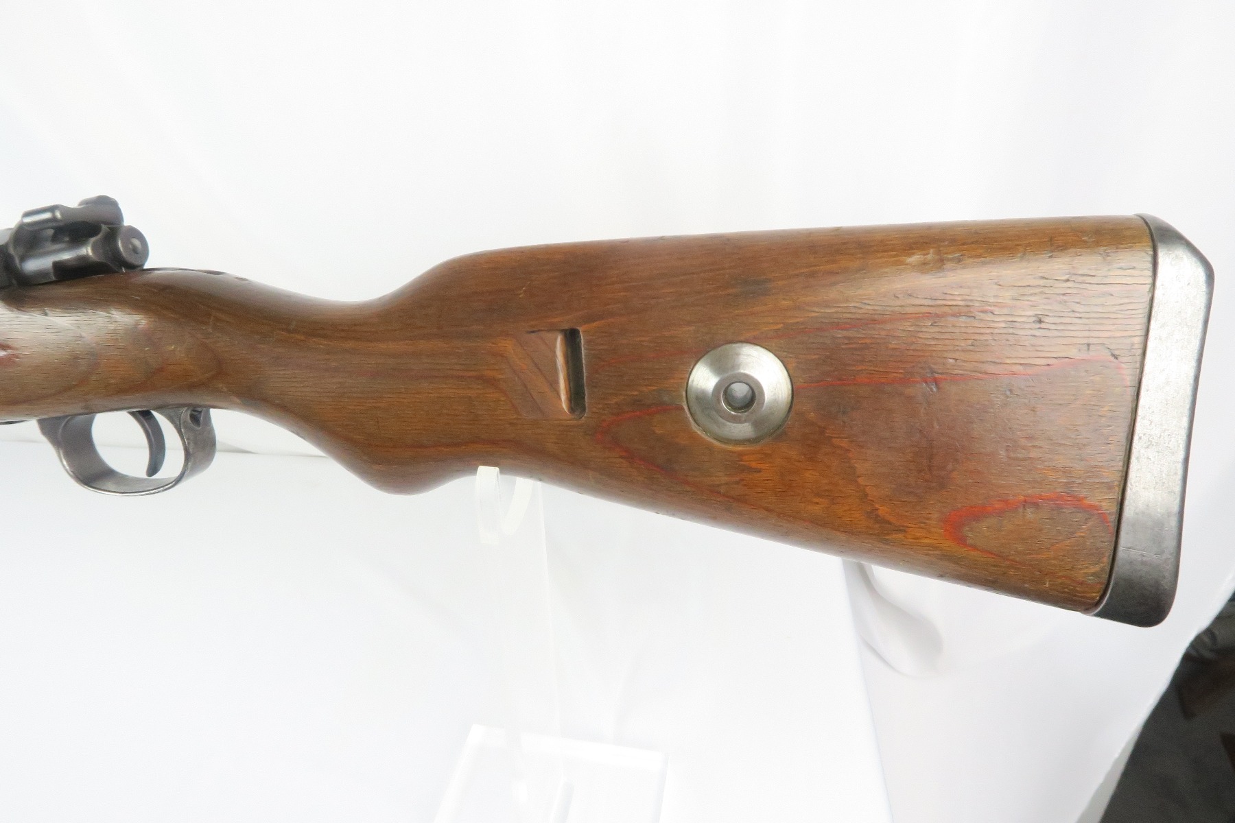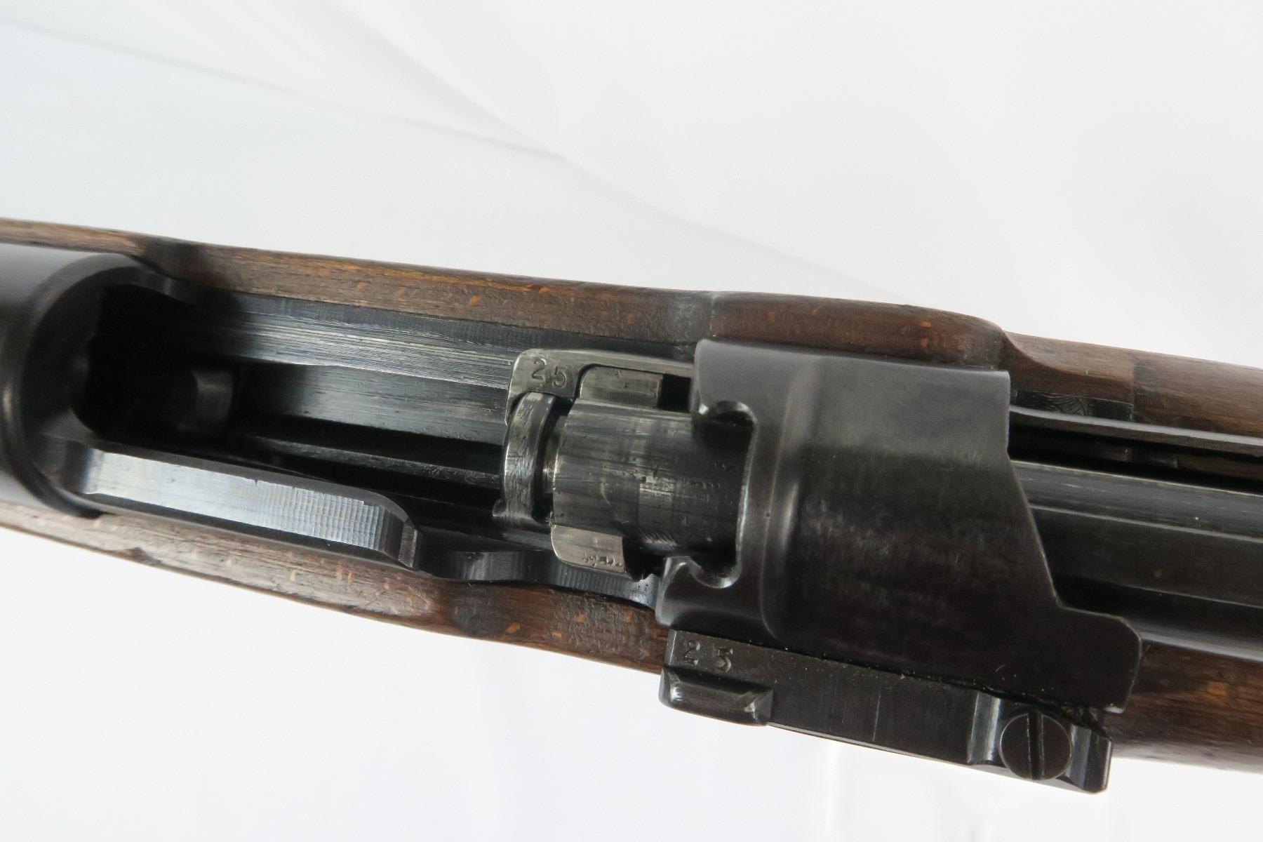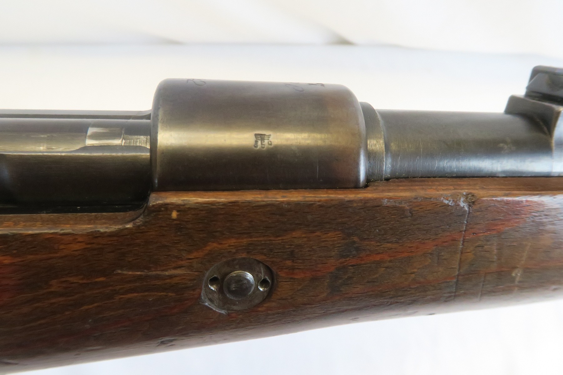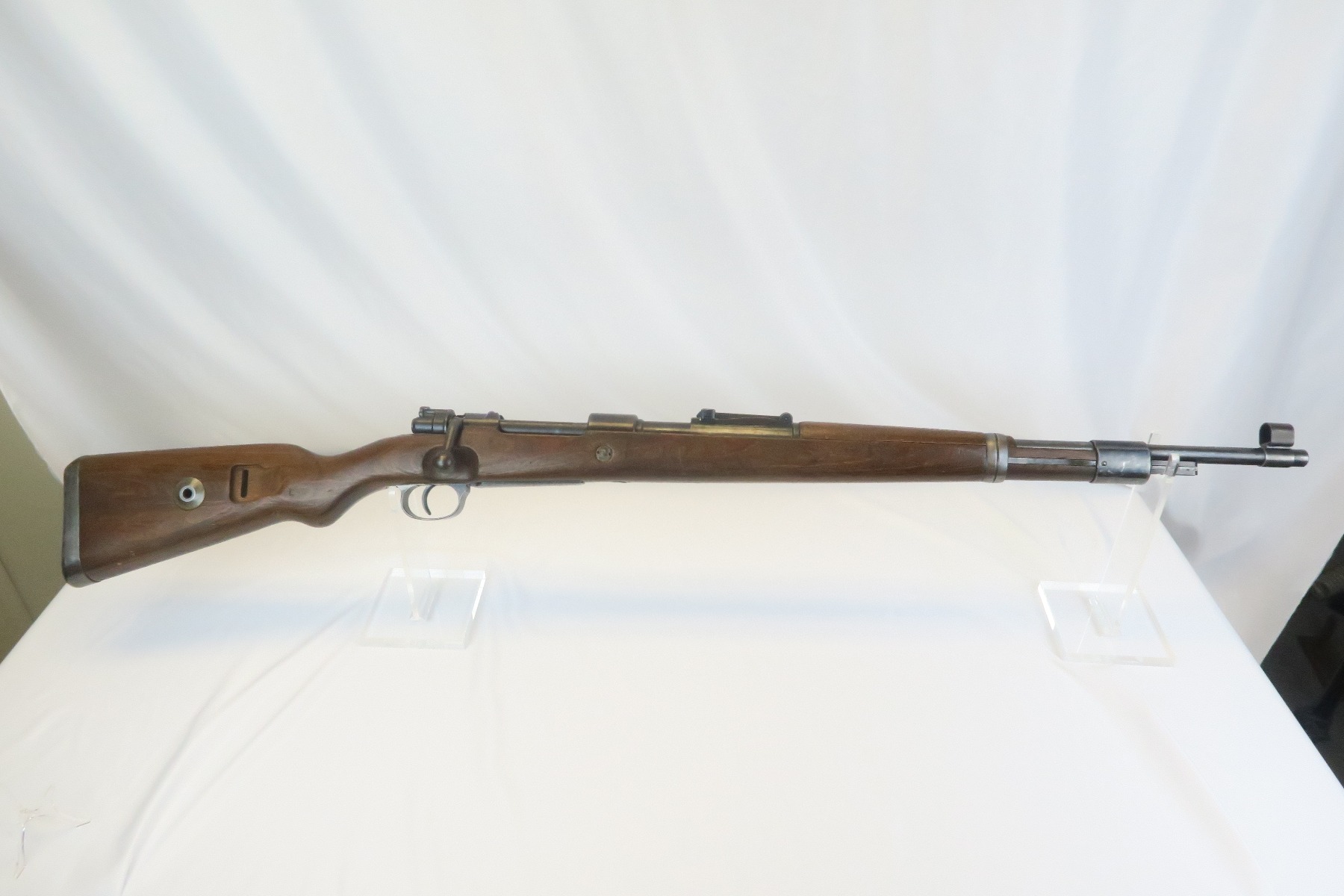 12/29/17 – This is an original WW2 production “CE” K98 Rifle. The receiver is marked “CE” which is a J.P. Sauer & Sohn manufacturing code. The rifle receiver is dated 42, and serial numbered 8325m. The rifle is all matching except for the barrel band and stock. The bolt, receiver, rear sight, and floor plate are all matching numbed. The butt plate is waffen proofed with a “bpr” code. The wood stock is serial numbered 6139 and “P” proofed. The wood is in great condition with a nice reddish striping throughout the wood. The wood has no cracks or chips. The metal has some wear and there is a significant amount of bluing loss, but there is no significant rust or pitting to note. The bore has strong rifling but there appears to be patina/residue within the rifling and throughout the bore, which leaves us with a rating of about 6 or 7 out of 10. Priced to sell based on condition, guaranteed all original.