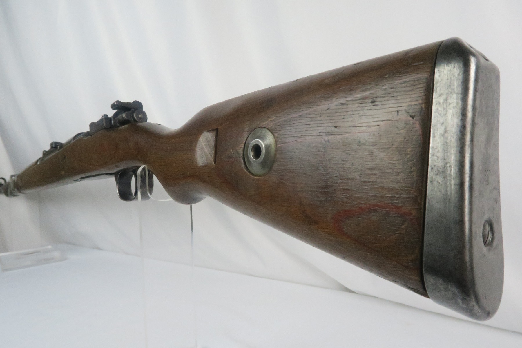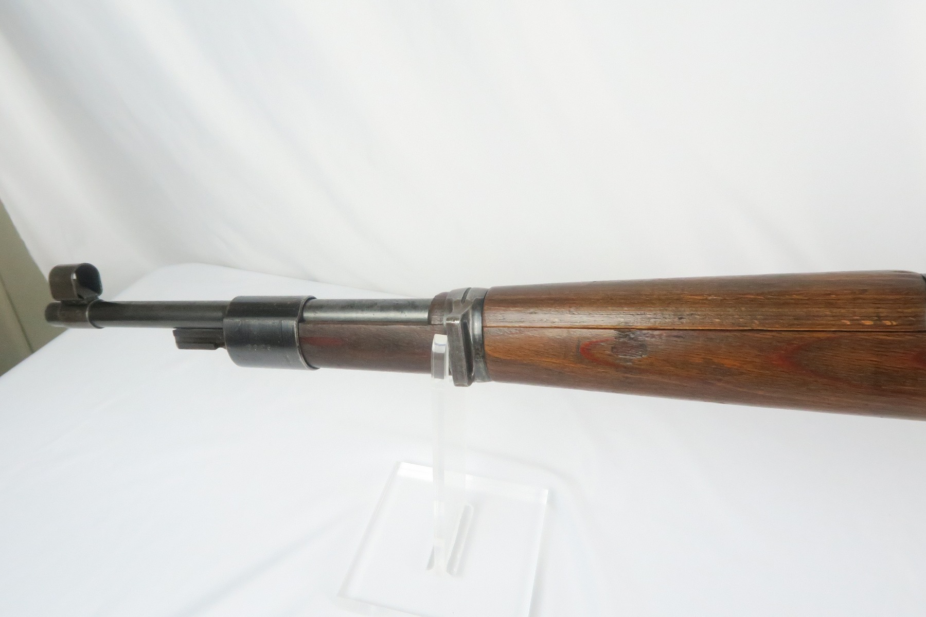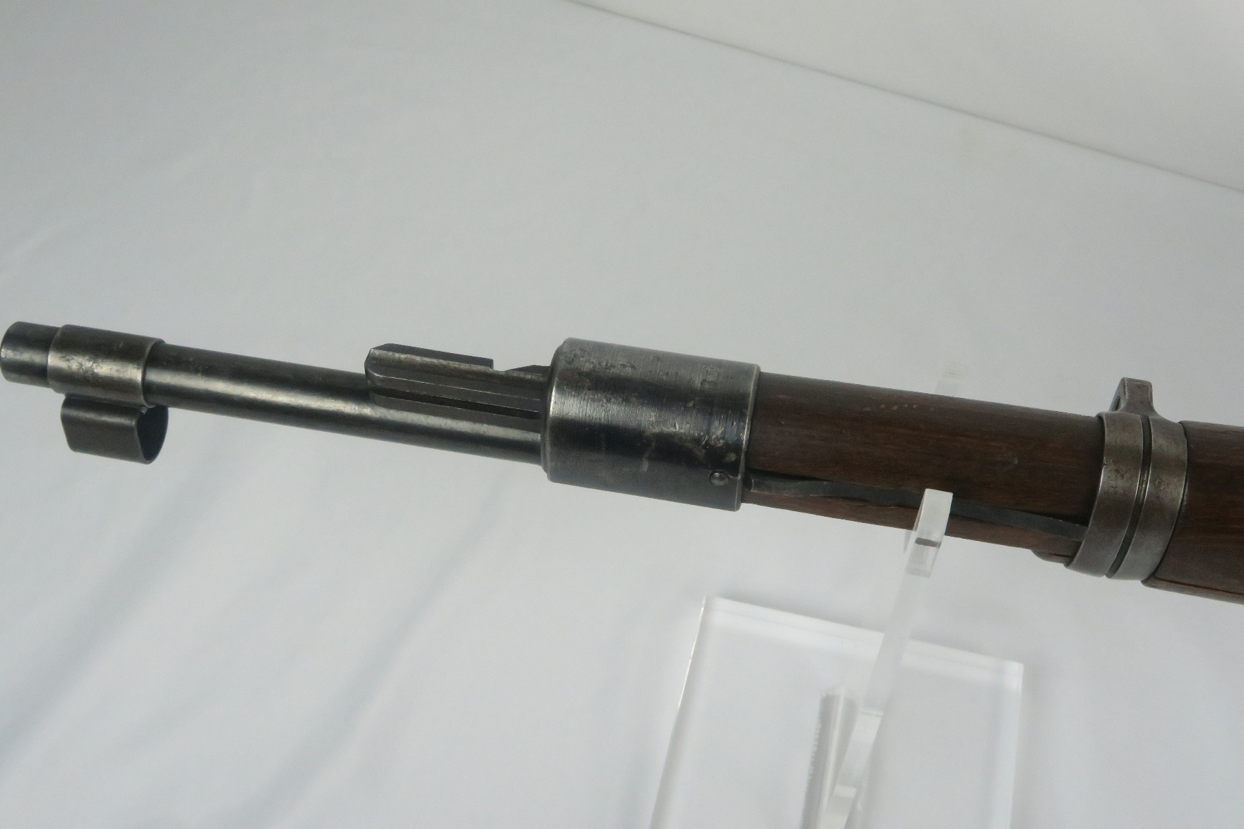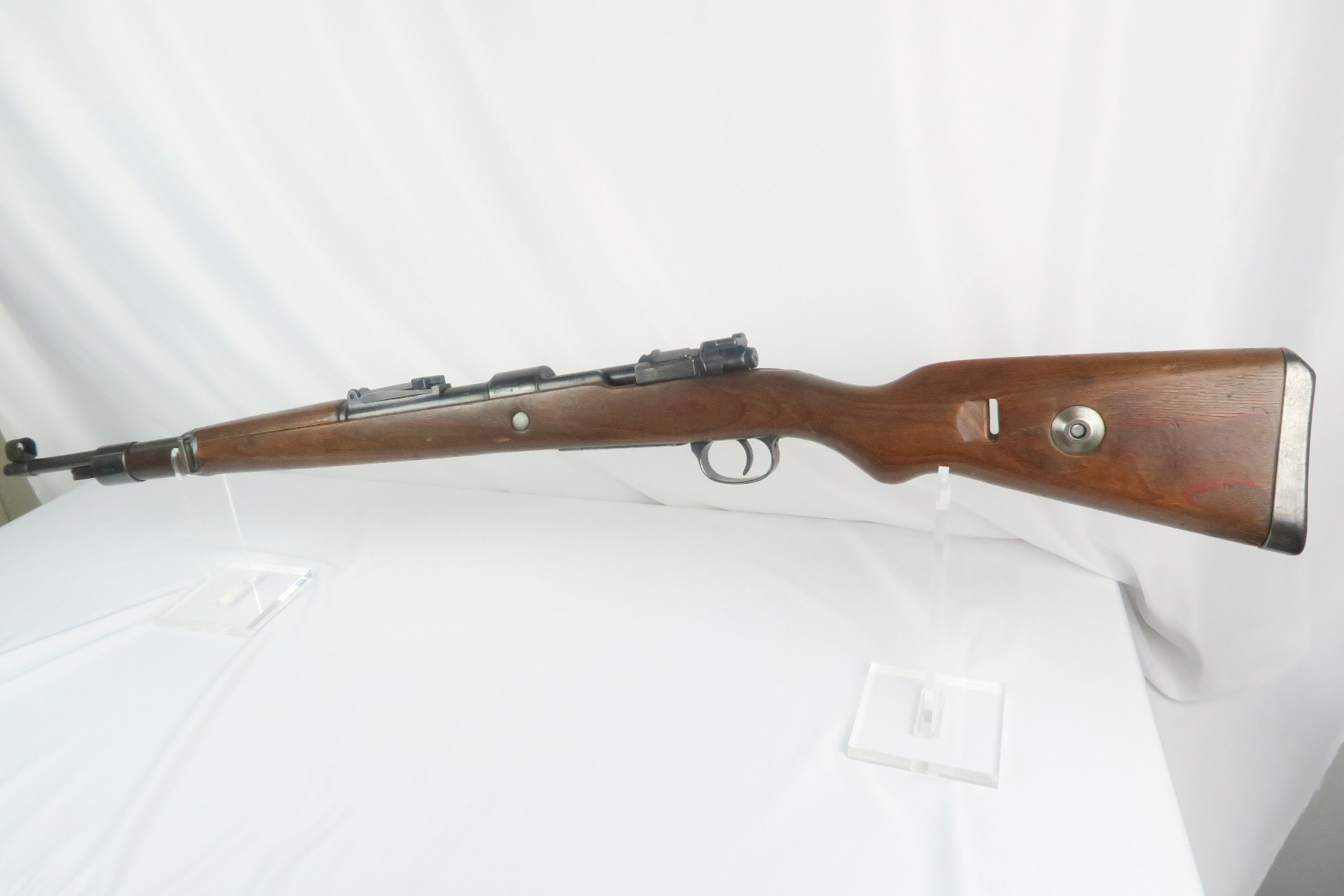 12/29/17 – This is an original WW2 production “CE” K98 Rifle. The receiver is marked “CE” which is a J.P. Sauer & Sohn manufacturing code. The rifle receiver is dated 42, and serial numbered 8325m. The rifle is all matching except for the barrel band and stock. The bolt, receiver, rear sight, and floor plate are all matching numbed. The butt plate is waffen proofed with a “bpr” code. The wood stock is serial numbered 6139 and “P” proofed. The wood is in great condition with a nice reddish striping throughout the wood. The wood has no cracks or chips. The metal has some wear and there is a significant amount of bluing loss, but there is no significant rust or pitting to note. The bore has strong rifling but there appears to be patina/residue within the rifling and throughout the bore, which leaves us with a rating of about 6 or 7 out of 10. Priced to sell based on condition, guaranteed all original.