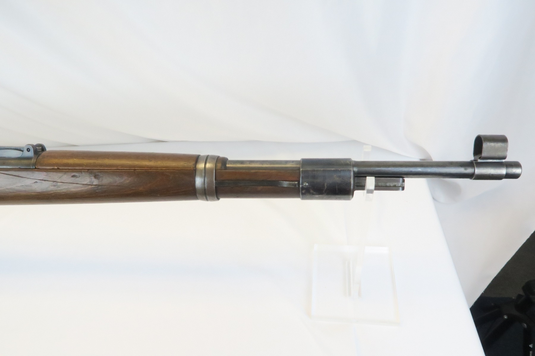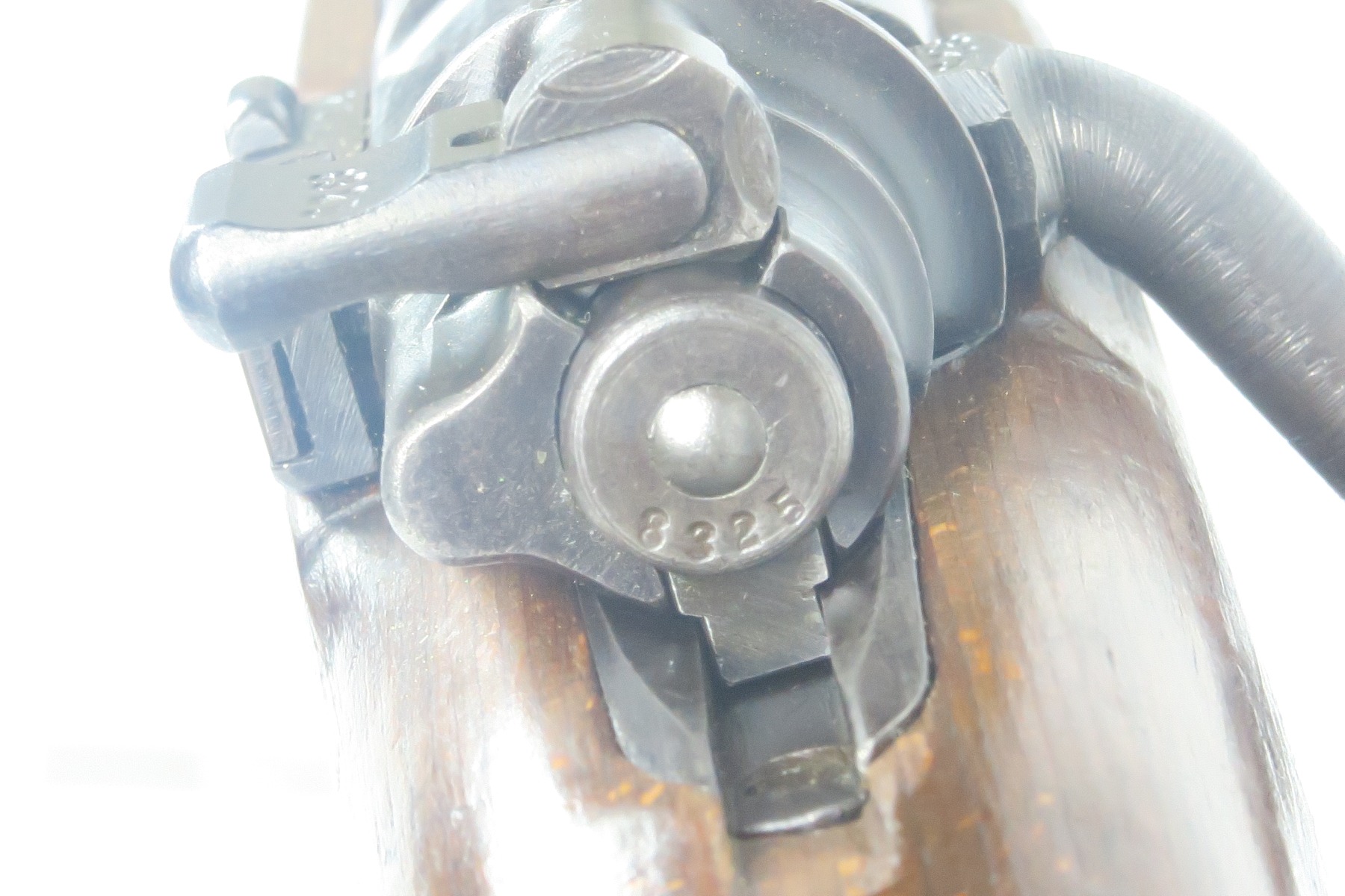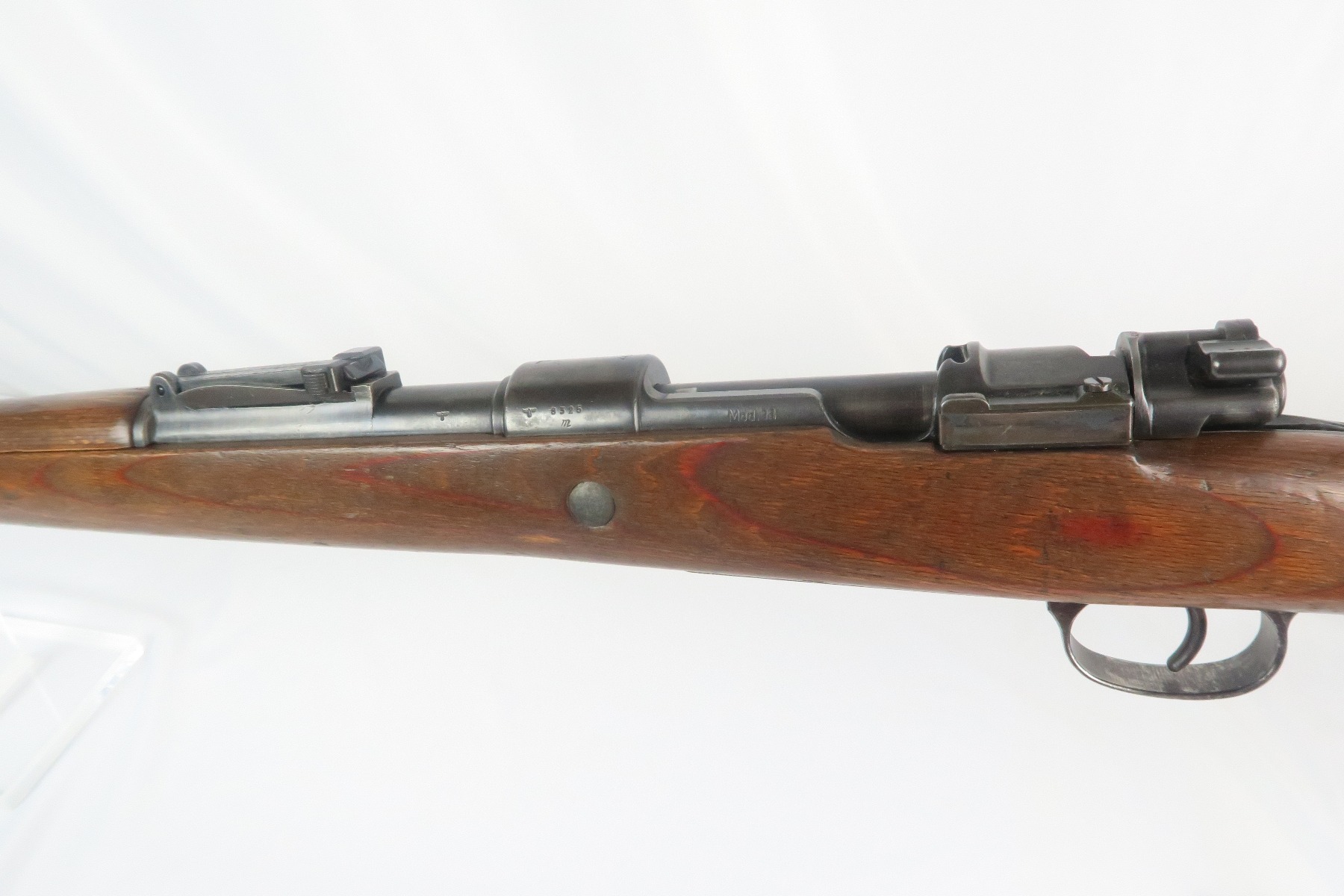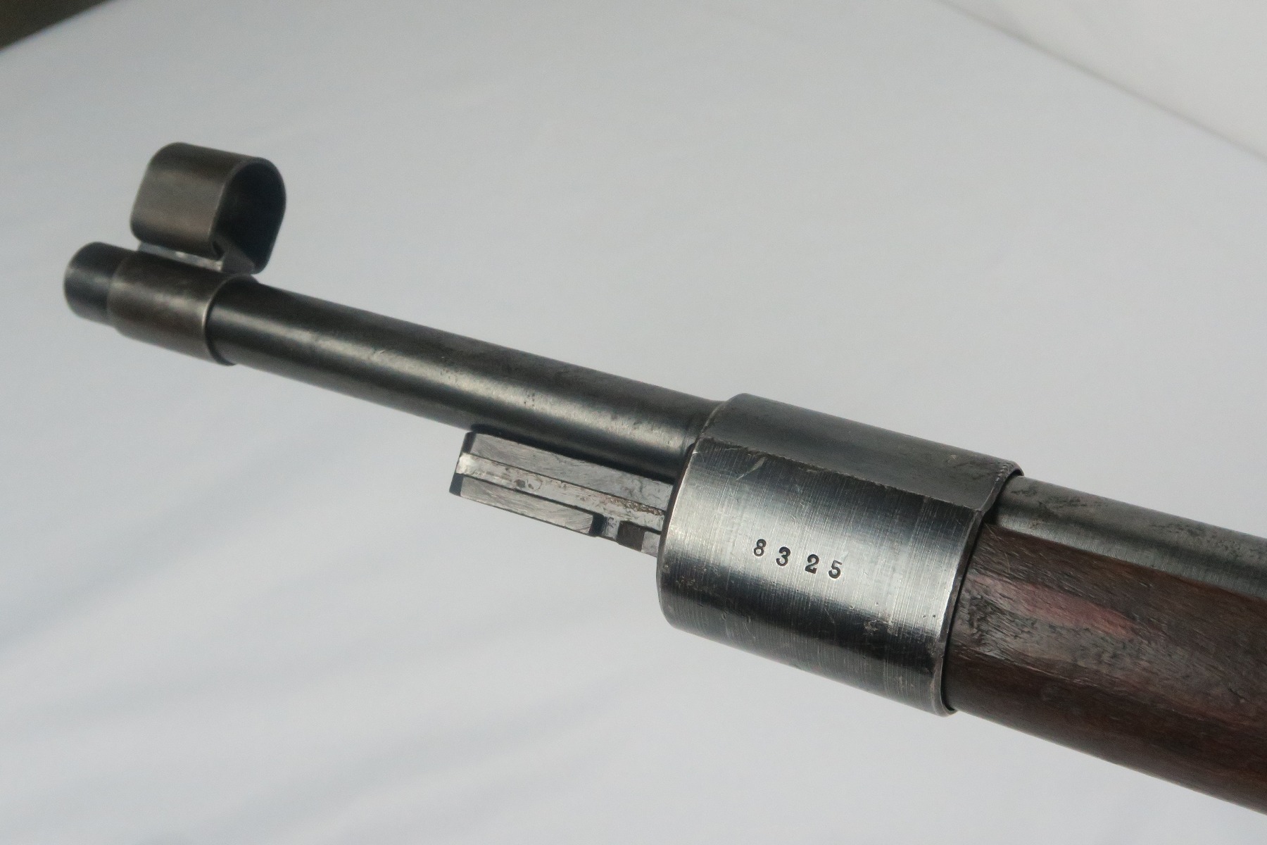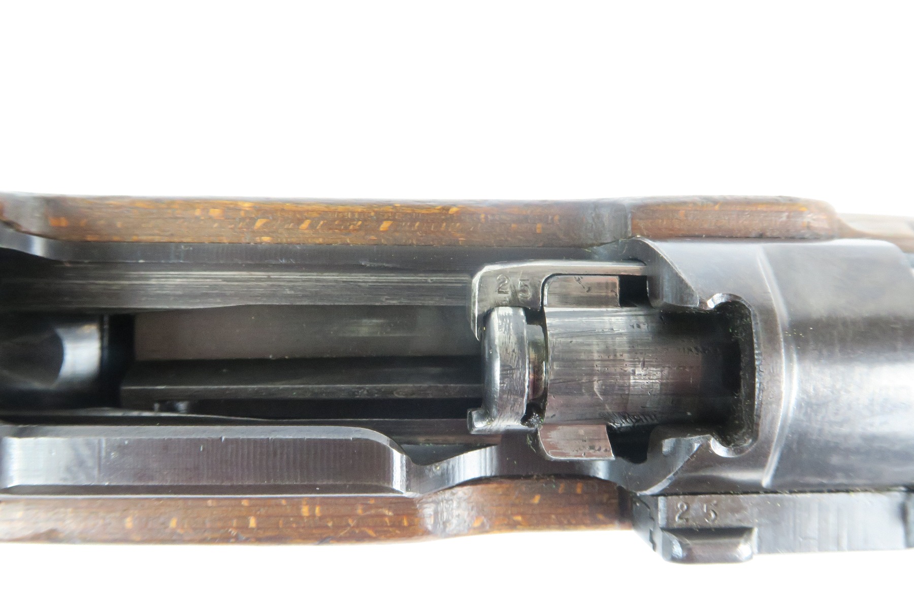 12/29/17 – This is an original WW2 production “CE” K98 Rifle. The receiver is marked “CE” which is a J.P. Sauer & Sohn manufacturing code. The rifle receiver is dated 42, and serial numbered 8325m. The rifle is all matching except for the barrel band and stock. The bolt, receiver, rear sight, and floor plate are all matching numbed. The butt plate is waffen proofed with a “bpr” code. The wood stock is serial numbered 6139 and “P” proofed. The wood is in great condition with a nice reddish striping throughout the wood. The wood has no cracks or chips. The metal has some wear and there is a significant amount of bluing loss, but there is no significant rust or pitting to note. The bore has strong rifling but there appears to be patina/residue within the rifling and throughout the bore, which leaves us with a rating of about 6 or 7 out of 10. Priced to sell based on condition, guaranteed all original.