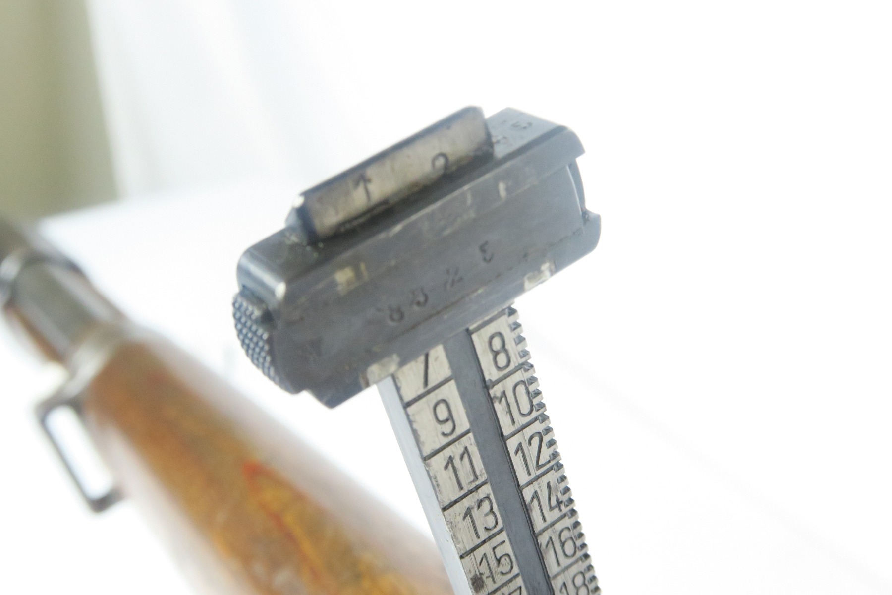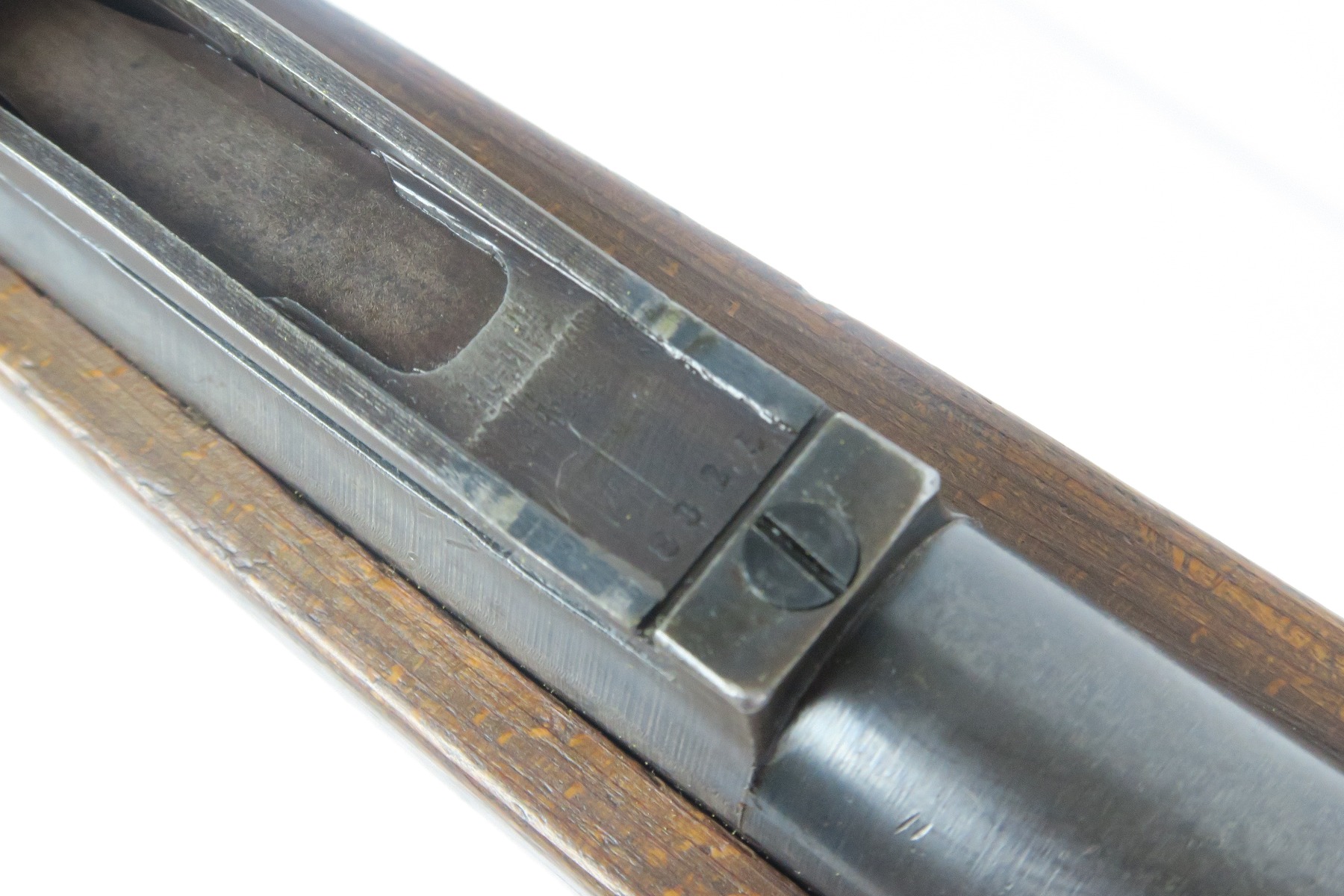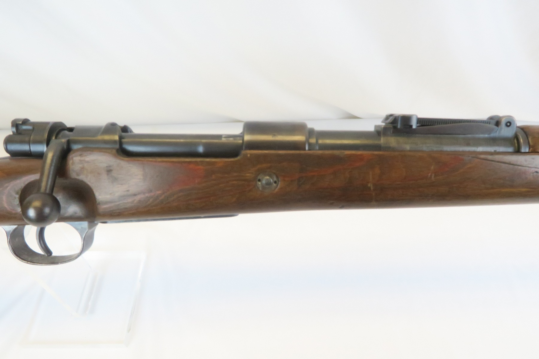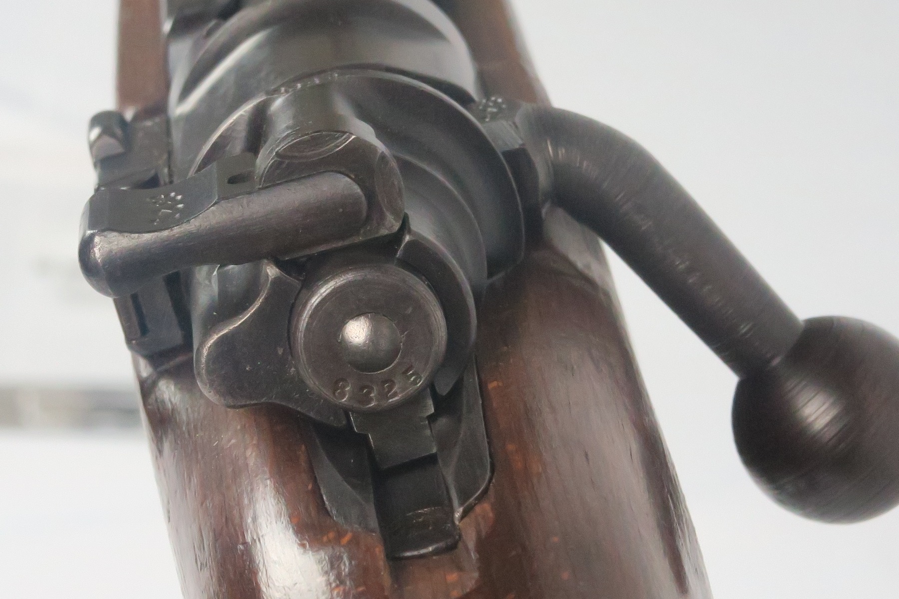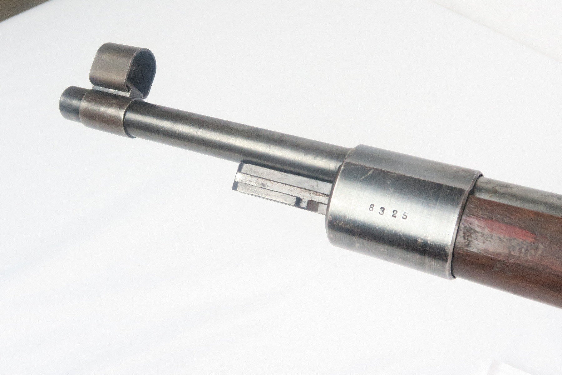 12/29/17 – This is an original WW2 production “CE” K98 Rifle. The receiver is marked “CE” which is a J.P. Sauer & Sohn manufacturing code. The rifle receiver is dated 42, and serial numbered 8325m. The rifle is all matching except for the barrel band and stock. The bolt, receiver, rear sight, and floor plate are all matching numbed. The butt plate is waffen proofed with a “bpr” code. The wood stock is serial numbered 6139 and “P” proofed. The wood is in great condition with a nice reddish striping throughout the wood. The wood has no cracks or chips. The metal has some wear and there is a significant amount of bluing loss, but there is no significant rust or pitting to note. The bore has strong rifling but there appears to be patina/residue within the rifling and throughout the bore, which leaves us with a rating of about 6 or 7 out of 10. Priced to sell based on condition, guaranteed all original.