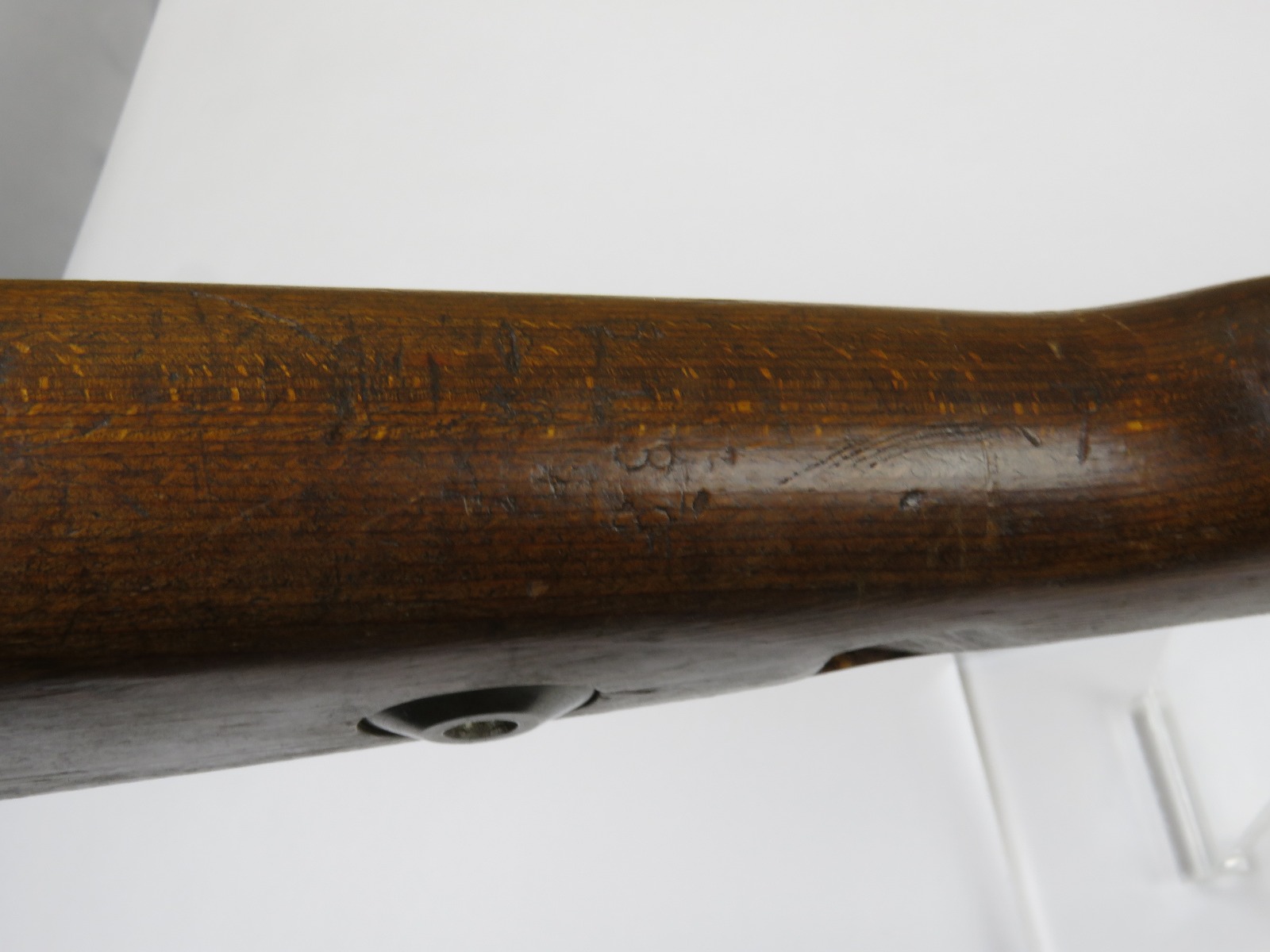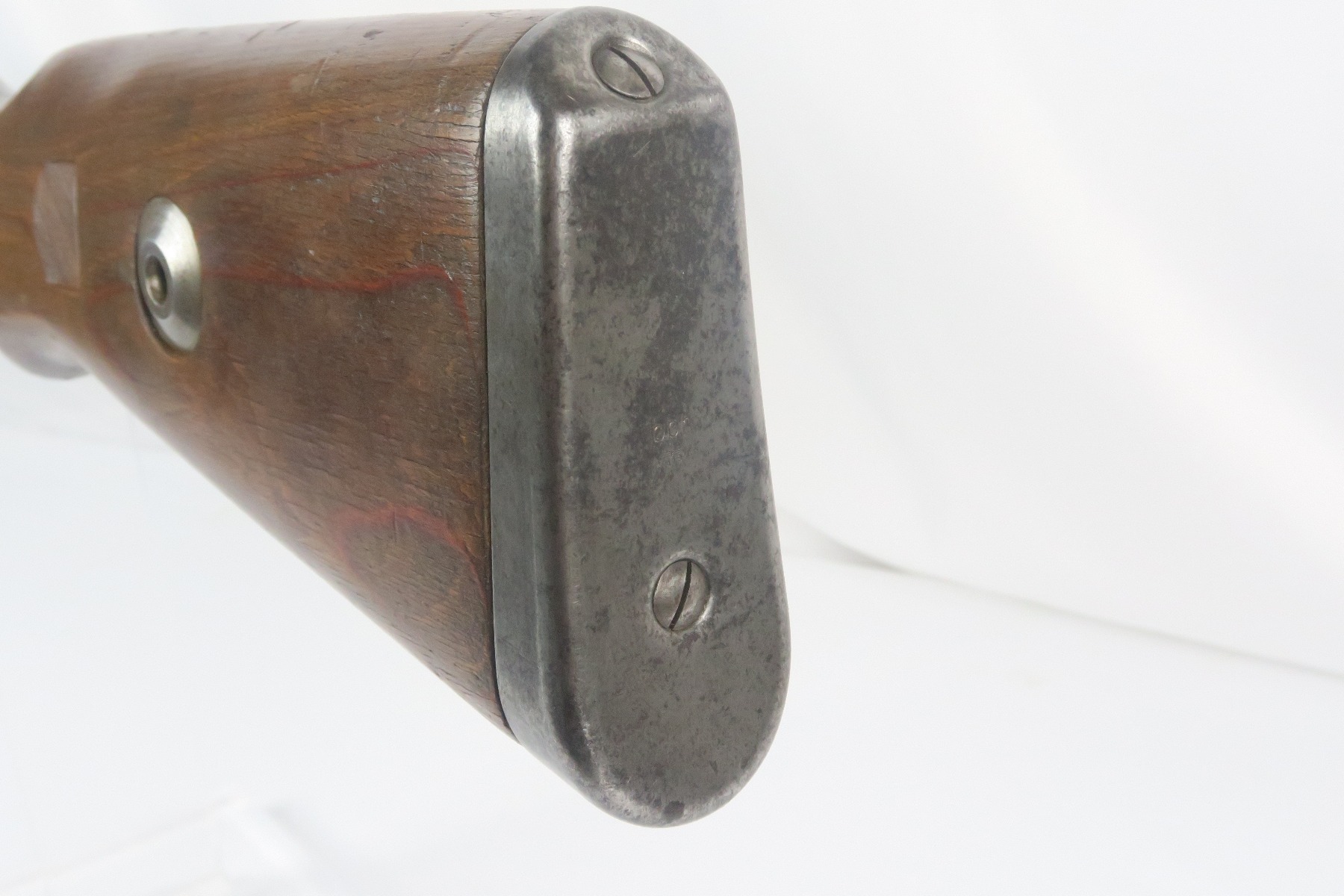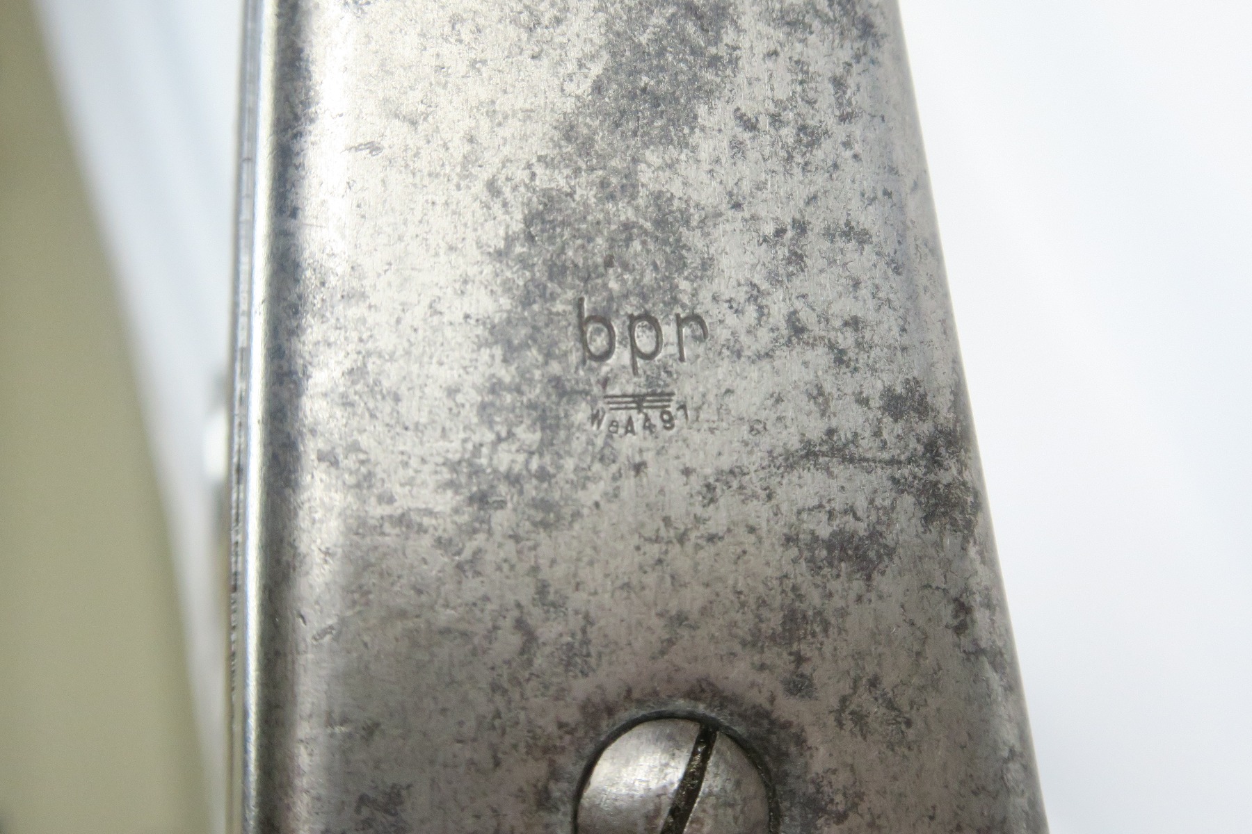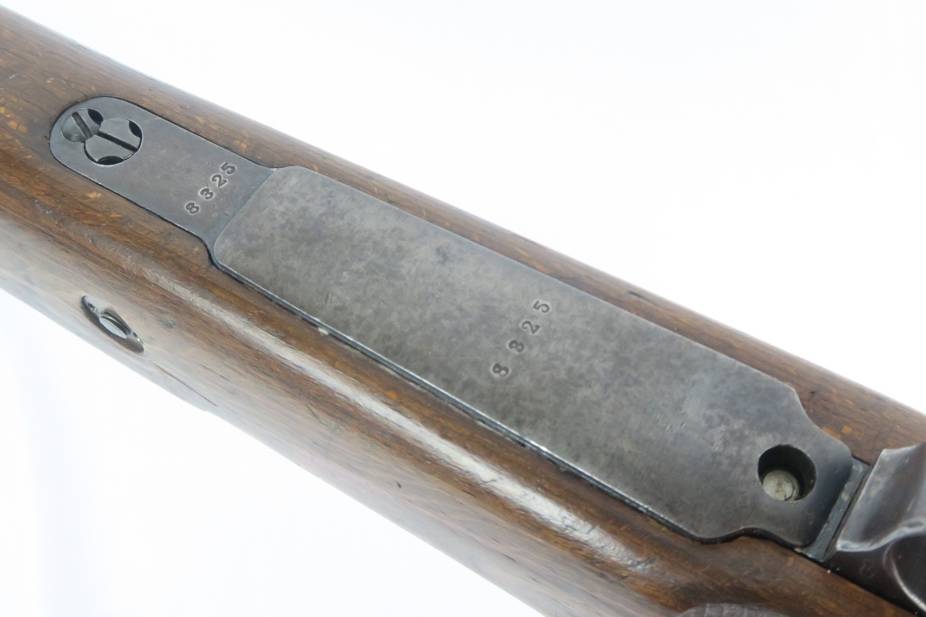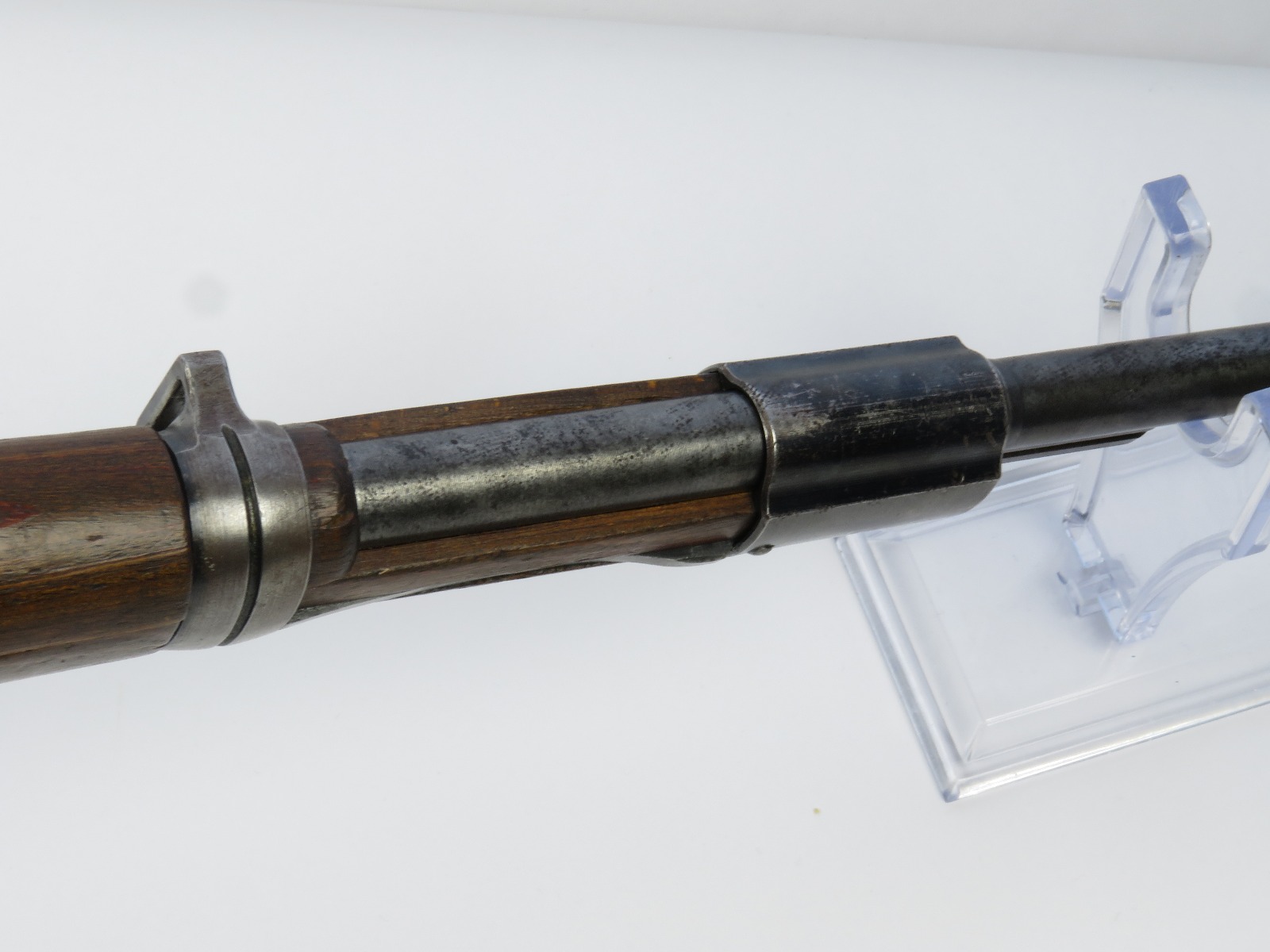 12/29/17 – This is an original WW2 production “CE” K98 Rifle. The receiver is marked “CE” which is a J.P. Sauer & Sohn manufacturing code. The rifle receiver is dated 42, and serial numbered 8325m. The rifle is all matching except for the barrel band and stock. The bolt, receiver, rear sight, and floor plate are all matching numbed. The butt plate is waffen proofed with a “bpr” code. The wood stock is serial numbered 6139 and “P” proofed. The wood is in great condition with a nice reddish striping throughout the wood. The wood has no cracks or chips. The metal has some wear and there is a significant amount of bluing loss, but there is no significant rust or pitting to note. The bore has strong rifling but there appears to be patina/residue within the rifling and throughout the bore, which leaves us with a rating of about 6 or 7 out of 10. Priced to sell based on condition, guaranteed all original.