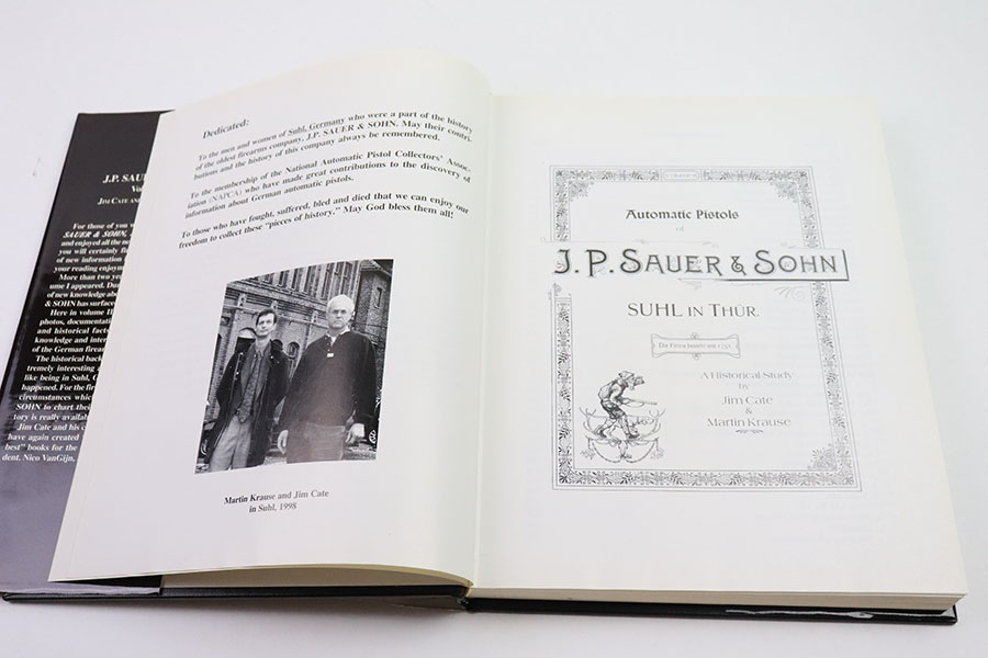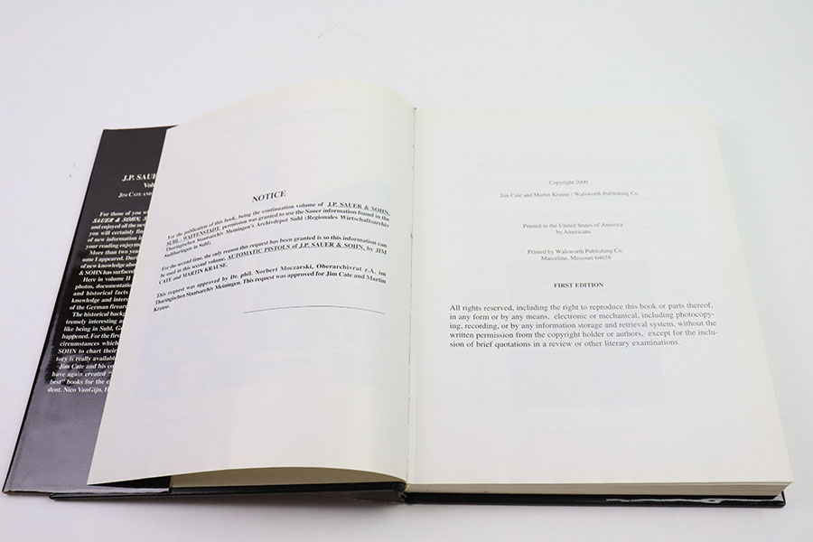 10/12/22 – This is an excellent, lightly-used copy of Jim Cate and Martin Krause’s “J.P. Sauer & Sohn Volume II”. The original dust cover is in great condition with minimal signs of handling wear throughout. The hard cover is in excellent condition with minimal damage to the corners. The page edges are mostly clean and the pages are overall well kept. The binding and spine are in excellent condition. There are 440 numbered pages and 438 pages of content. Overall, a great add to a library of an out of print resource book, helpful to Sauer collectors!