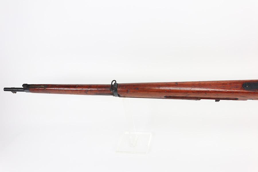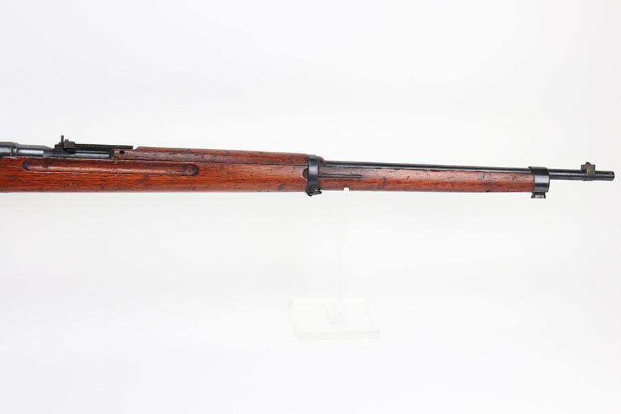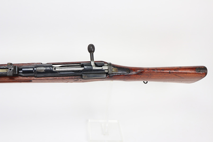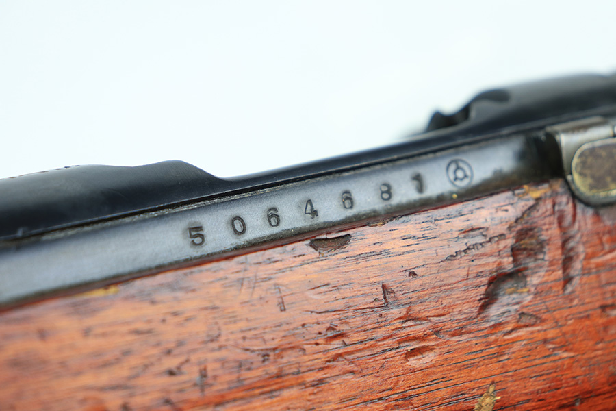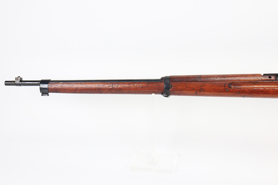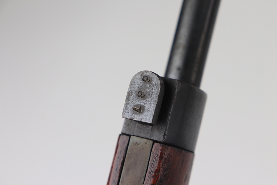 1/19/22 – This is an excellent example of an Arisaka Type 38 issued to the Japanese military during WW2. The gun is mostly matching, however, some of the parts are numbered “97”. These parts include the bolt release, firing pin, and underside of the bolt handle. The top of the bolt handle has a matching number. This part may have been re-numbered to match, but we can’t say for sure. The rear sight is mismatched. The Imperial mum stamp on the receiver has been ground. Overall, the gun is in excellent condition. There is very little actual finish loss. There are a few small spots of wear around the muzzle and on the front sight. Some very minor freckling on the barrel and floor plate. The stock is nice with small dings, dents, and bruises throughout. One more noticeable gouge on the right side of stock near the wrist. Mint bore.