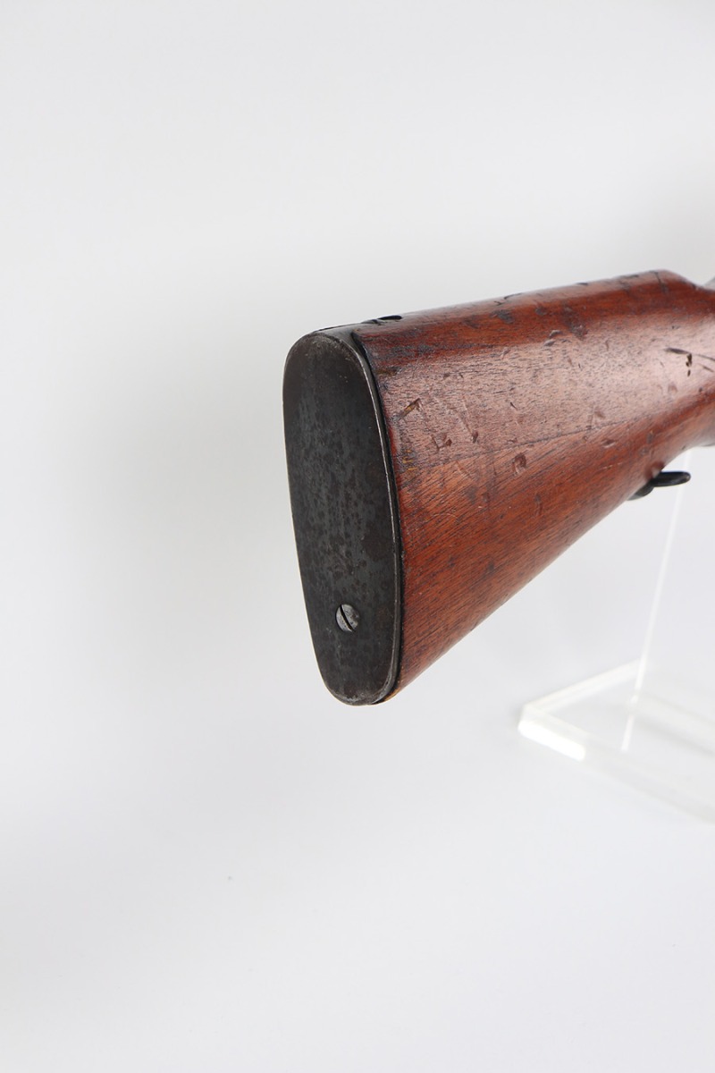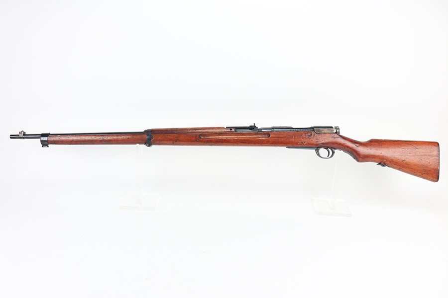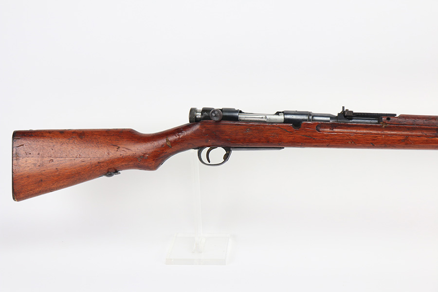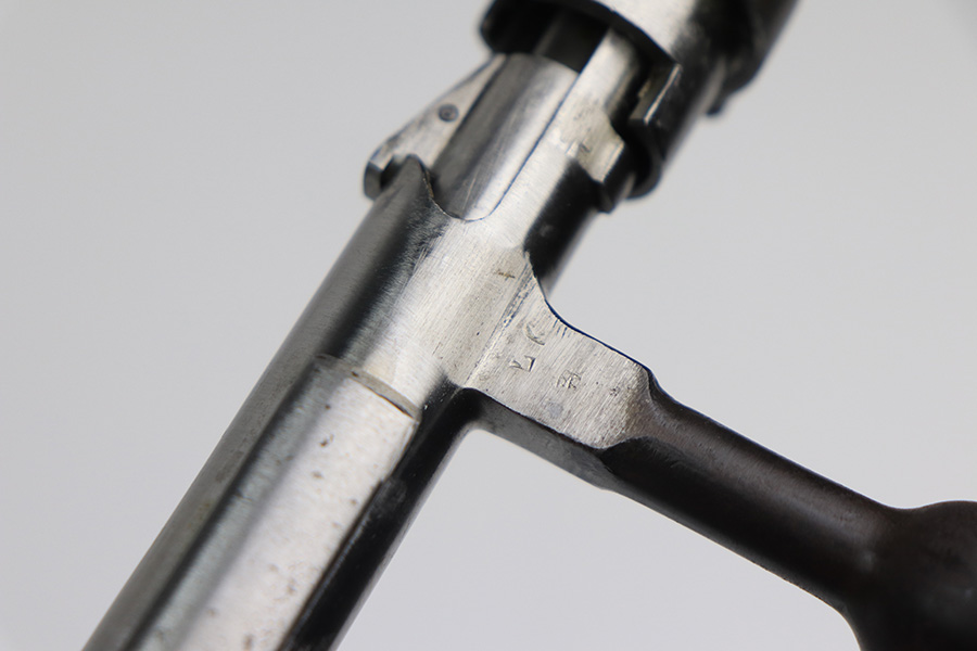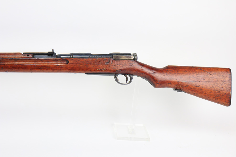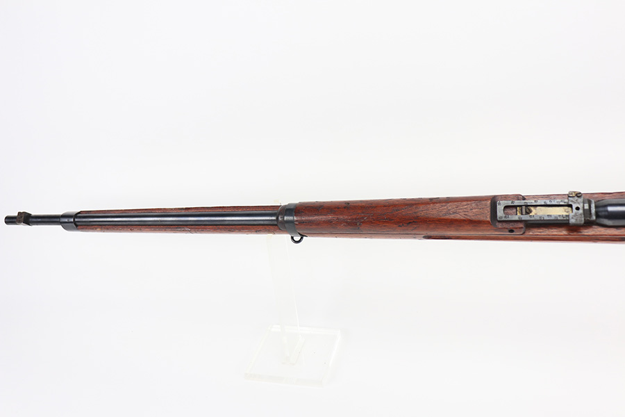 1/19/22 – This is an excellent example of an Arisaka Type 38 issued to the Japanese military during WW2. The gun is mostly matching, however, some of the parts are numbered “97”. These parts include the bolt release, firing pin, and underside of the bolt handle. The top of the bolt handle has a matching number. This part may have been re-numbered to match, but we can’t say for sure. The rear sight is mismatched. The Imperial mum stamp on the receiver has been ground. Overall, the gun is in excellent condition. There is very little actual finish loss. There are a few small spots of wear around the muzzle and on the front sight. Some very minor freckling on the barrel and floor plate. The stock is nice with small dings, dents, and bruises throughout. One more noticeable gouge on the right side of stock near the wrist. Mint bore.