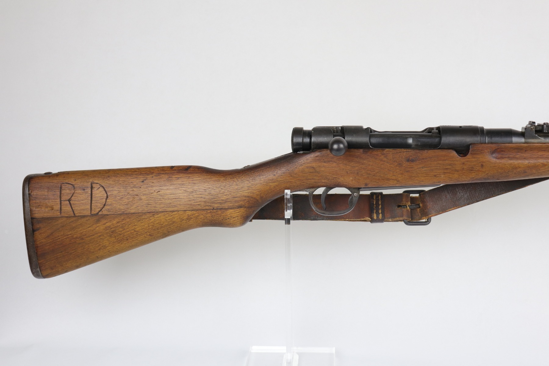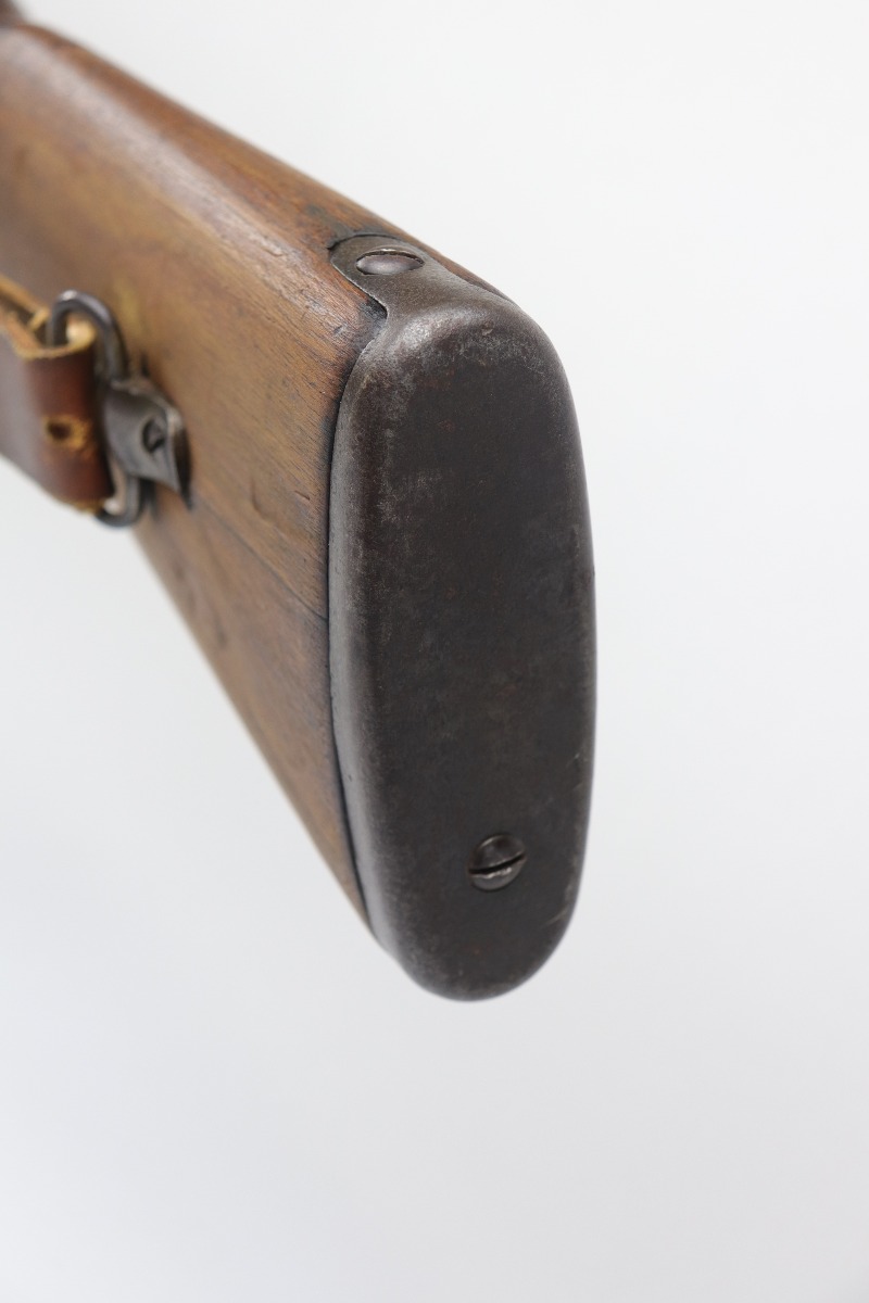 7/31/20 – This is a Japanese Arisaka Type 38 Cavalry Carbine Rifle, made during the WW2-era. It was manufactured in the Nagoya Arsenal. The mum stamp is completely in tact. This is one of the nicest examples we’ve offered as it relates to the condition of the metal. The gun has retained almost all of its original bluing. There are areas of very light pin-pricking here and there. The floor plate has visible brown patina. The parts are matching. The stock is in good condition but appears to have been lightly sanded. The initials “RD” were scratched into the right side of the butt stock. There is a very small crack on the right side, just in front of the bolt. It comes with a rare original rubberized canvas sling. The bore has decent rifling, but there is minor pitting in the grooves.