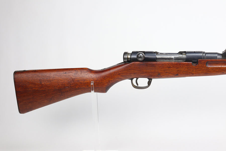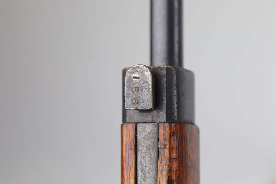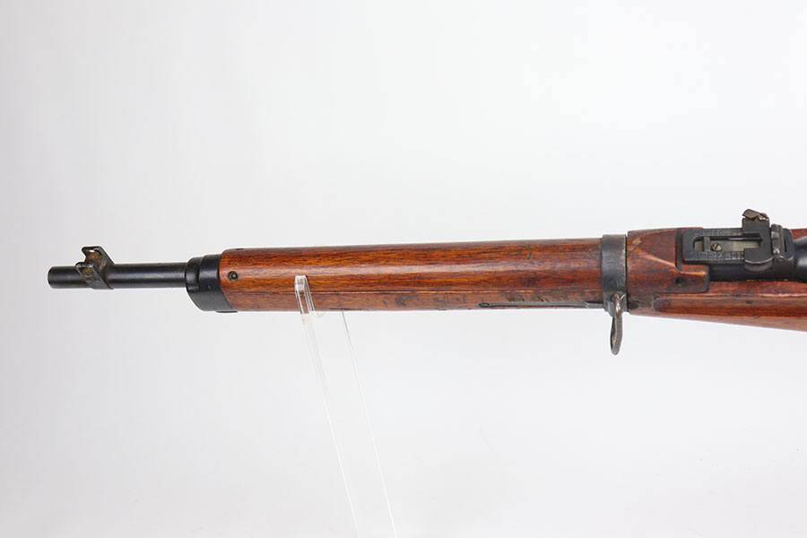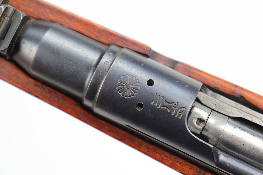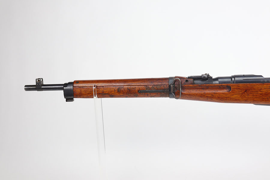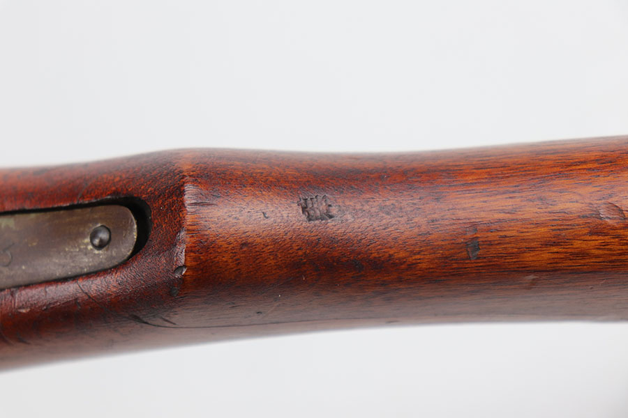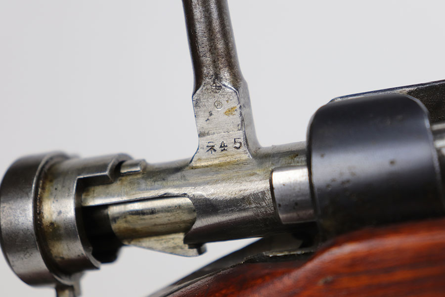 11/12/20 – This is a WW2-era Japanese Arisaka Type 38 bolt action rifle, chambered in 6.5x50mm. This particular gun was made in Manchuria at the Mukden Arsenal. The mum is fully intact. The gun is mostly matching, including the receiver, bolt and bayonet lug. The cocking knob and bolt release are mismatched. Overall, the gun is in very good condition but the disparity between the finish on the barrel/receiver and the trigger group leads us to believe it was arsenal refinished. The stock has various dings and chips but no structural issues. The bore has strong rifling but frost throughout and needs a thorough cleaning.