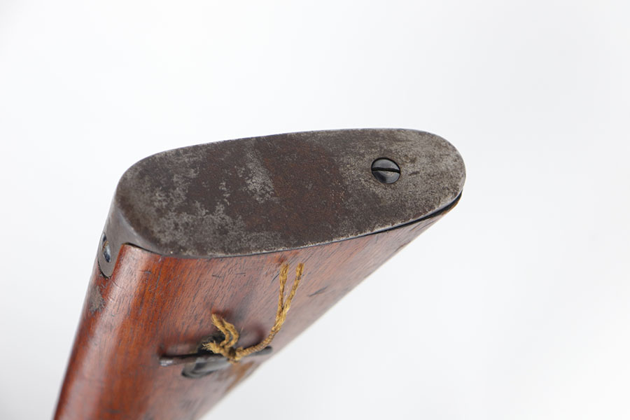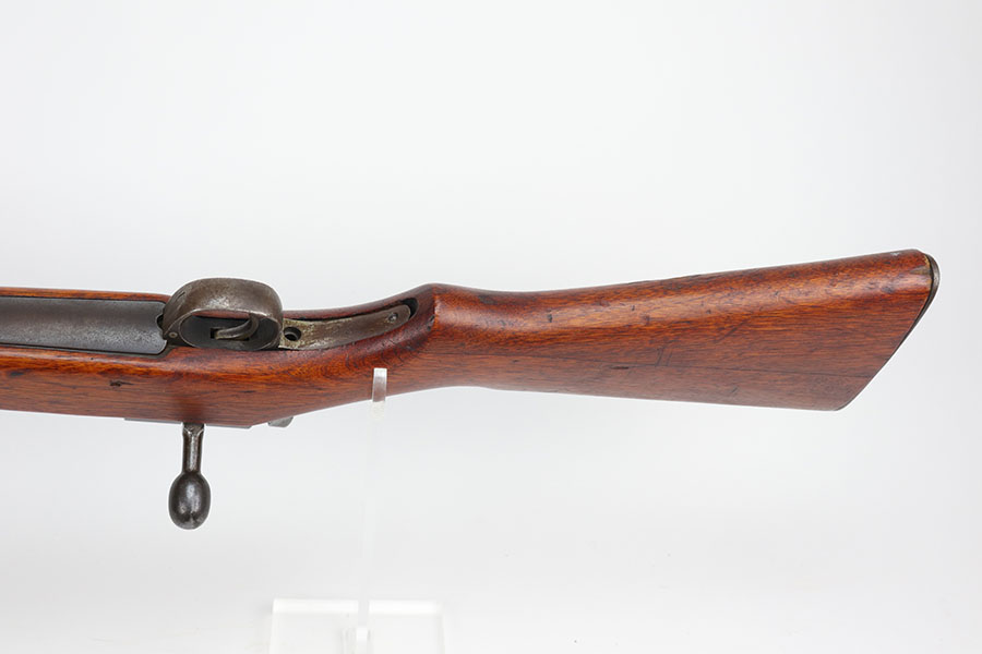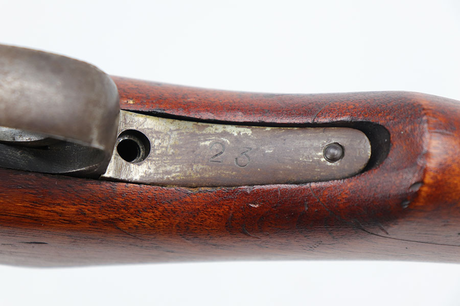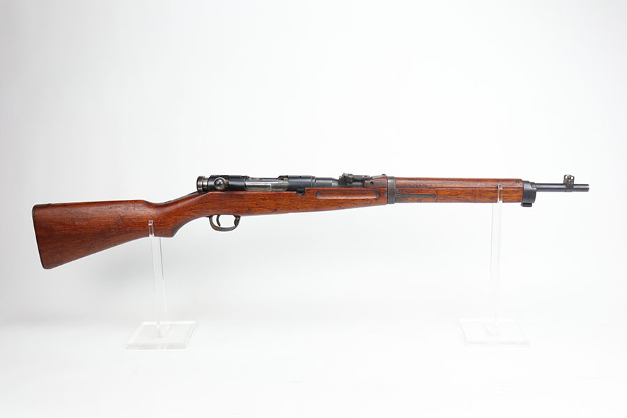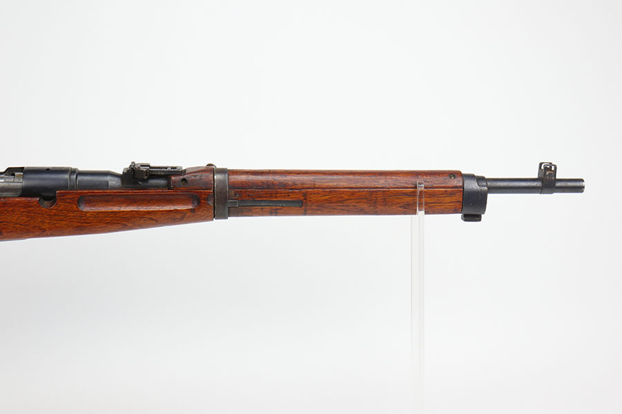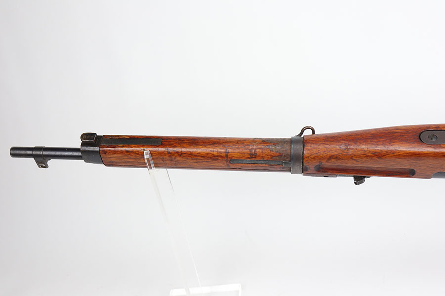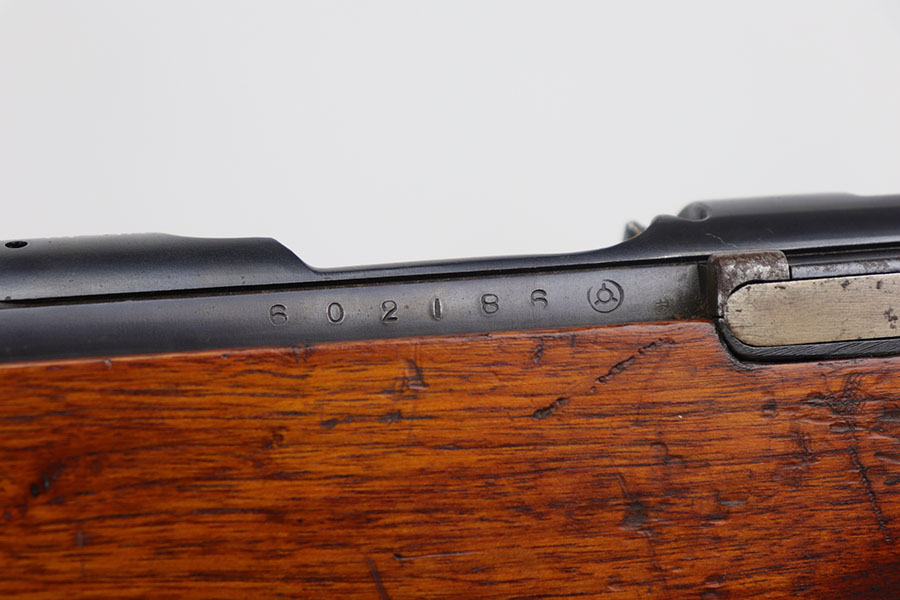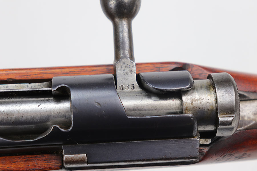 11/12/20 – This is a WW2-era Japanese Arisaka Type 38 bolt action rifle, chambered in 6.5x50mm. This particular gun was made in Manchuria at the Mukden Arsenal. The mum is fully intact. The gun is mostly matching, including the receiver, bolt and bayonet lug. The cocking knob and bolt release are mismatched. Overall, the gun is in very good condition but the disparity between the finish on the barrel/receiver and the trigger group leads us to believe it was arsenal refinished. The stock has various dings and chips but no structural issues. The bore has strong rifling but frost throughout and needs a thorough cleaning.