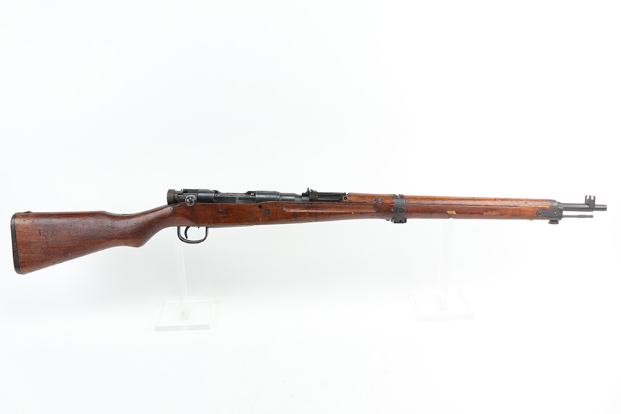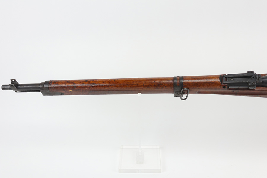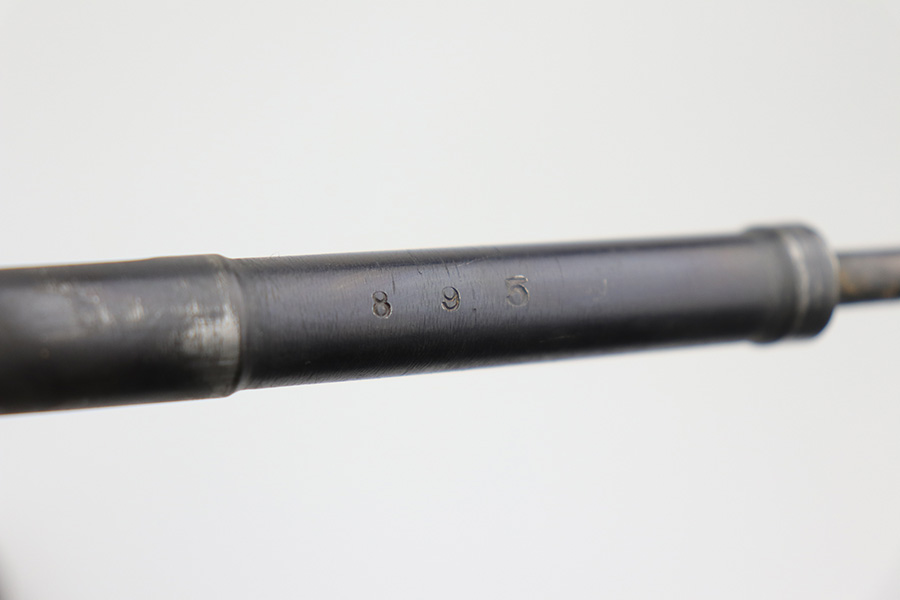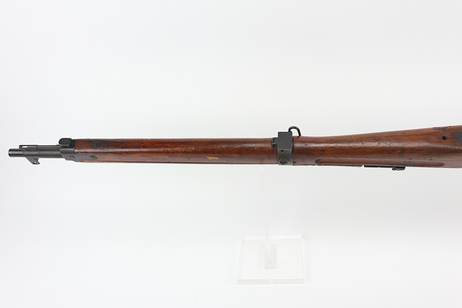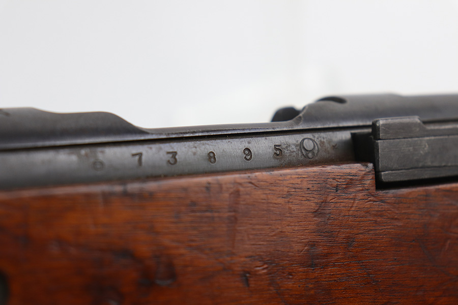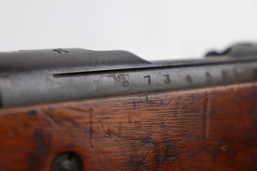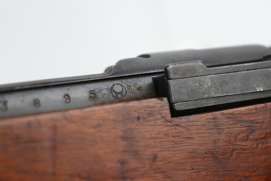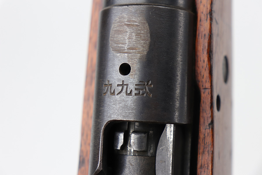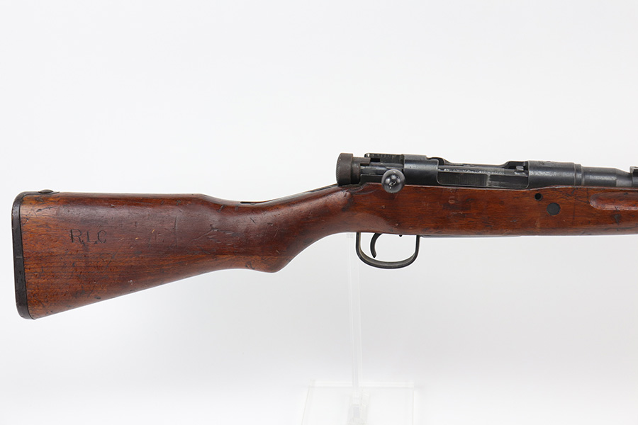 10/11/21 – This is a very nice example of an Arisaka Type 99 rifle issued to the Japanese military during WW2. The gun is completely matching, but unfortunately the mum stamp on the receiver has been ground off. It has retained most of its original bluing, but there is minor scratchy wear around the muzzle and on the barrel bands, thinning on the floor plate, and spotty oxidation throughout. The butt plate has heavy brown patina. There are some areas of very light surface rust. Tiny white paint dots on the bolt handle and at the top of the butt plate. The wood stock is intact with minor dings, dents, and scratches throughout. The initials “RLC” are scratched into the right side of the butt stock. The gun comes with an original cleaning rod. The bore is near-mint – shiny with strong rifling.