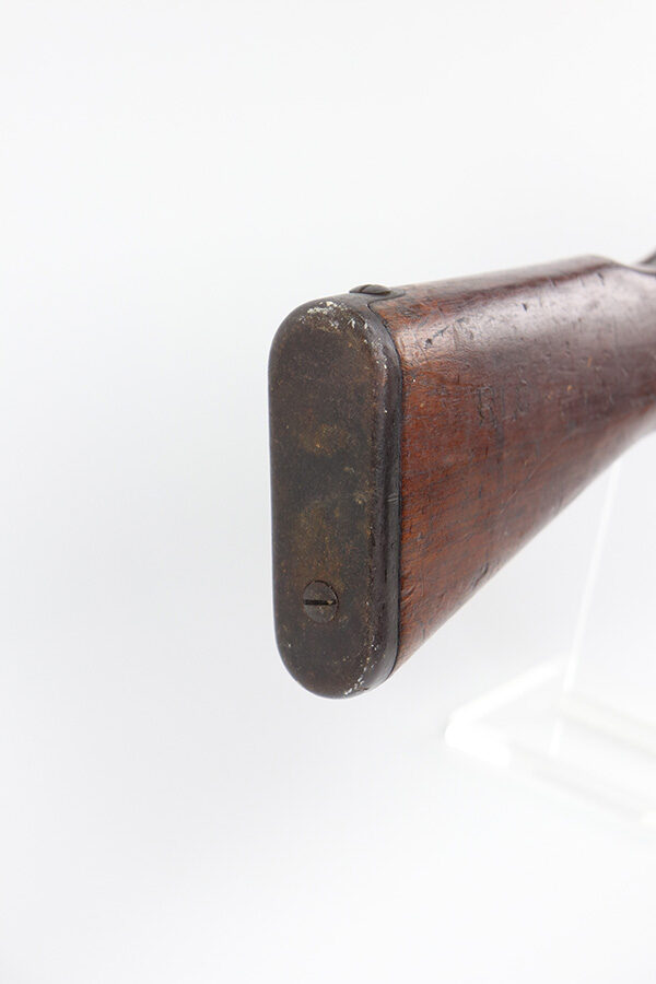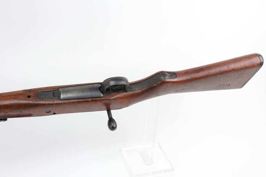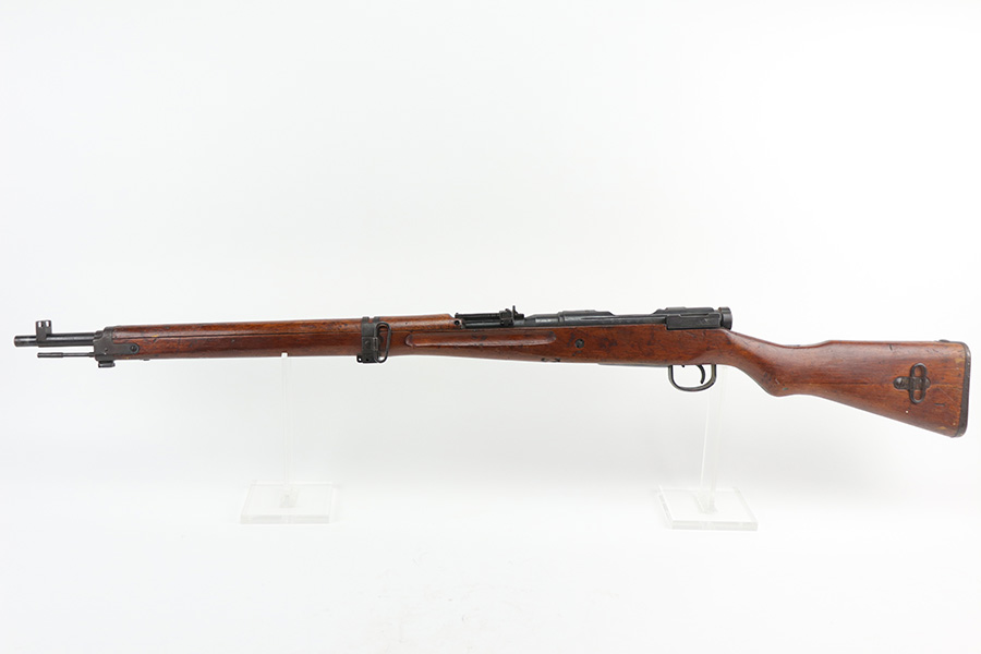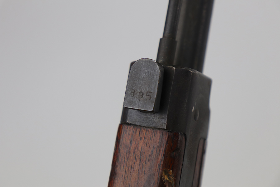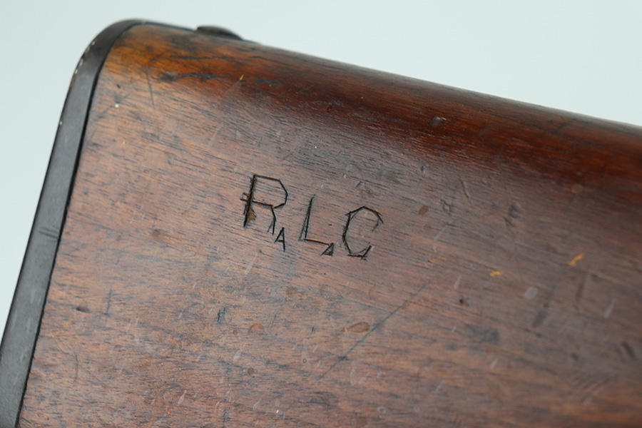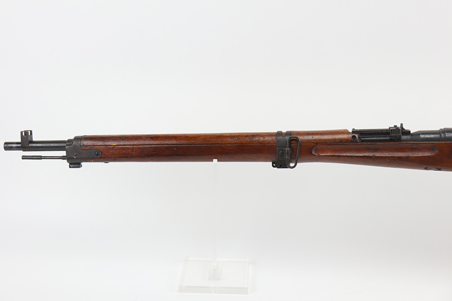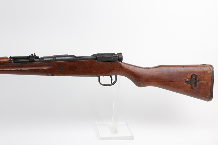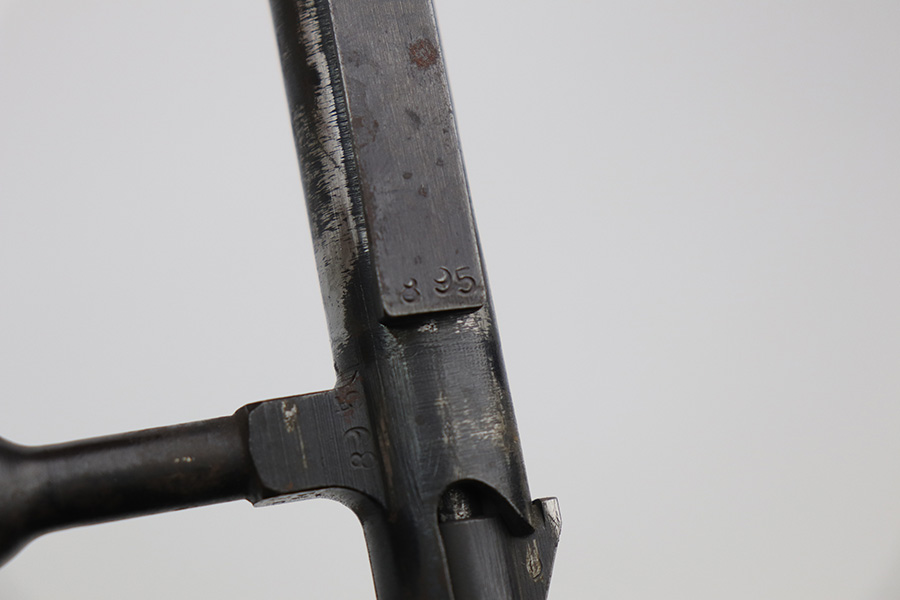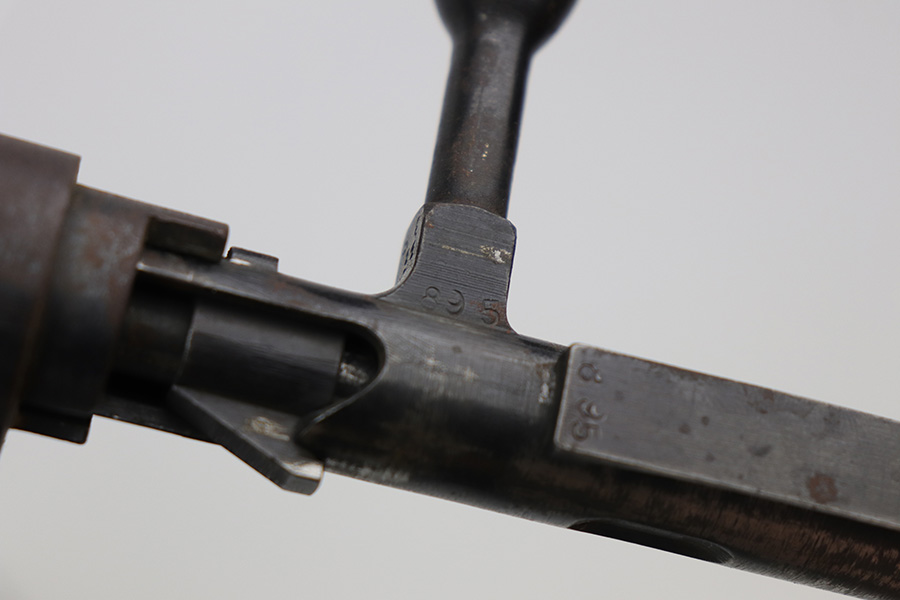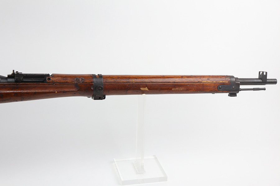 10/11/21 – This is a very nice example of an Arisaka Type 99 rifle issued to the Japanese military during WW2. The gun is completely matching, but unfortunately the mum stamp on the receiver has been ground off. It has retained most of its original bluing, but there is minor scratchy wear around the muzzle and on the barrel bands, thinning on the floor plate, and spotty oxidation throughout. The butt plate has heavy brown patina. There are some areas of very light surface rust. Tiny white paint dots on the bolt handle and at the top of the butt plate. The wood stock is intact with minor dings, dents, and scratches throughout. The initials “RLC” are scratched into the right side of the butt stock. The gun comes with an original cleaning rod. The bore is near-mint – shiny with strong rifling.