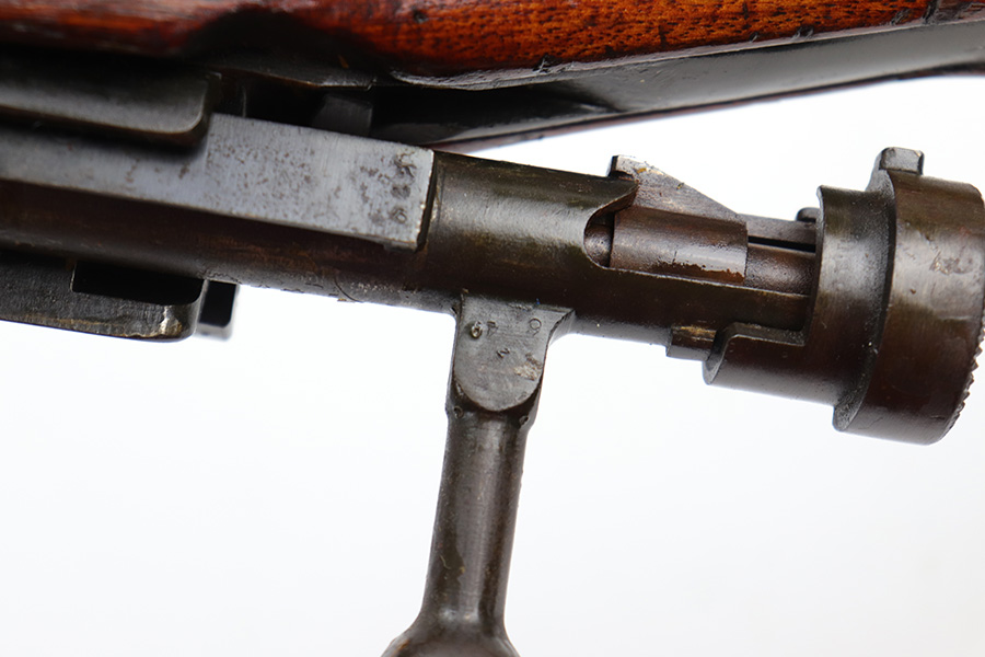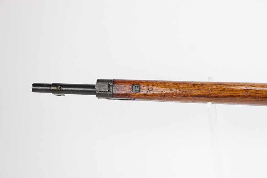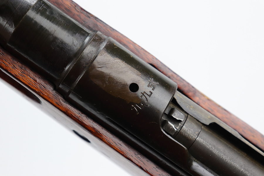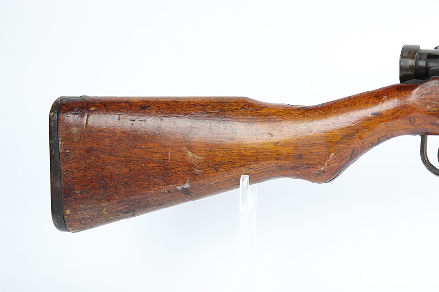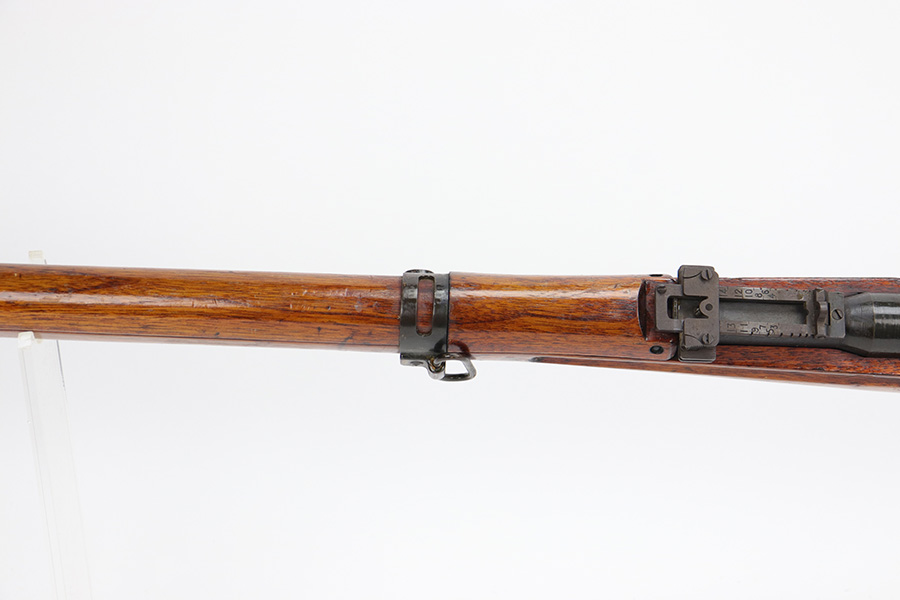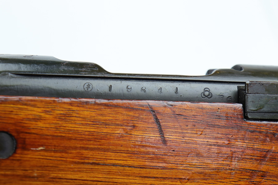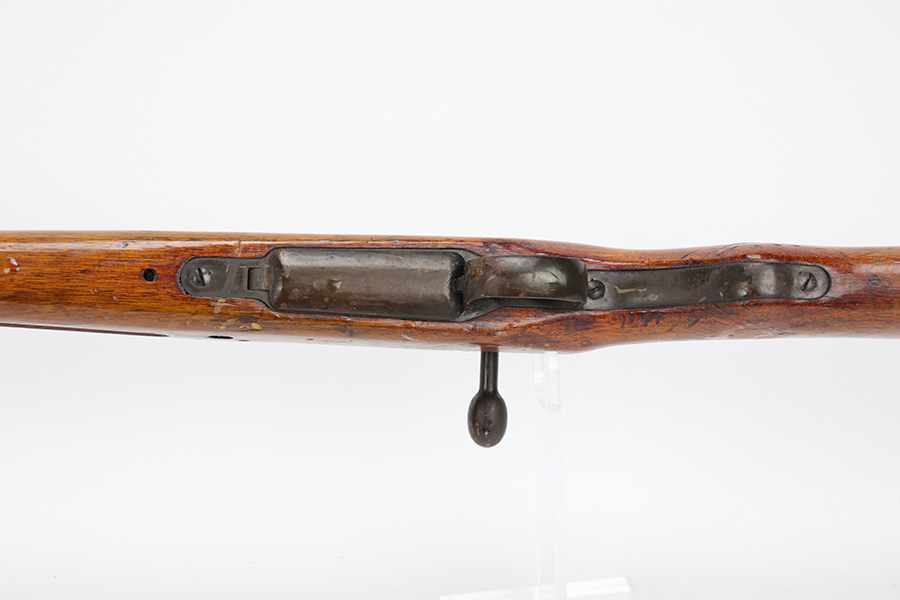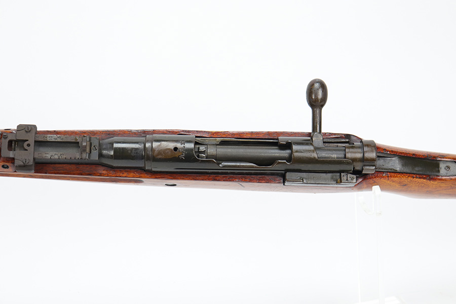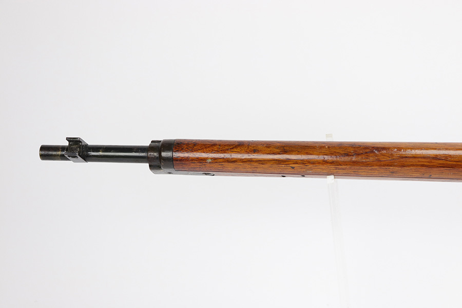 6/15/23 – This is a nice example of an Arisaka Type 99 rifle issued to the Japanese military during WW2. The bolt is mismatched, the firing pin is un-numbered, and the Imperial mum stamp on the receiver has been ground. There isn’t much actual finish loss on the metal parts, but it appears someone lacquered the wood and covered the metal parts with it as well. The stock shows the typical signs of wear and use for these guns. Mint bore.