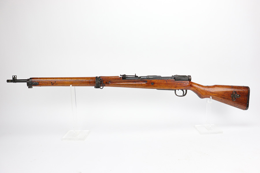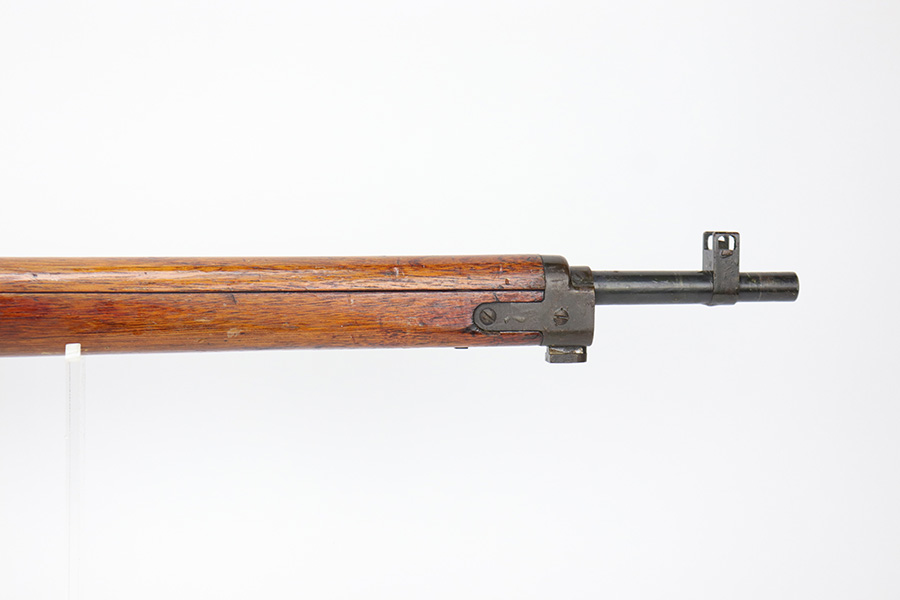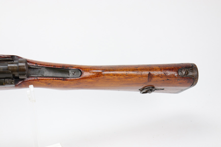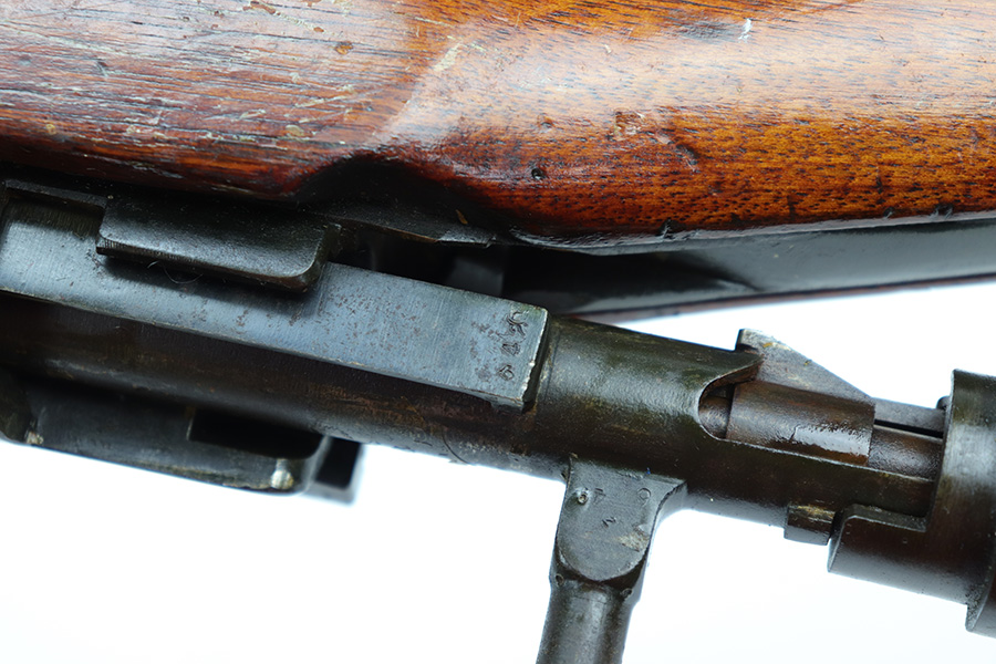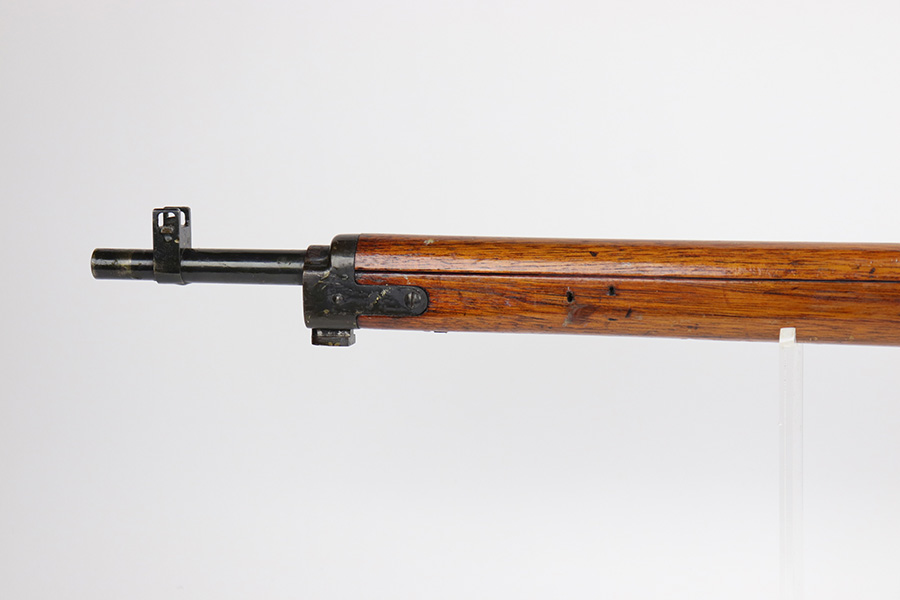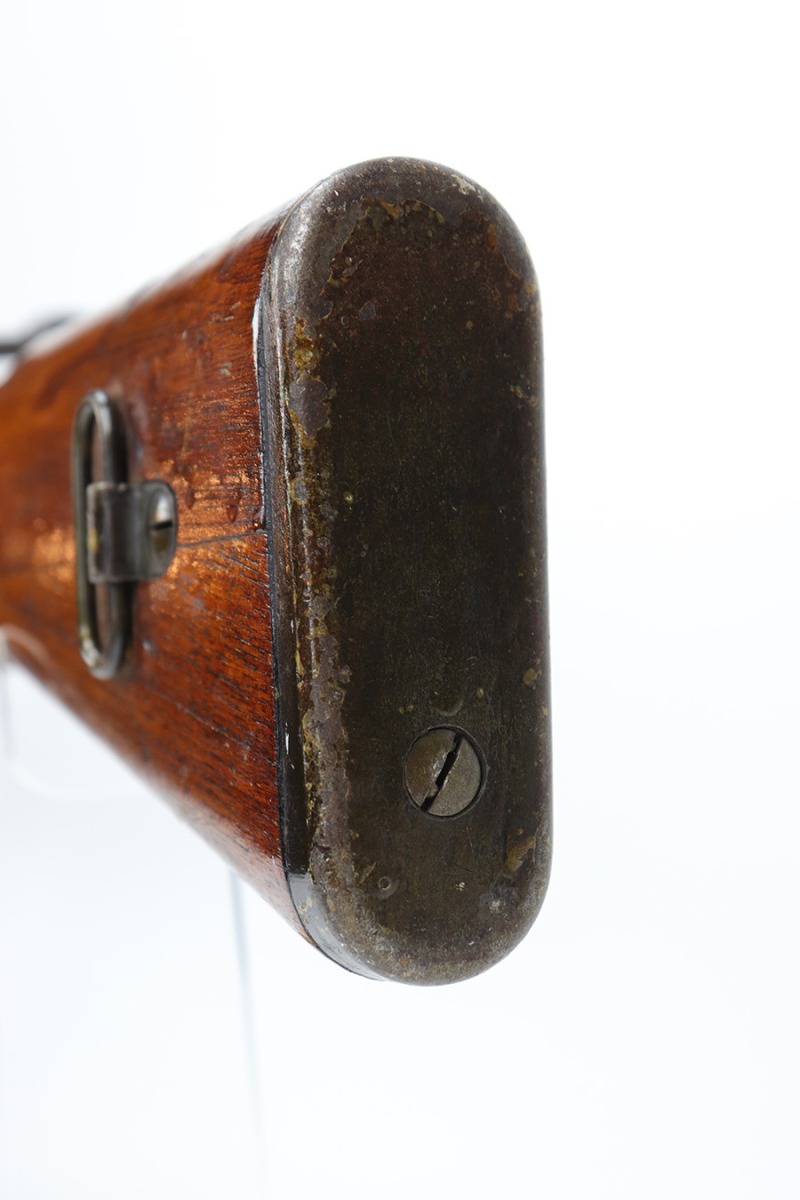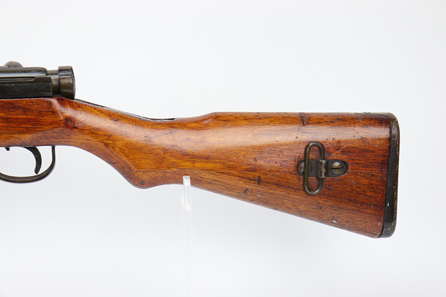 6/15/23 – This is a nice example of an Arisaka Type 99 rifle issued to the Japanese military during WW2. The bolt is mismatched, the firing pin is un-numbered, and the Imperial mum stamp on the receiver has been ground. There isn’t much actual finish loss on the metal parts, but it appears someone lacquered the wood and covered the metal parts with it as well. The stock shows the typical signs of wear and use for these guns. Mint bore.