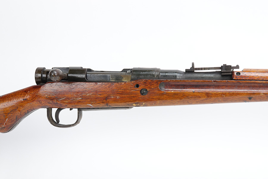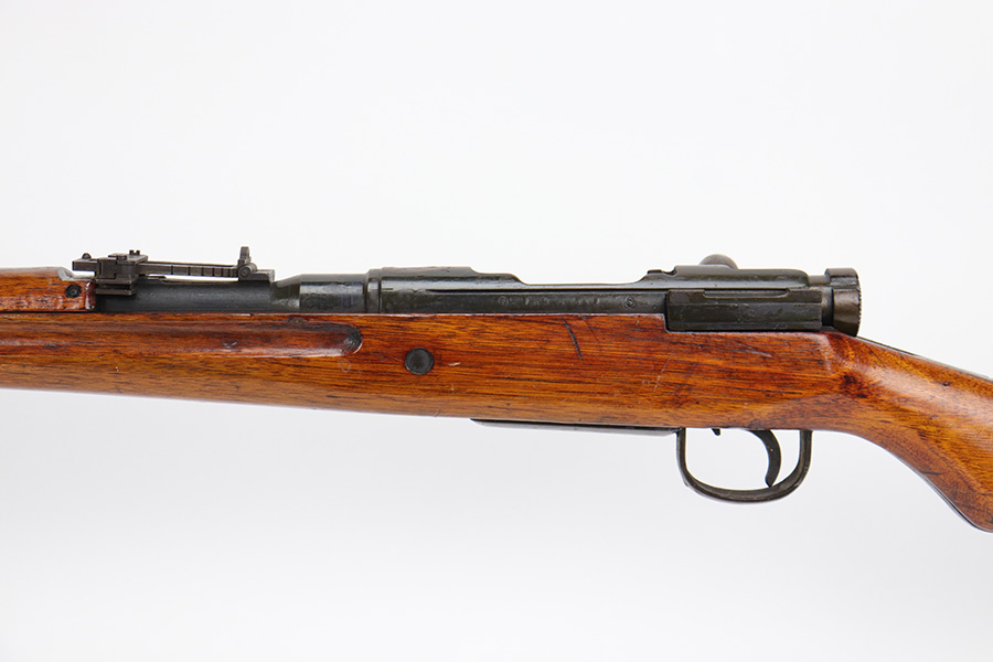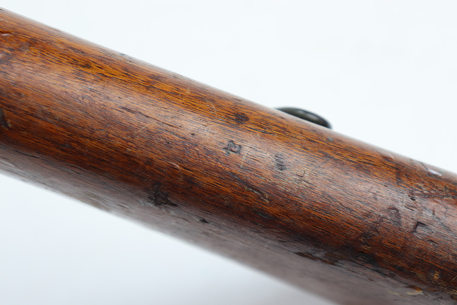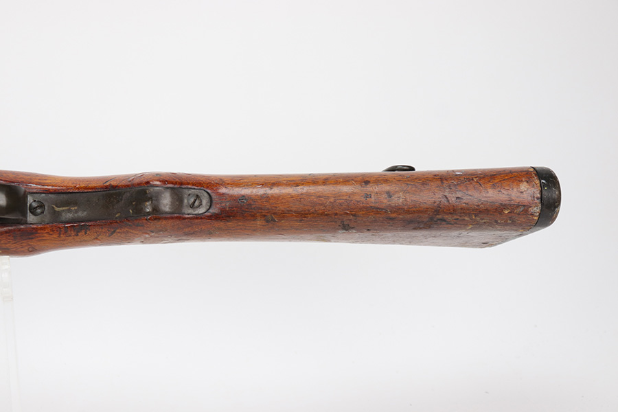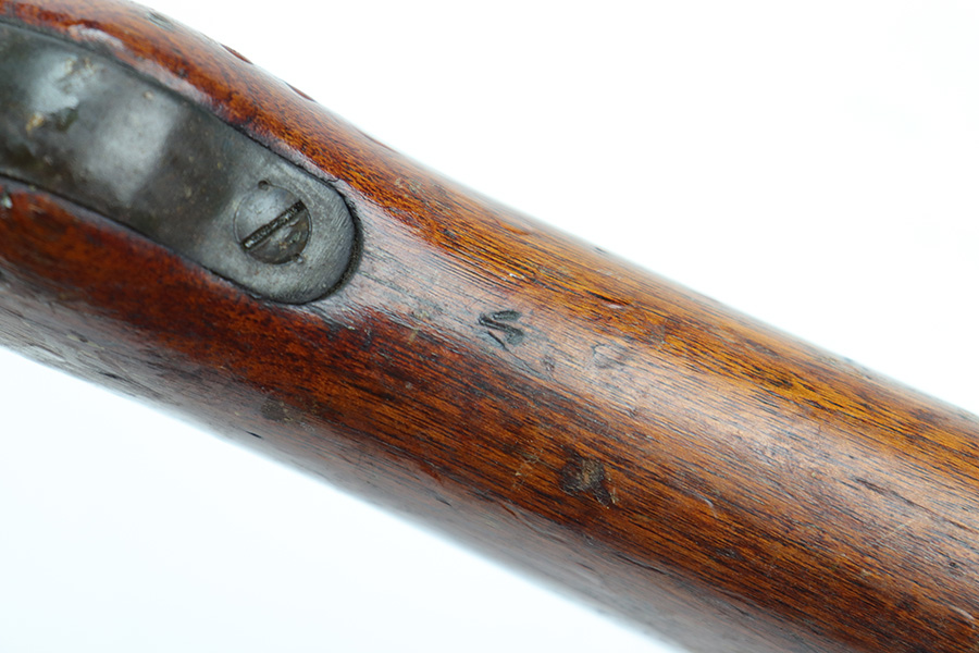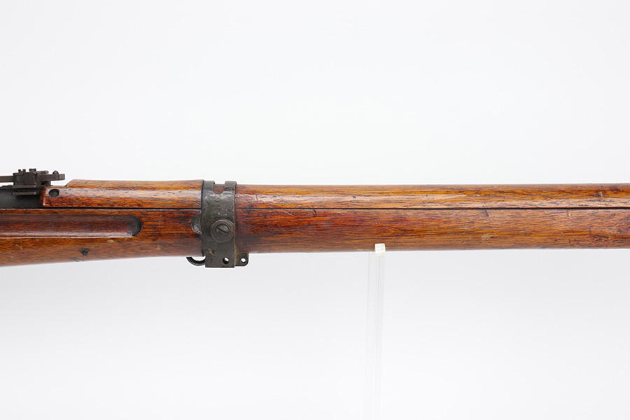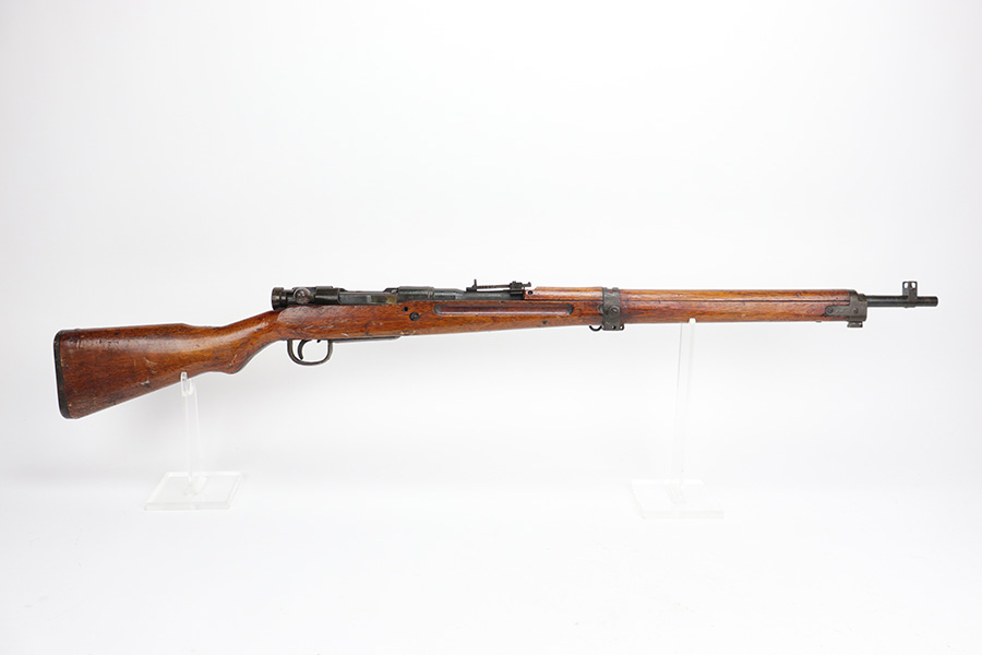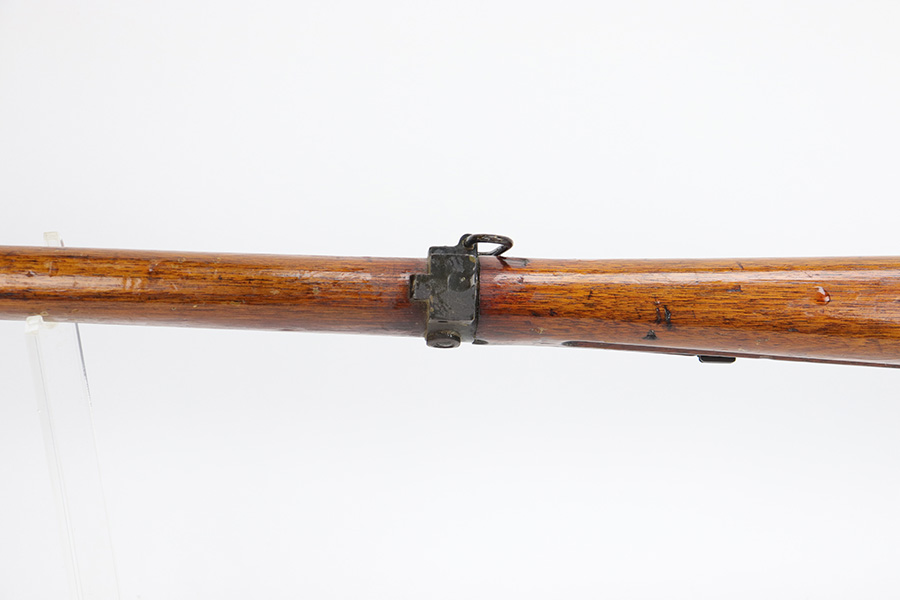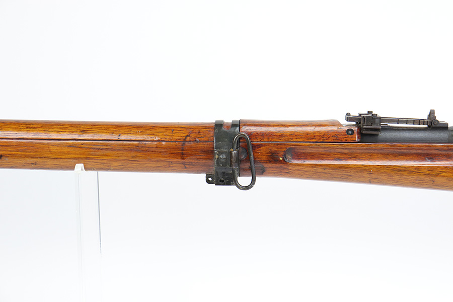 6/15/23 – This is a nice example of an Arisaka Type 99 rifle issued to the Japanese military during WW2. The bolt is mismatched, the firing pin is un-numbered, and the Imperial mum stamp on the receiver has been ground. There isn’t much actual finish loss on the metal parts, but it appears someone lacquered the wood and covered the metal parts with it as well. The stock shows the typical signs of wear and use for these guns. Mint bore.