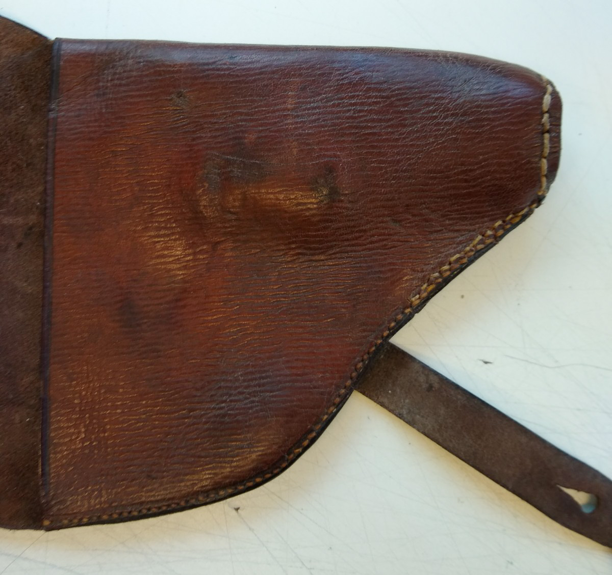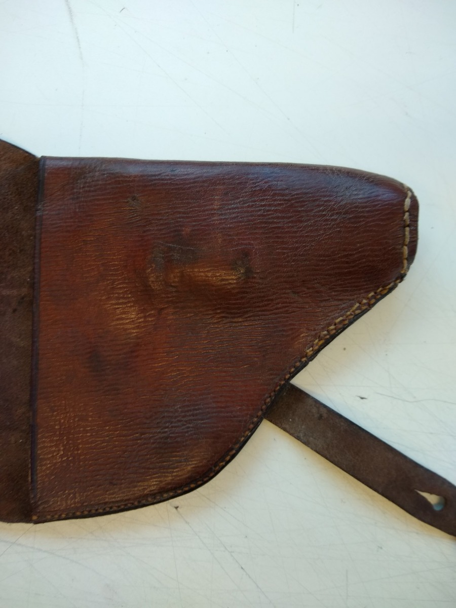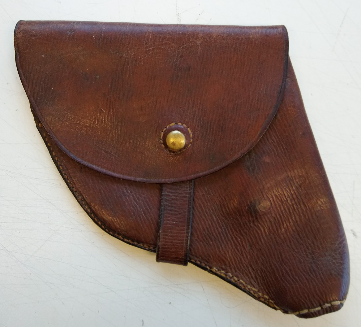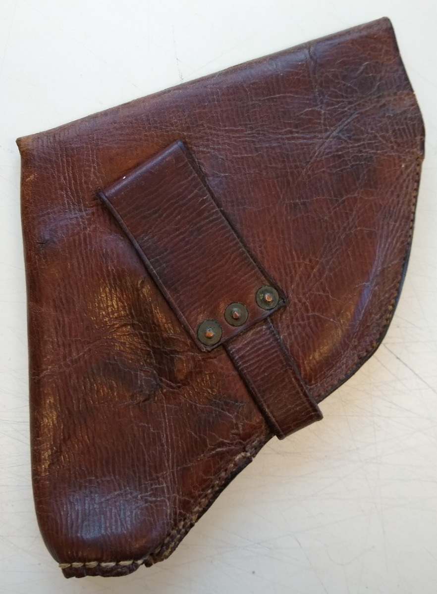 10/2/20 – This is an original Japanese commercial holster for a single barrel Type 10 flare gun. This holster is from the collection of J. Brown who wrote the definitive book on Japanese military handguns. The holster is in fair condition. There are cracks in the leather and some blemish marks on the brass button. However, it is still intact and usable. No visible maker mark.