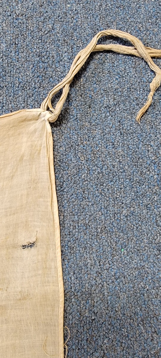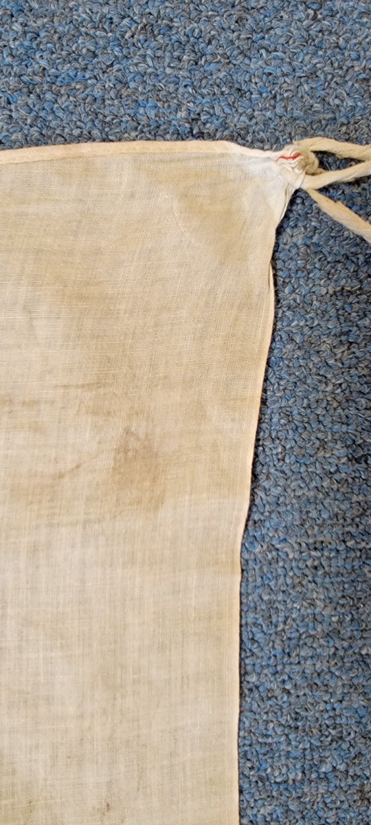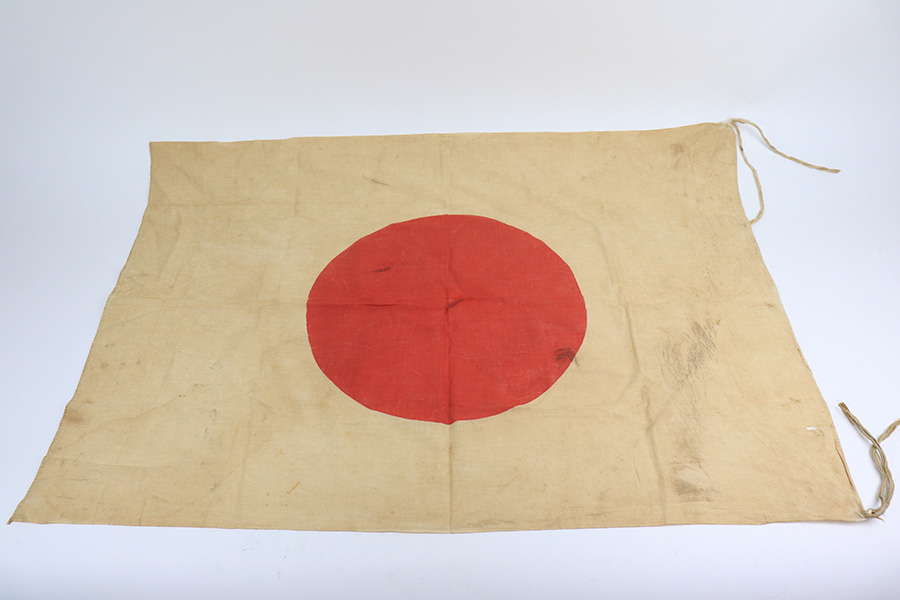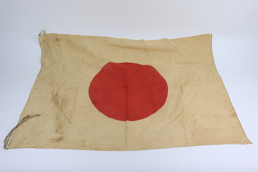 6/2/22 – This is a WW2 era Japanese linen flag. The flag measures approximately 37 x 26 inches. There are a few dark stains and natural yellowing throughout the flag. There’s a small hole near the hoist of the flag. The hoist has the original fastening strings still attached. See photos.