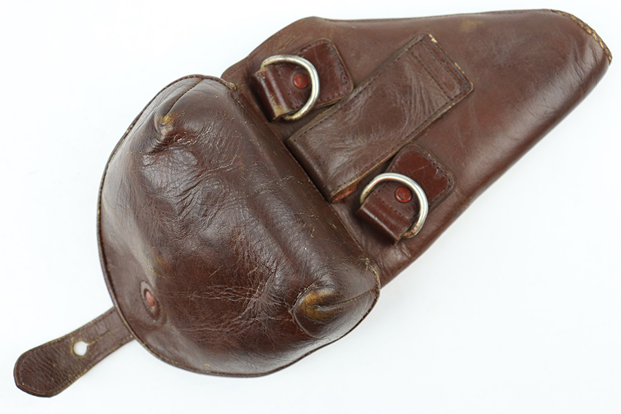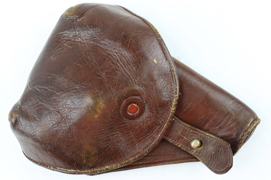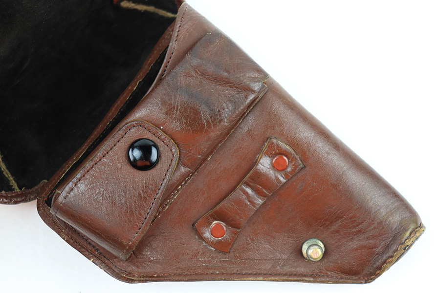 7/25/23 – This is a fairly scarce Japanese holster for a FN Browning M1910. These were made as a few Japanese Officers were known to carry FN M1910’s during WW2. This holster shows clear Japanese style and is in great overall condition. The leather is soft and pliable with normal signs of previous use and aging. All original stitching is in great condition throughout. The interior leather is lined with a soft black cloth material. No major flaws or issues.