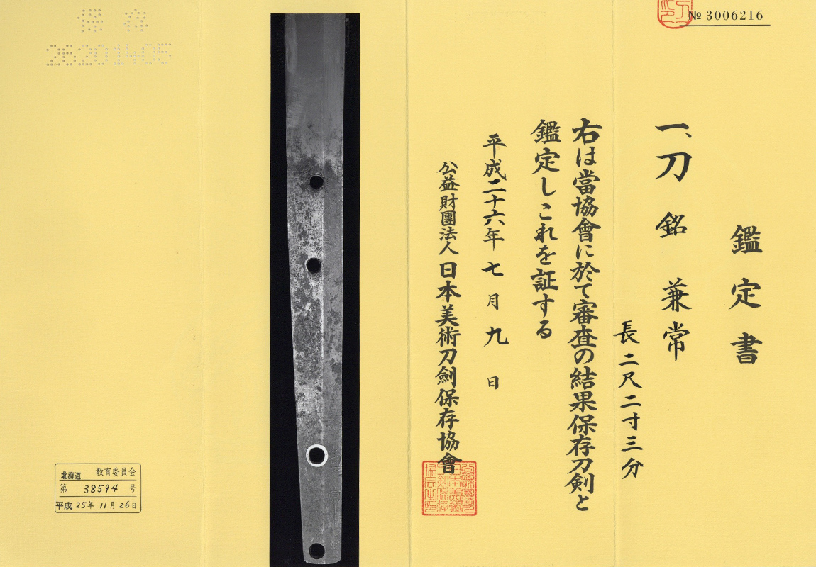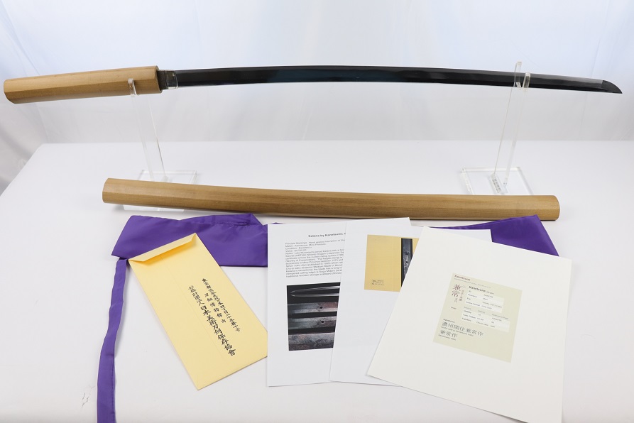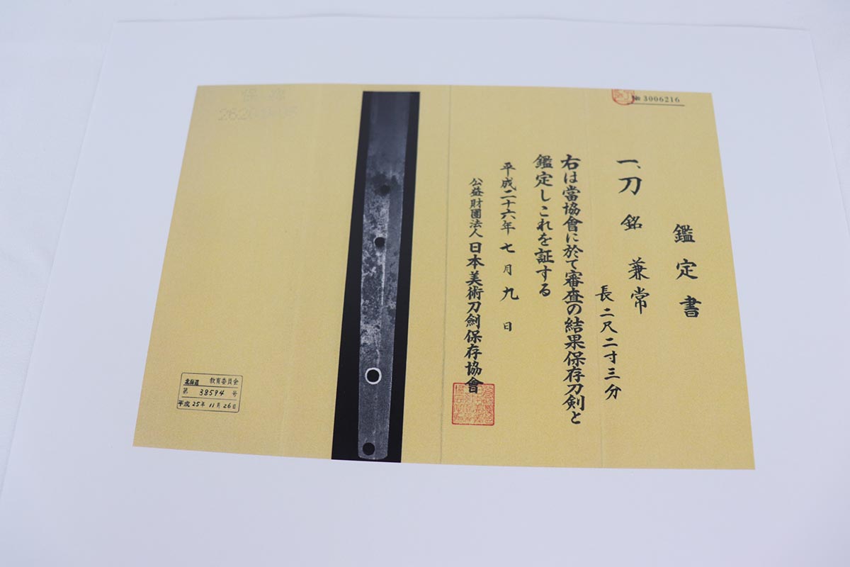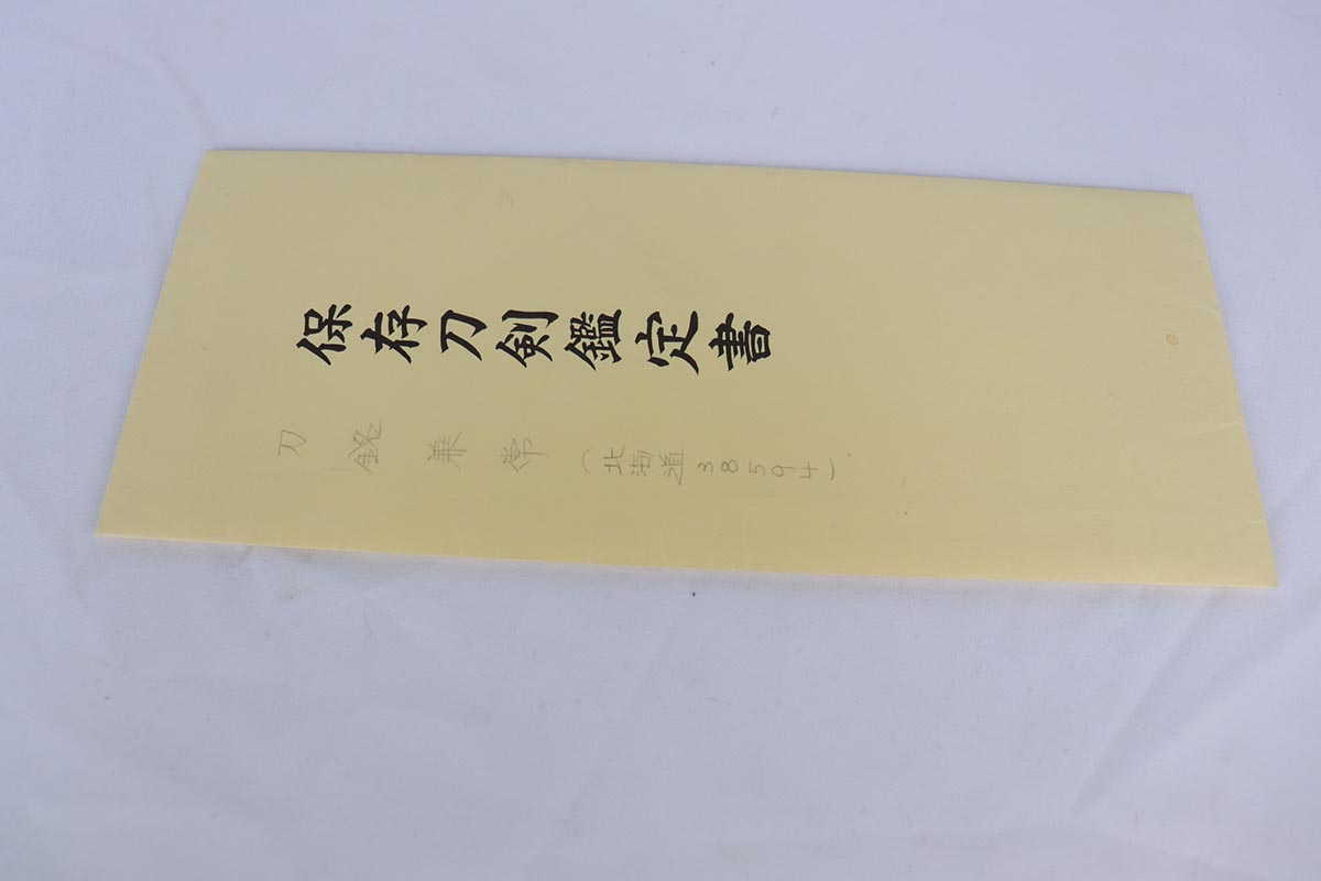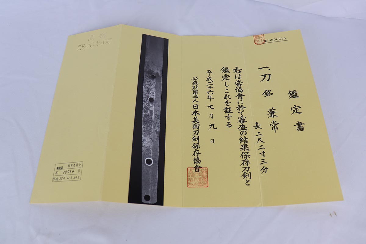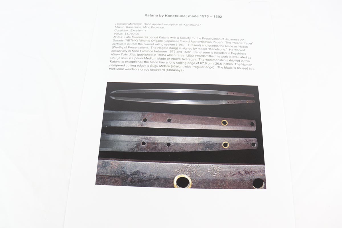 9/5/18 – This is an original, late Muromachi period Katana with a Society for the Preservation of Japanese Art Swords (NBTHK) Nihonto Origami (Japanese Sword Authentication Paper). The “Yellow Paper” certificate, dated 26 May 2014, is from the current rating system (1982 – Present) and grades the blade as Hozon (Worthy of Preservation). The Nagato (tang) is signed by maker “Kanetsune.” He worked exclusively in Mino Province between 1573 and 1592. Kanetsune is included in Fujishiro’s Nihon Toko Jiten (published in 1935) which rates 1,500 swordsmiths; his work is evaluated as Chu-jo saku (Superior Medium Made or Above Average). The workmanship exhibited in this Katana is exceptional; the blade has a long cutting edge of 67.6 cm / 26.6 inches. The Hamon (tempered cutting edge) is Sugu Midare (straight with irregular edge). The blade is housed in a traditional wooden storage scabbard (Shirasaya). The original yellow paper, along with additional documents are included. This came from the Rick Ricupero collection. Guaranteed original and authentic.