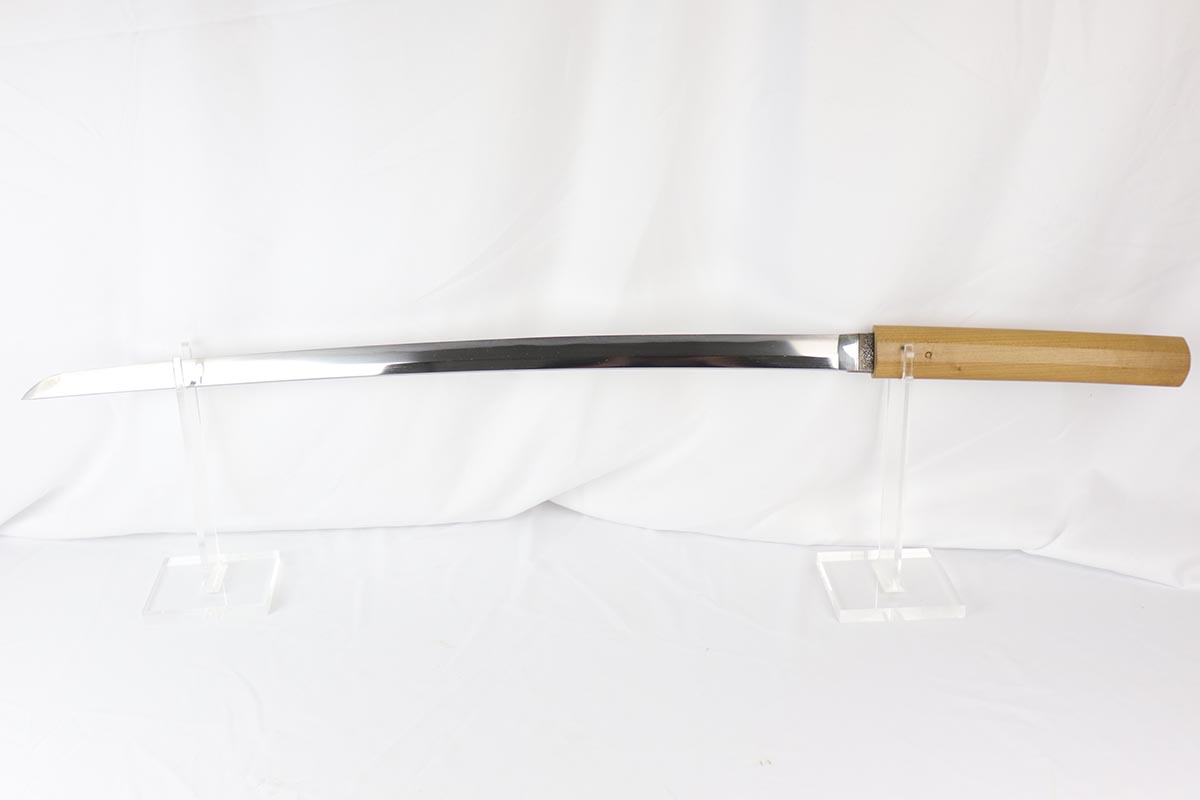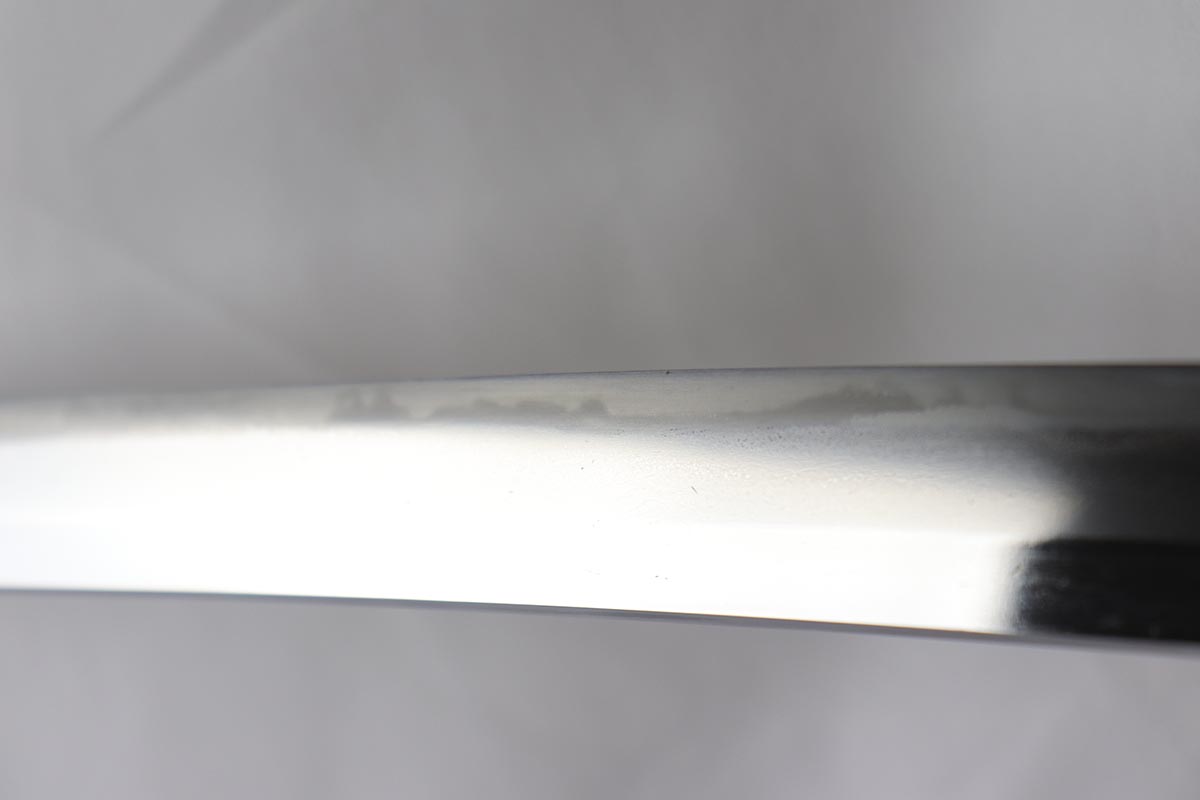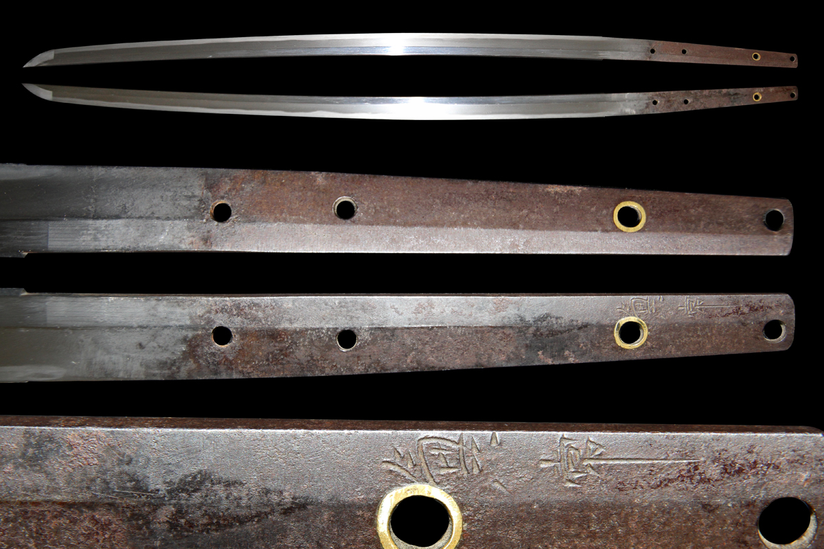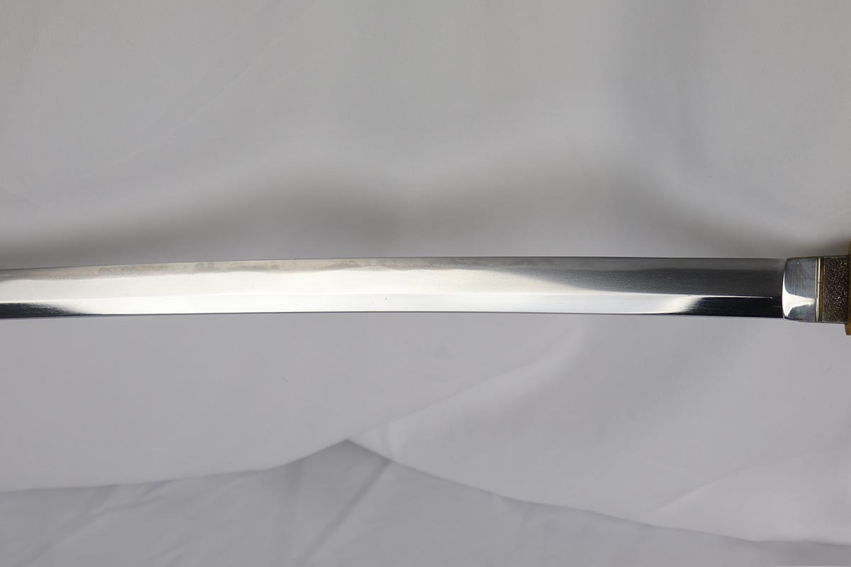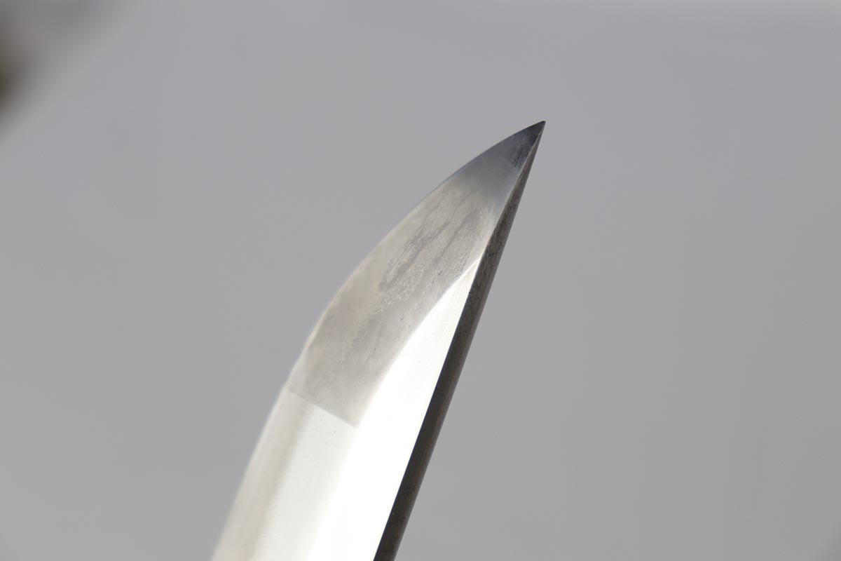 9/5/18 – This is an original, late Muromachi period Katana with a Society for the Preservation of Japanese Art Swords (NBTHK) Nihonto Origami (Japanese Sword Authentication Paper). The “Yellow Paper” certificate, dated 26 May 2014, is from the current rating system (1982 – Present) and grades the blade as Hozon (Worthy of Preservation). The Nagato (tang) is signed by maker “Kanetsune.” He worked exclusively in Mino Province between 1573 and 1592. Kanetsune is included in Fujishiro’s Nihon Toko Jiten (published in 1935) which rates 1,500 swordsmiths; his work is evaluated as Chu-jo saku (Superior Medium Made or Above Average). The workmanship exhibited in this Katana is exceptional; the blade has a long cutting edge of 67.6 cm / 26.6 inches. The Hamon (tempered cutting edge) is Sugu Midare (straight with irregular edge). The blade is housed in a traditional wooden storage scabbard (Shirasaya). The original yellow paper, along with additional documents are included. This came from the Rick Ricupero collection. Guaranteed original and authentic.