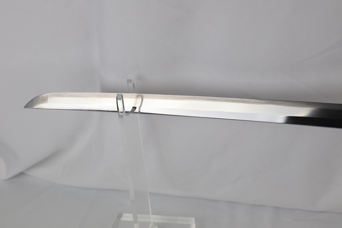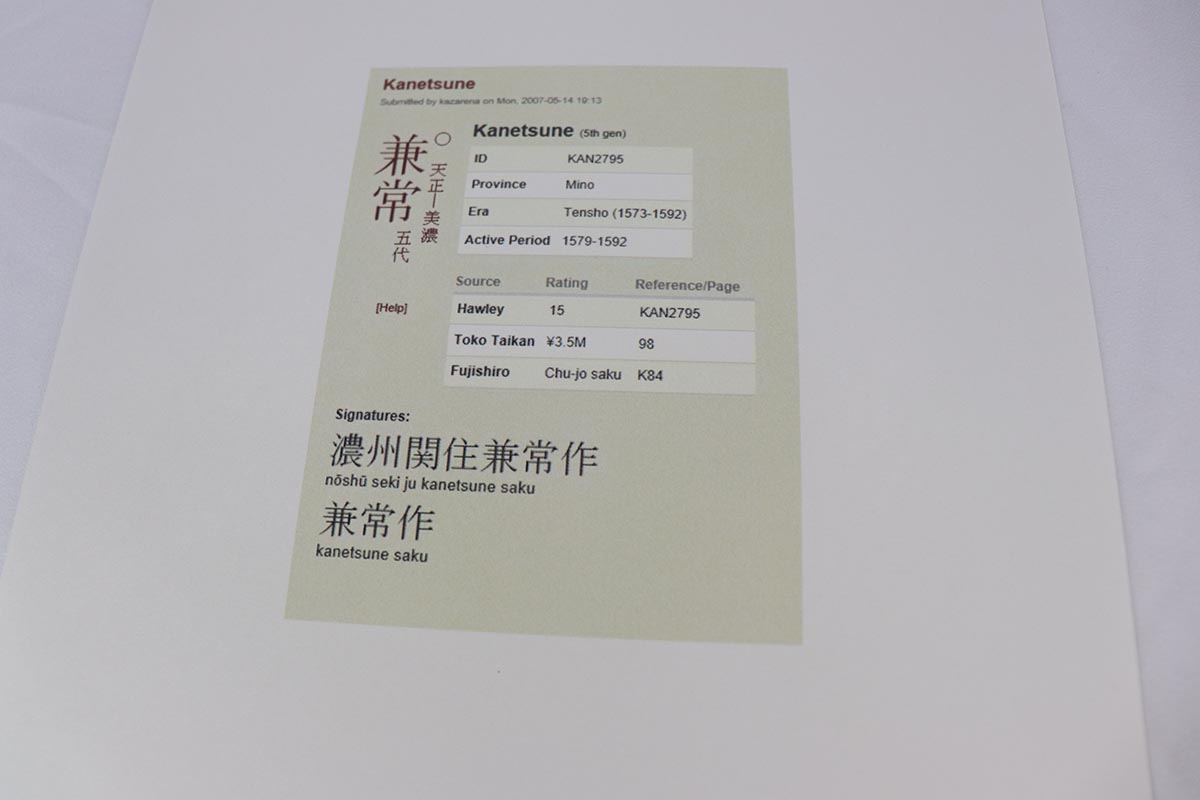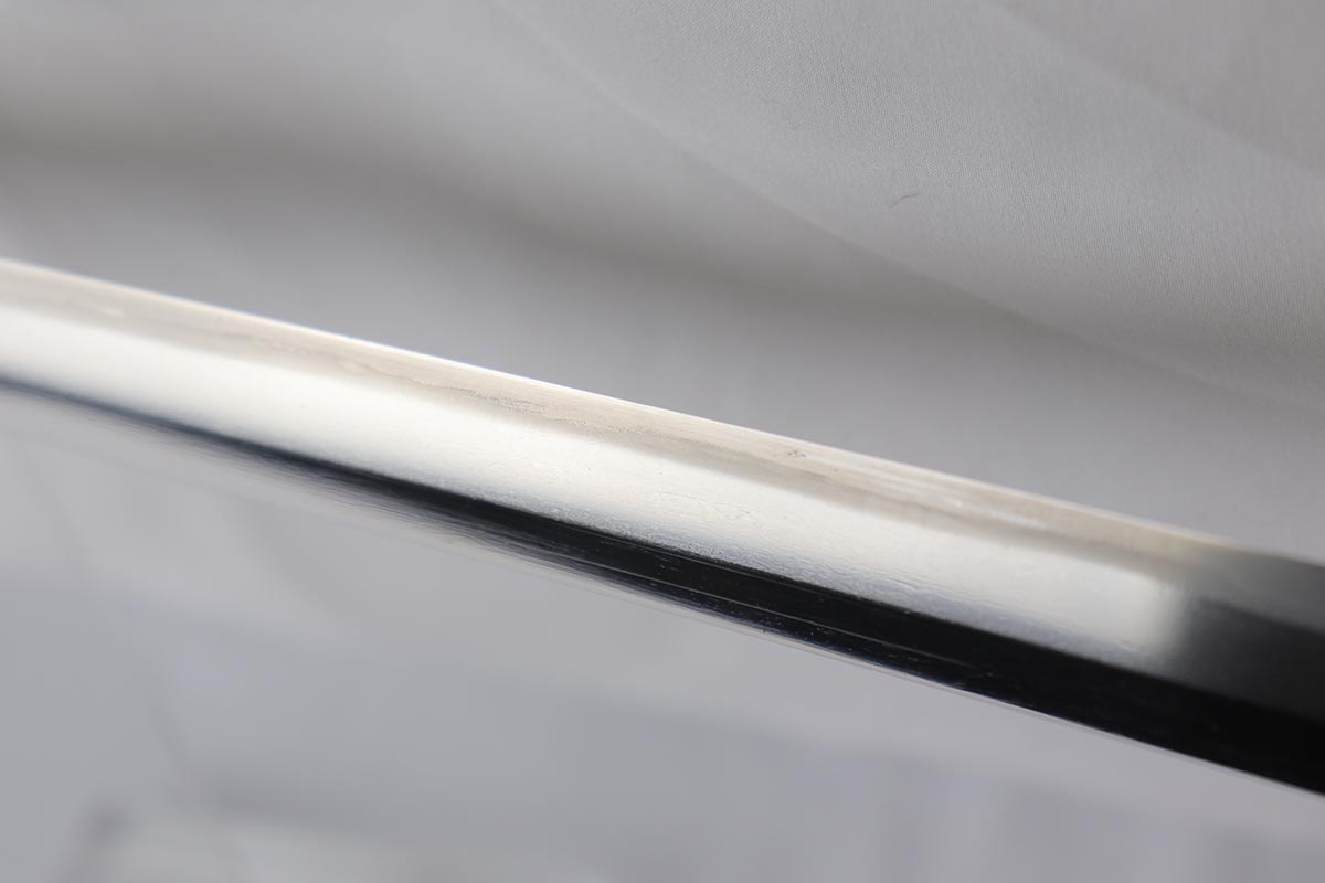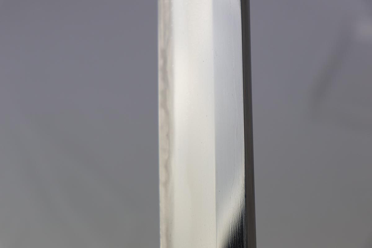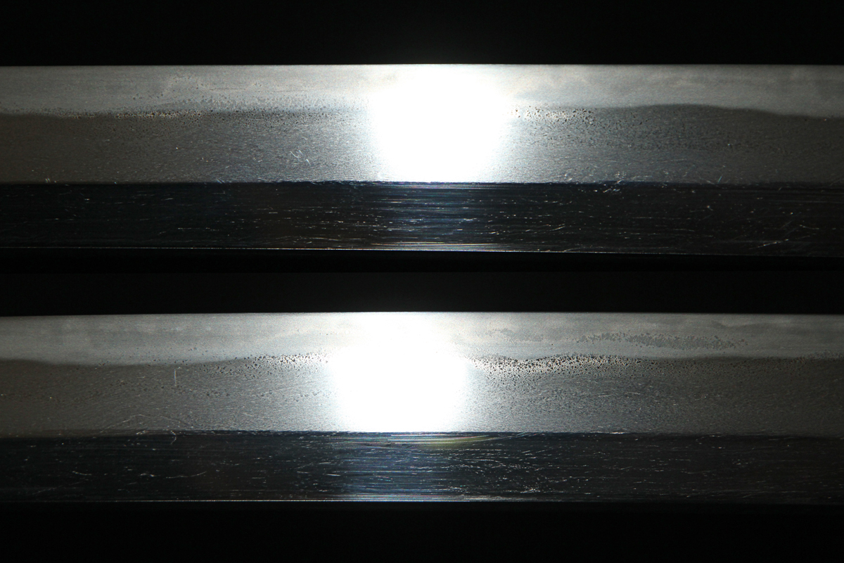 9/5/18 – This is an original, late Muromachi period Katana with a Society for the Preservation of Japanese Art Swords (NBTHK) Nihonto Origami (Japanese Sword Authentication Paper). The “Yellow Paper” certificate, dated 26 May 2014, is from the current rating system (1982 – Present) and grades the blade as Hozon (Worthy of Preservation). The Nagato (tang) is signed by maker “Kanetsune.” He worked exclusively in Mino Province between 1573 and 1592. Kanetsune is included in Fujishiro’s Nihon Toko Jiten (published in 1935) which rates 1,500 swordsmiths; his work is evaluated as Chu-jo saku (Superior Medium Made or Above Average). The workmanship exhibited in this Katana is exceptional; the blade has a long cutting edge of 67.6 cm / 26.6 inches. The Hamon (tempered cutting edge) is Sugu Midare (straight with irregular edge). The blade is housed in a traditional wooden storage scabbard (Shirasaya). The original yellow paper, along with additional documents are included. This came from the Rick Ricupero collection. Guaranteed original and authentic.
