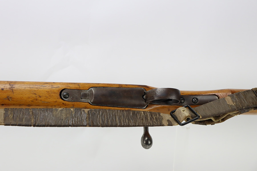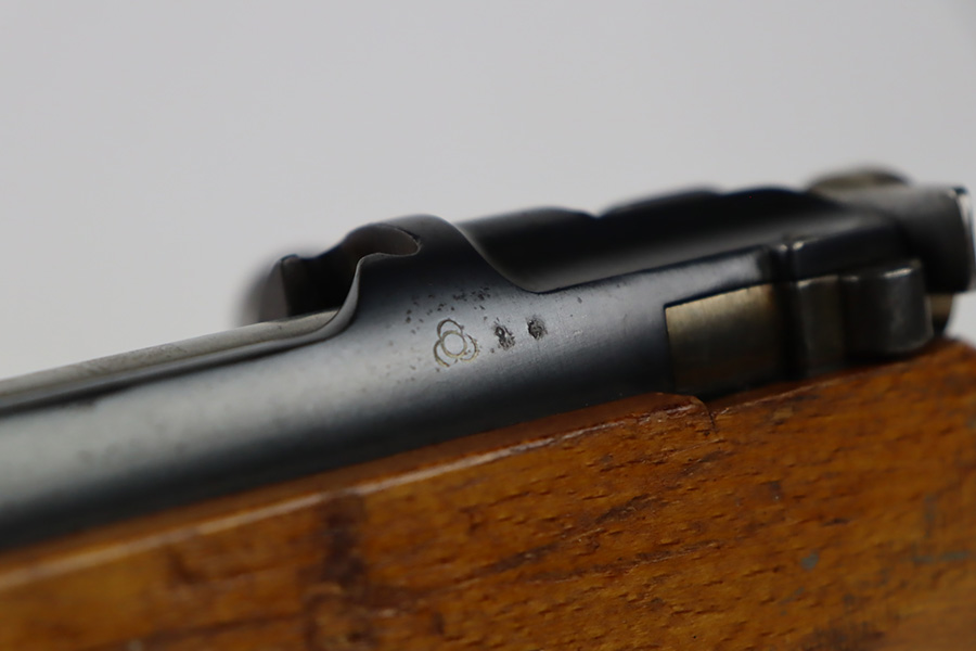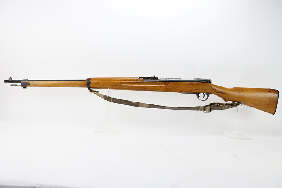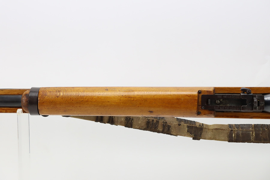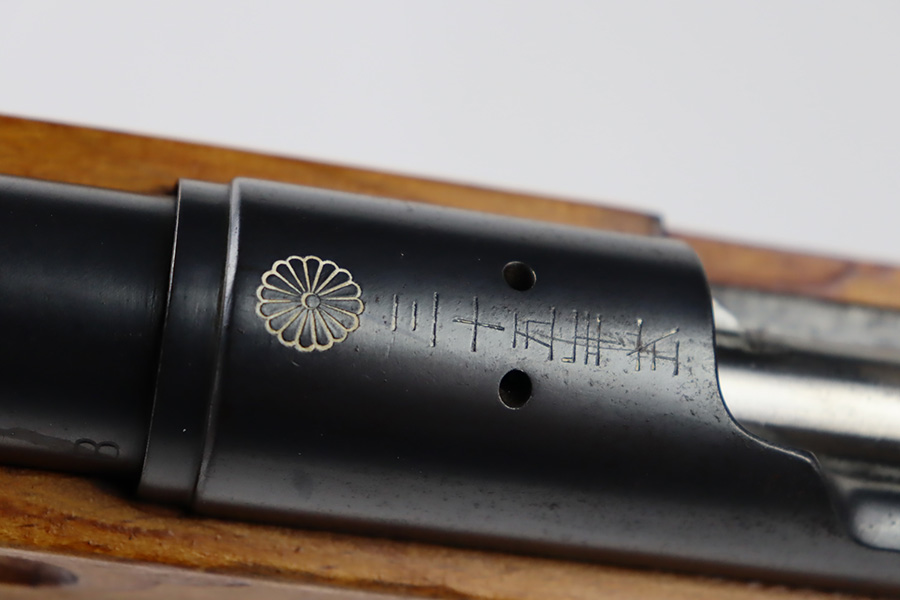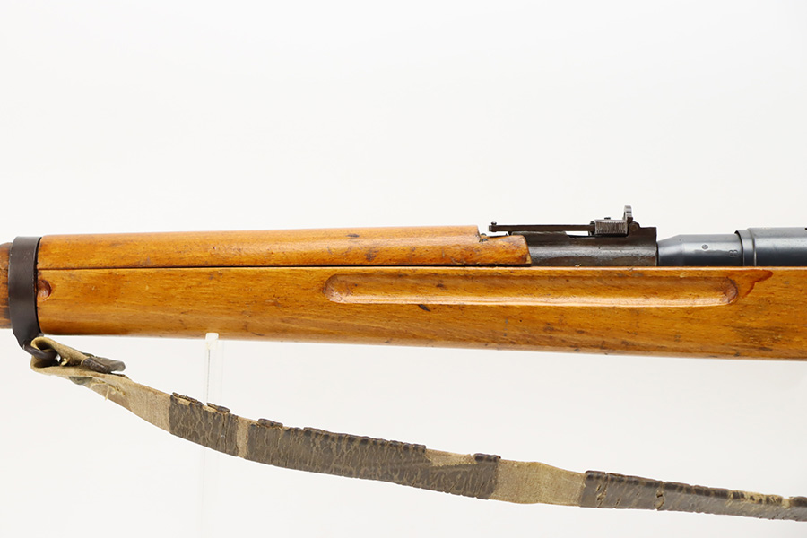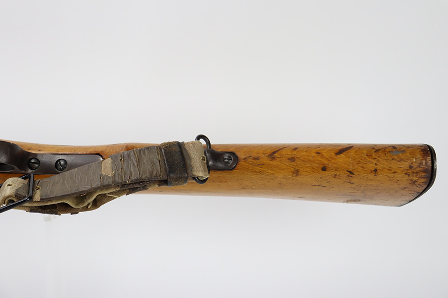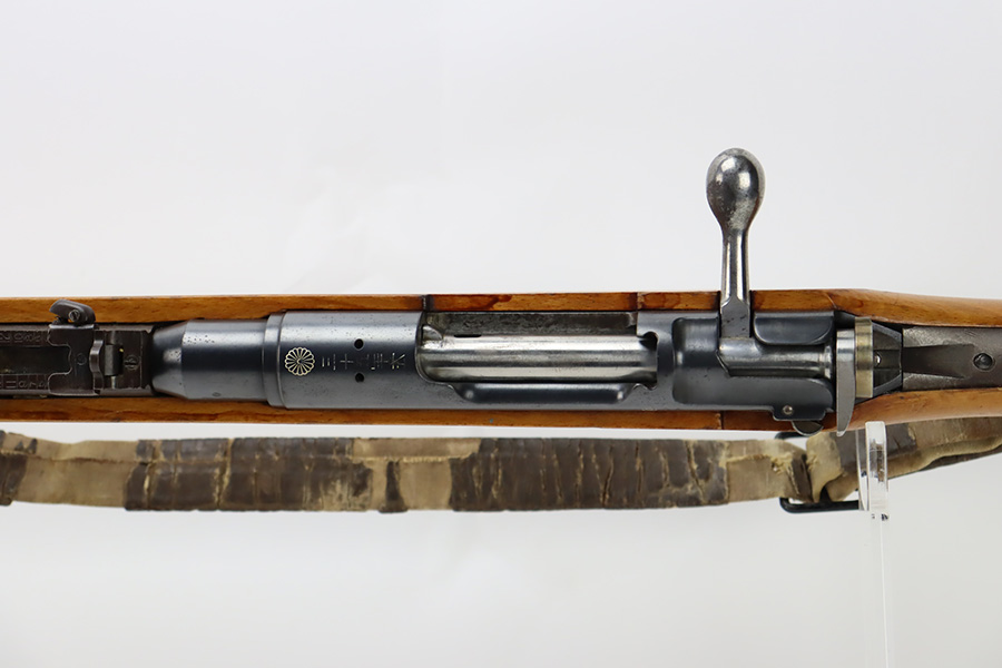 11/3/23 – An improvement on the Type 30 Arisaka, the Type 35 was developed for issue to the Special Naval Landing Forces of the Imperial Japanese Navy and was the first Arisaka variant to integrate a dust cover. First completed in 1902, the Type 35 started being phased out for the Type 38 sometime around 1905. When these rifles were phased out, the rifles and incomplete parts were mostly placed in storage until the end of World War II, when the Japanese were desperately short of weapons and trying to arm anyone they could. During this period increasingly crude weapons of all types were assembled in preparation for the perceived threat of invasion of mainland Japan. Though the receiver and bolt are of the Type 35 pattern, there is no provision for the dust cover which was normally seen and it is not marked with a serial number, making it likely that this receiver had remained unfinished in navy storage until 1944-1945 when it assembled into a rifle in a last ditch effort to turn the tide of the war. This one has a completely intact Imperial mum stamp on the receiver, a crude peep-style rear sight, and a flat butt plate. The metal parts have retained most of their finish, but there is light brown patina on all of the parts except for the receiver. Light freckling on the receiver. Excellent wood. Mint bore. Comes with a scarce, period-correct rubberized canvas sling.