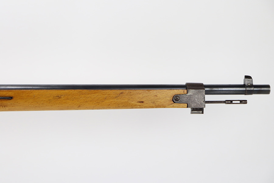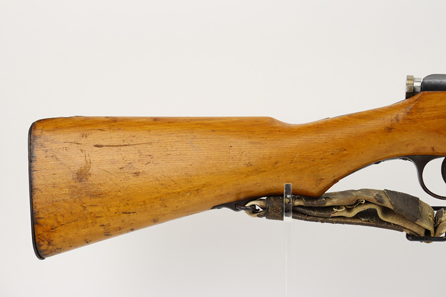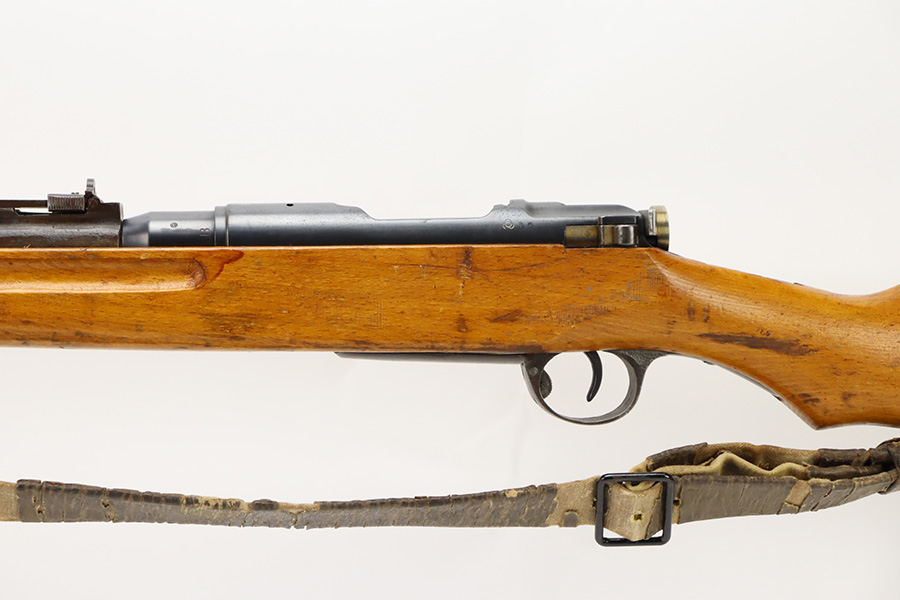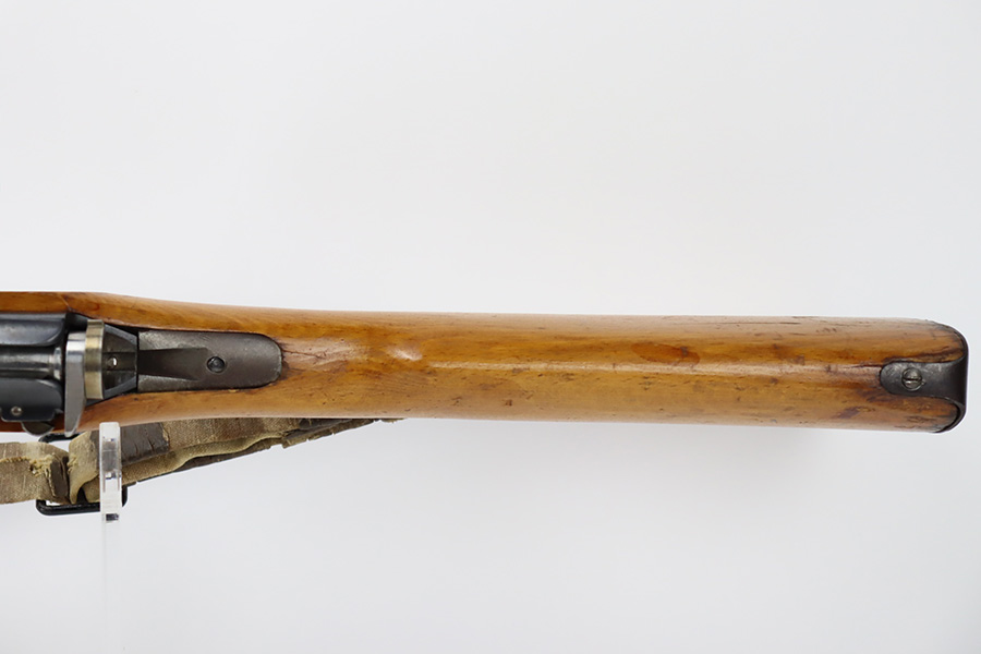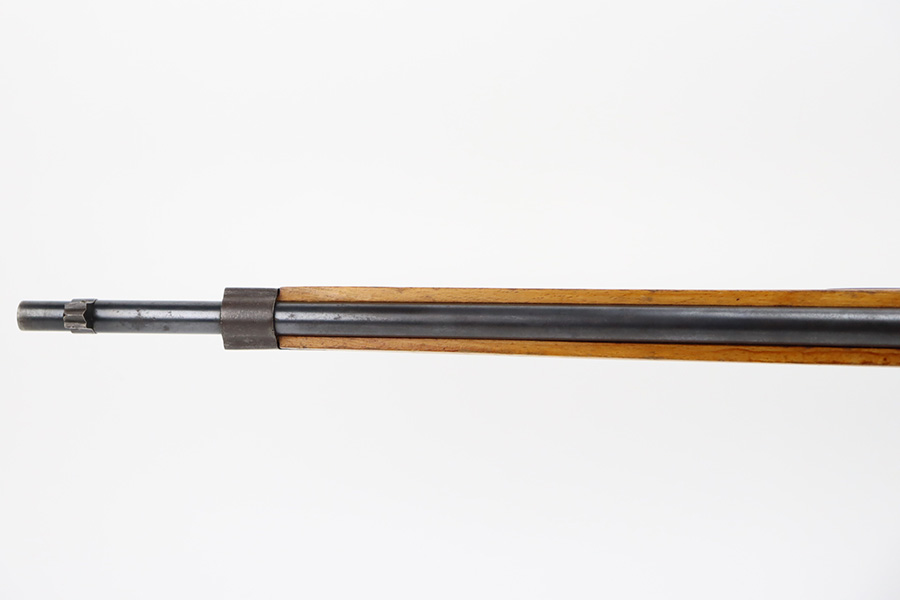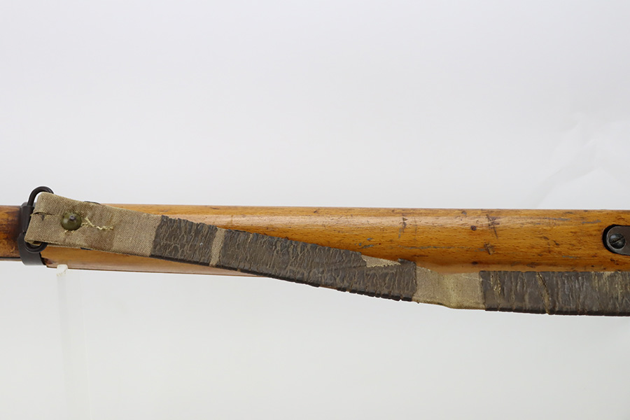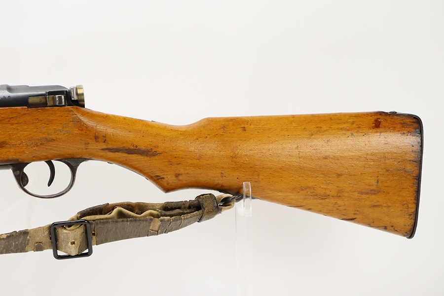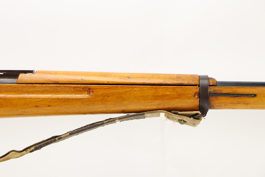 11/3/23 – An improvement on the Type 30 Arisaka, the Type 35 was developed for issue to the Special Naval Landing Forces of the Imperial Japanese Navy and was the first Arisaka variant to integrate a dust cover. First completed in 1902, the Type 35 started being phased out for the Type 38 sometime around 1905. When these rifles were phased out, the rifles and incomplete parts were mostly placed in storage until the end of World War II, when the Japanese were desperately short of weapons and trying to arm anyone they could. During this period increasingly crude weapons of all types were assembled in preparation for the perceived threat of invasion of mainland Japan. Though the receiver and bolt are of the Type 35 pattern, there is no provision for the dust cover which was normally seen and it is not marked with a serial number, making it likely that this receiver had remained unfinished in navy storage until 1944-1945 when it assembled into a rifle in a last ditch effort to turn the tide of the war. This one has a completely intact Imperial mum stamp on the receiver, a crude peep-style rear sight, and a flat butt plate. The metal parts have retained most of their finish, but there is light brown patina on all of the parts except for the receiver. Light freckling on the receiver. Excellent wood. Mint bore. Comes with a scarce, period-correct rubberized canvas sling.