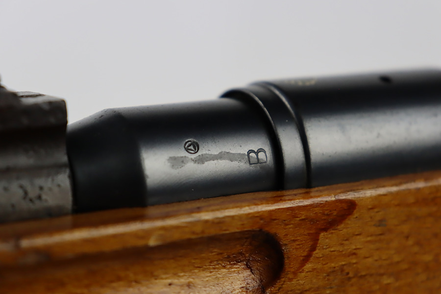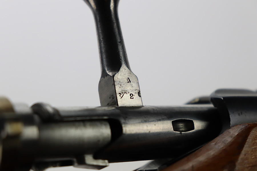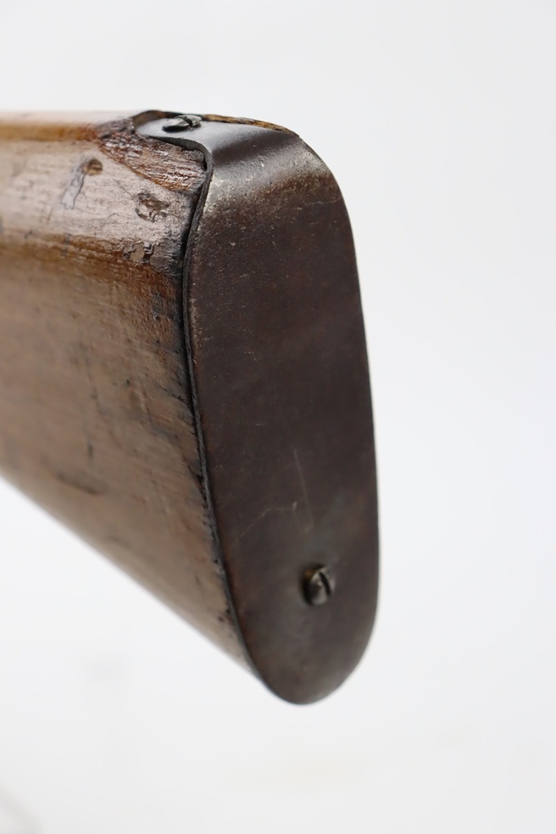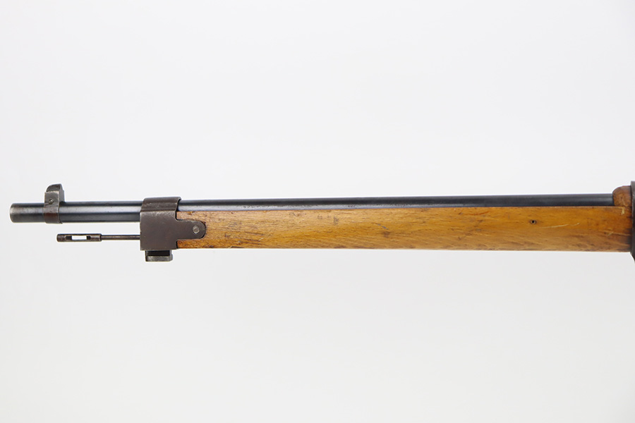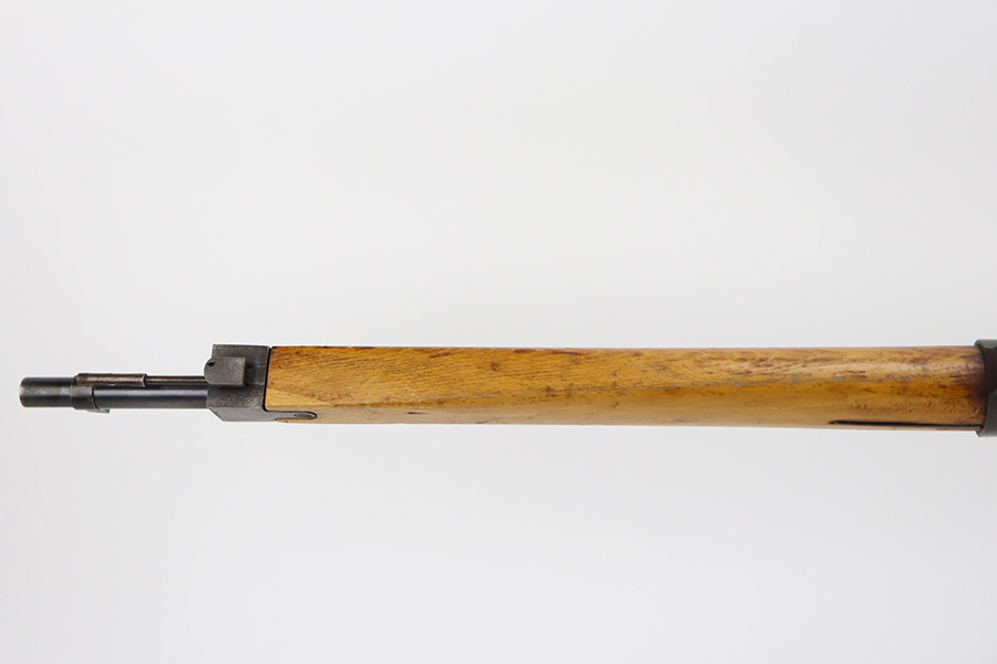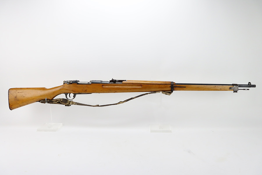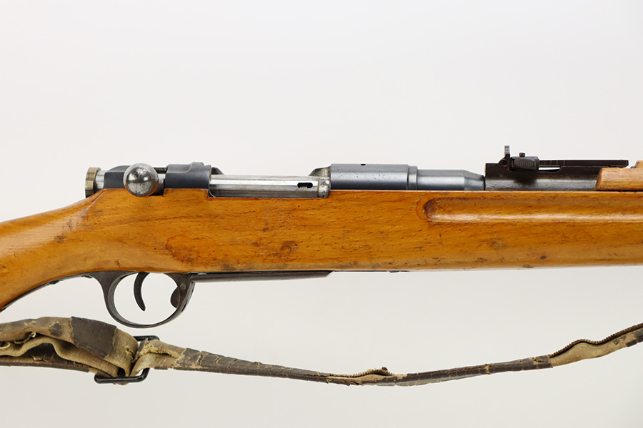 11/3/23 – An improvement on the Type 30 Arisaka, the Type 35 was developed for issue to the Special Naval Landing Forces of the Imperial Japanese Navy and was the first Arisaka variant to integrate a dust cover. First completed in 1902, the Type 35 started being phased out for the Type 38 sometime around 1905. When these rifles were phased out, the rifles and incomplete parts were mostly placed in storage until the end of World War II, when the Japanese were desperately short of weapons and trying to arm anyone they could. During this period increasingly crude weapons of all types were assembled in preparation for the perceived threat of invasion of mainland Japan. Though the receiver and bolt are of the Type 35 pattern, there is no provision for the dust cover which was normally seen and it is not marked with a serial number, making it likely that this receiver had remained unfinished in navy storage until 1944-1945 when it assembled into a rifle in a last ditch effort to turn the tide of the war. This one has a completely intact Imperial mum stamp on the receiver, a crude peep-style rear sight, and a flat butt plate. The metal parts have retained most of their finish, but there is light brown patina on all of the parts except for the receiver. Light freckling on the receiver. Excellent wood. Mint bore. Comes with a scarce, period-correct rubberized canvas sling.