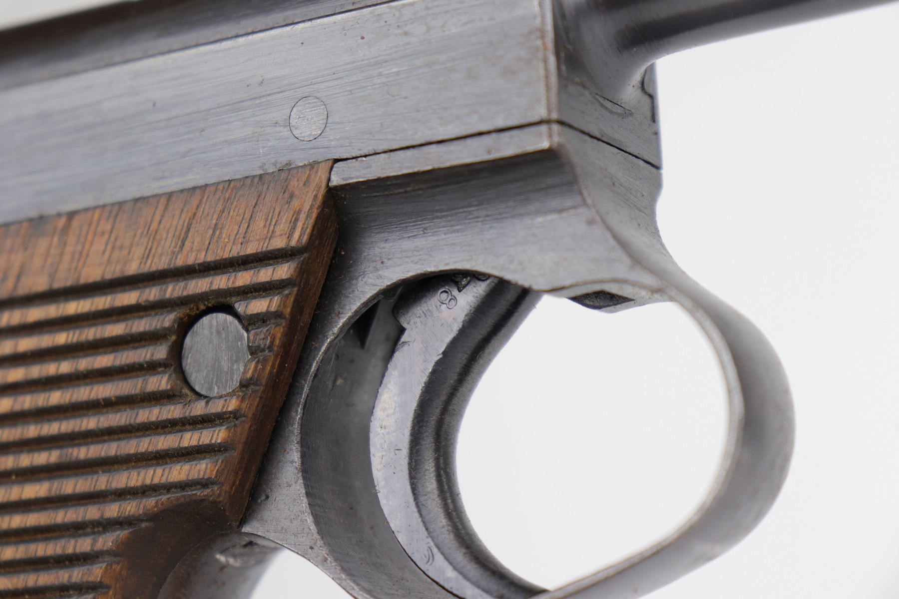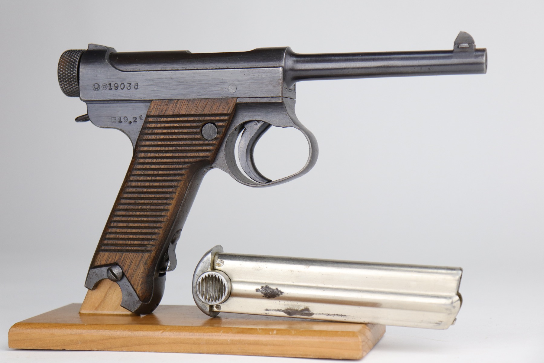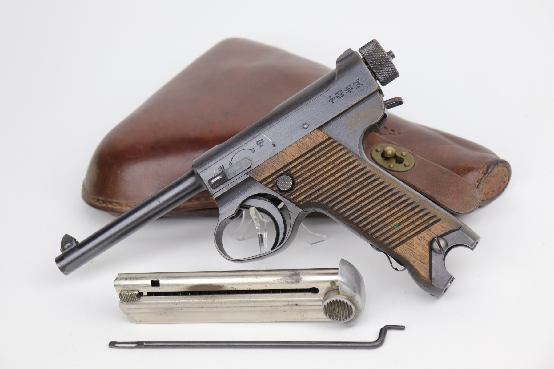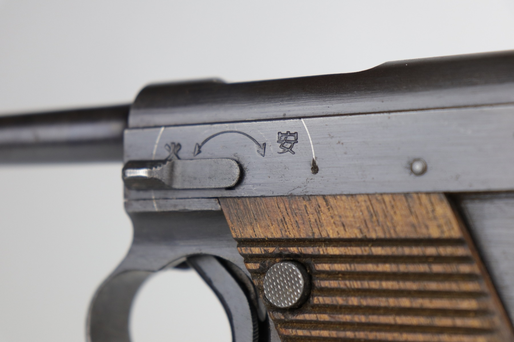 9/30/20 – This is a very nice example of a Nambu Type 14 rig issued to the Japanese military in February of 1944. The rig includes an original holster, an original cleaning rod, and a period-correct mismatched magazine. The gun has retained about 90% of its original bluing. Most of the wear is on the straps. There is also an area of discoloration toward the back of the left side of the frame. There is pitting here and there but most noticeable on the straps. The bore is mint.