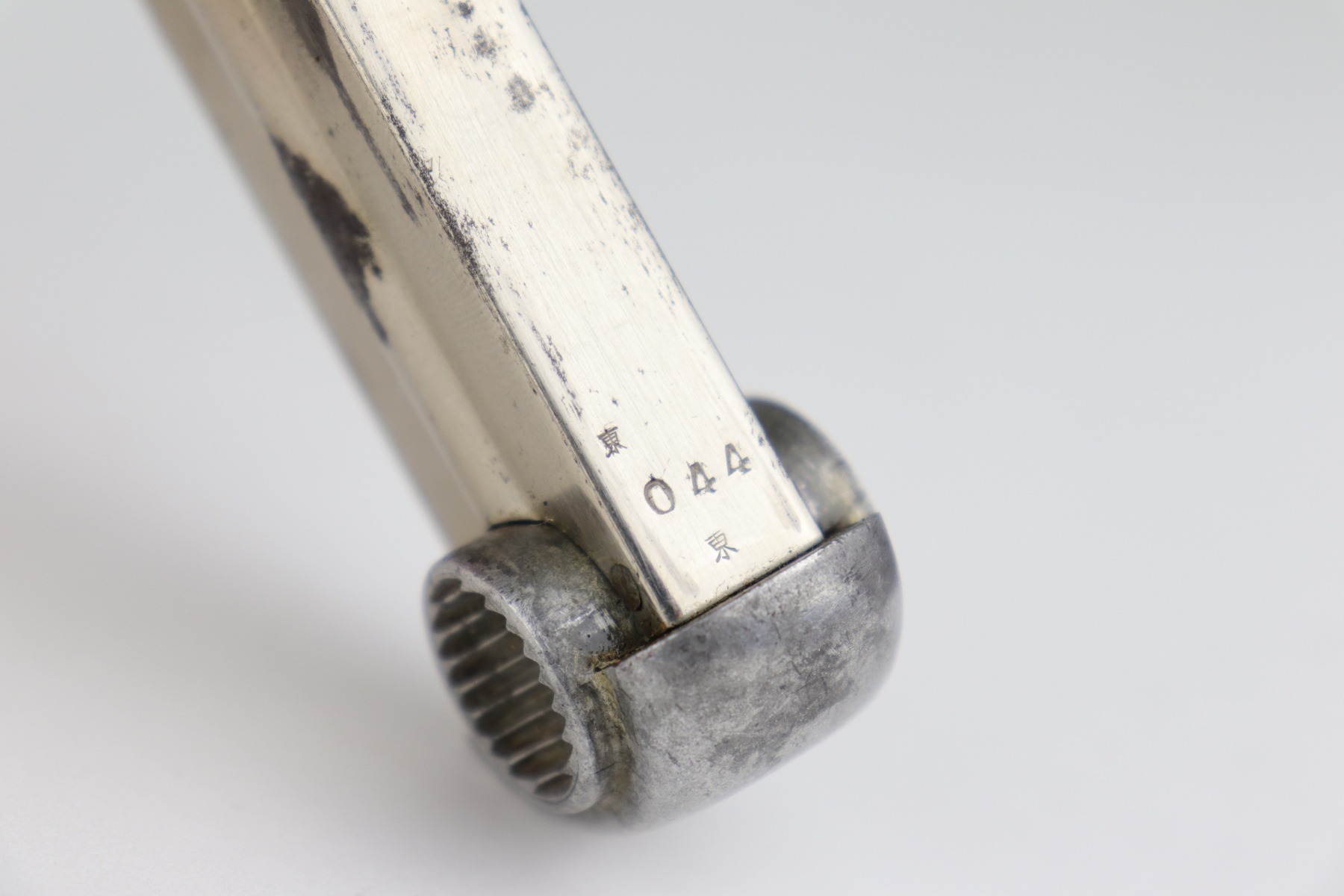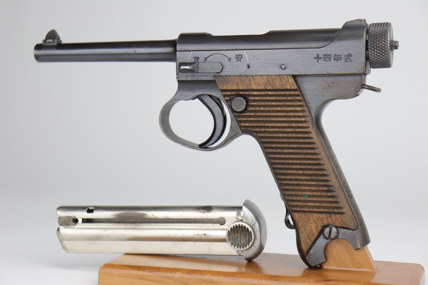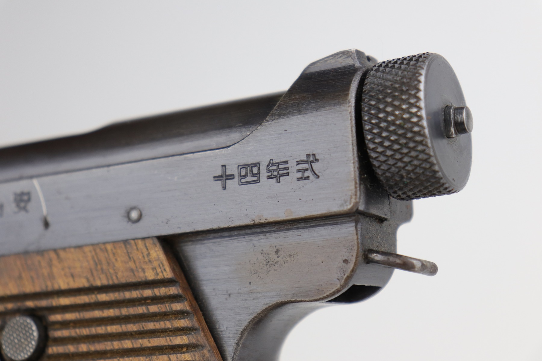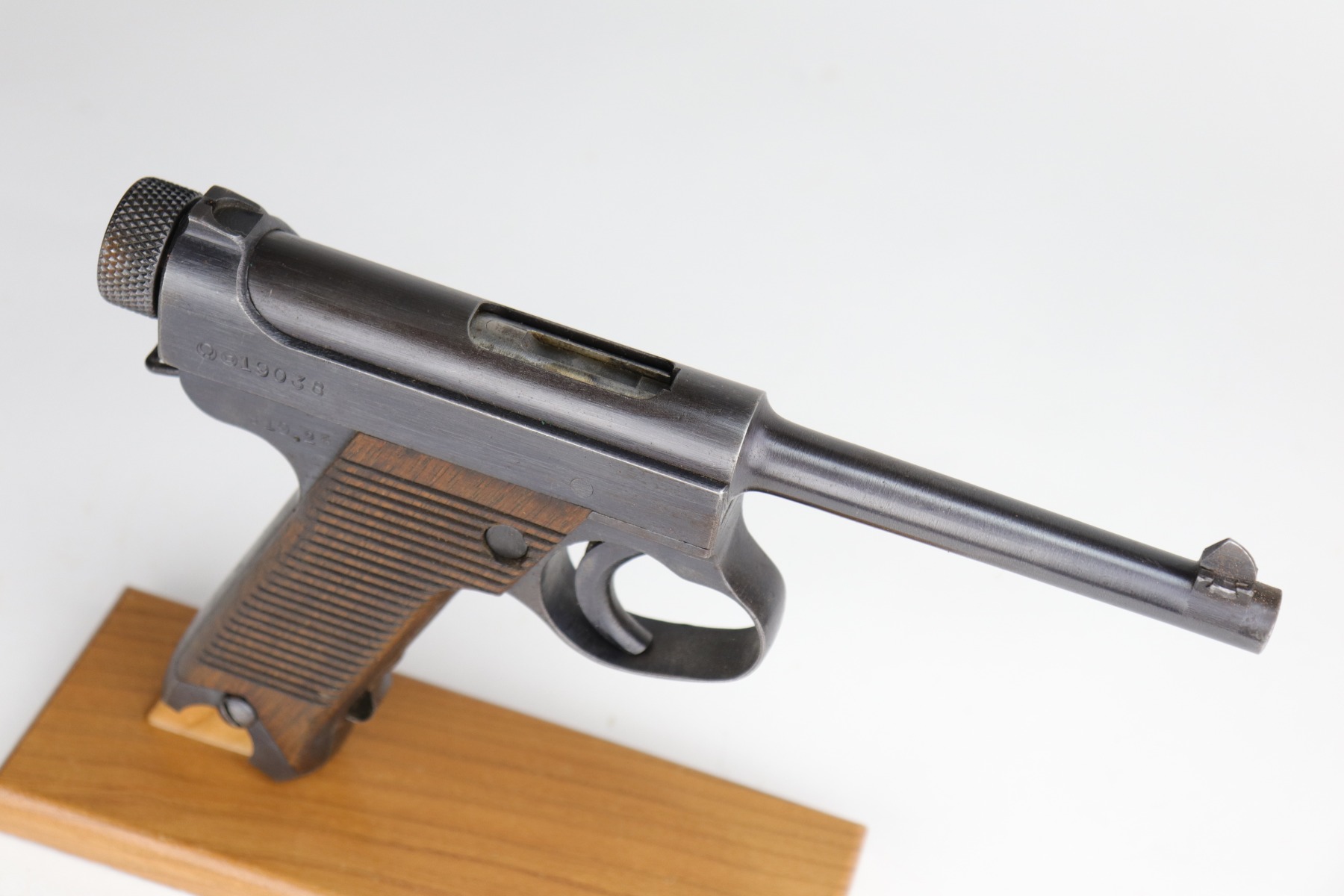 9/30/20 – This is a very nice example of a Nambu Type 14 rig issued to the Japanese military in February of 1944. The rig includes an original holster, an original cleaning rod, and a period-correct mismatched magazine. The gun has retained about 90% of its original bluing. Most of the wear is on the straps. There is also an area of discoloration toward the back of the left side of the frame. There is pitting here and there but most noticeable on the straps. The bore is mint.