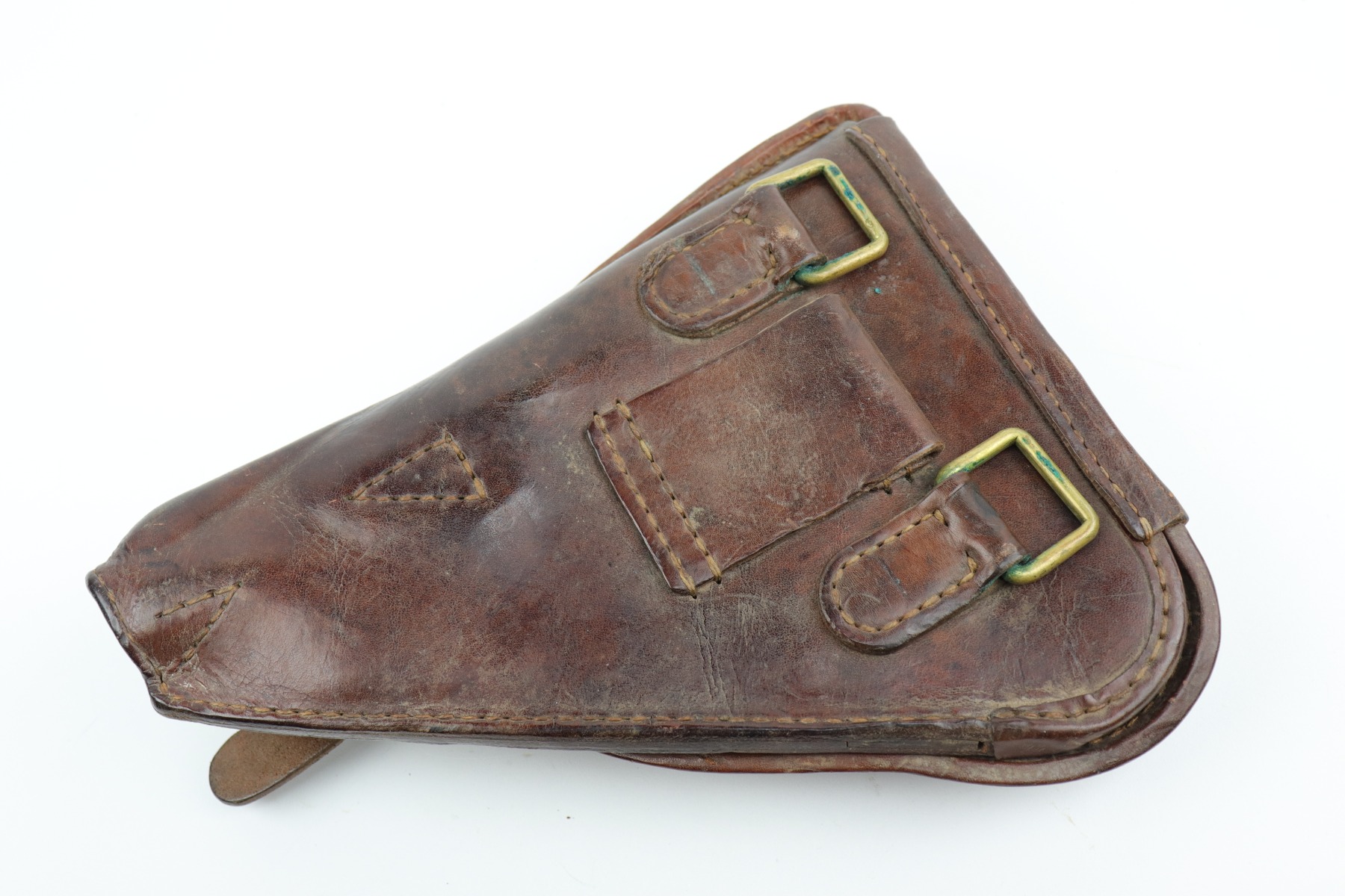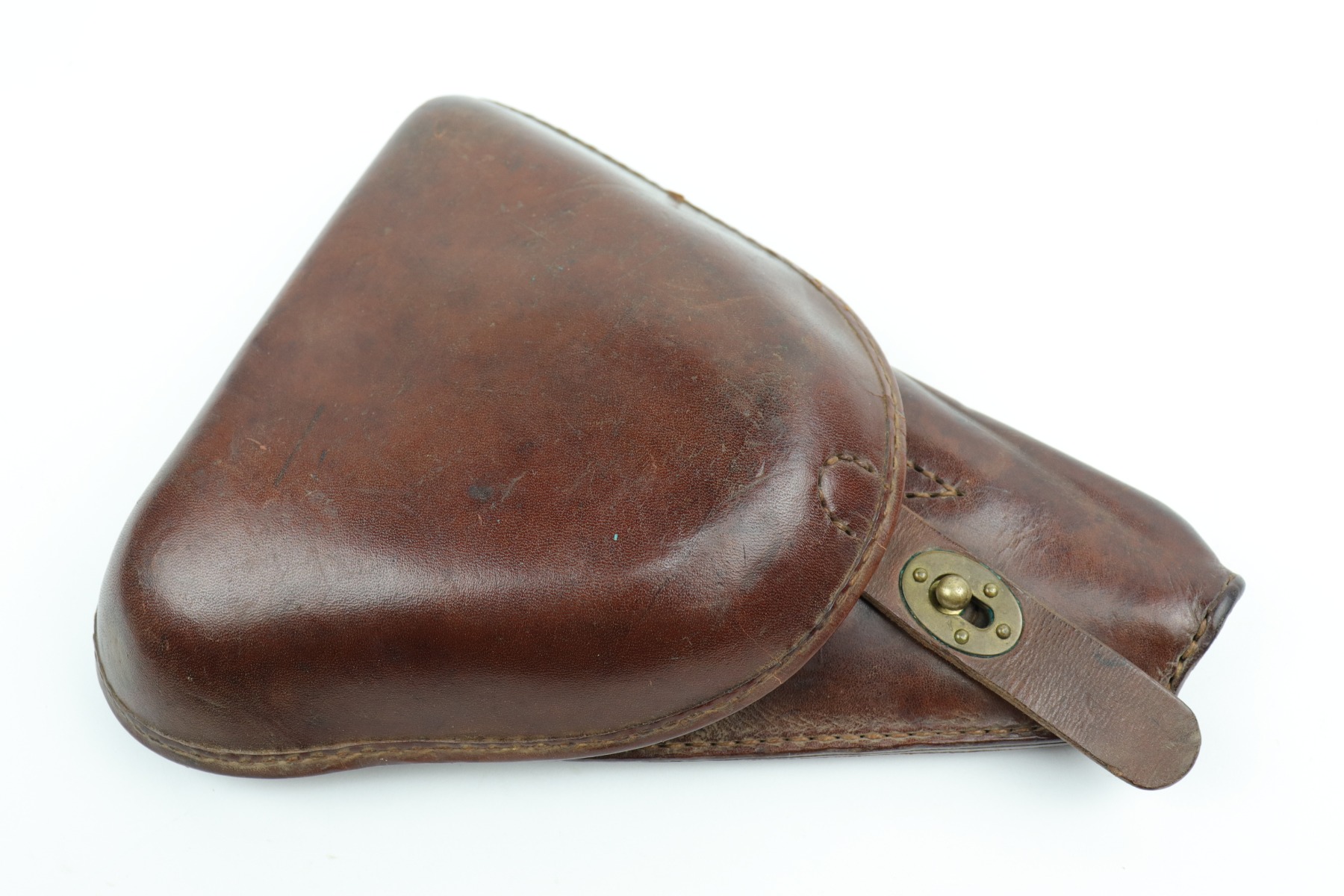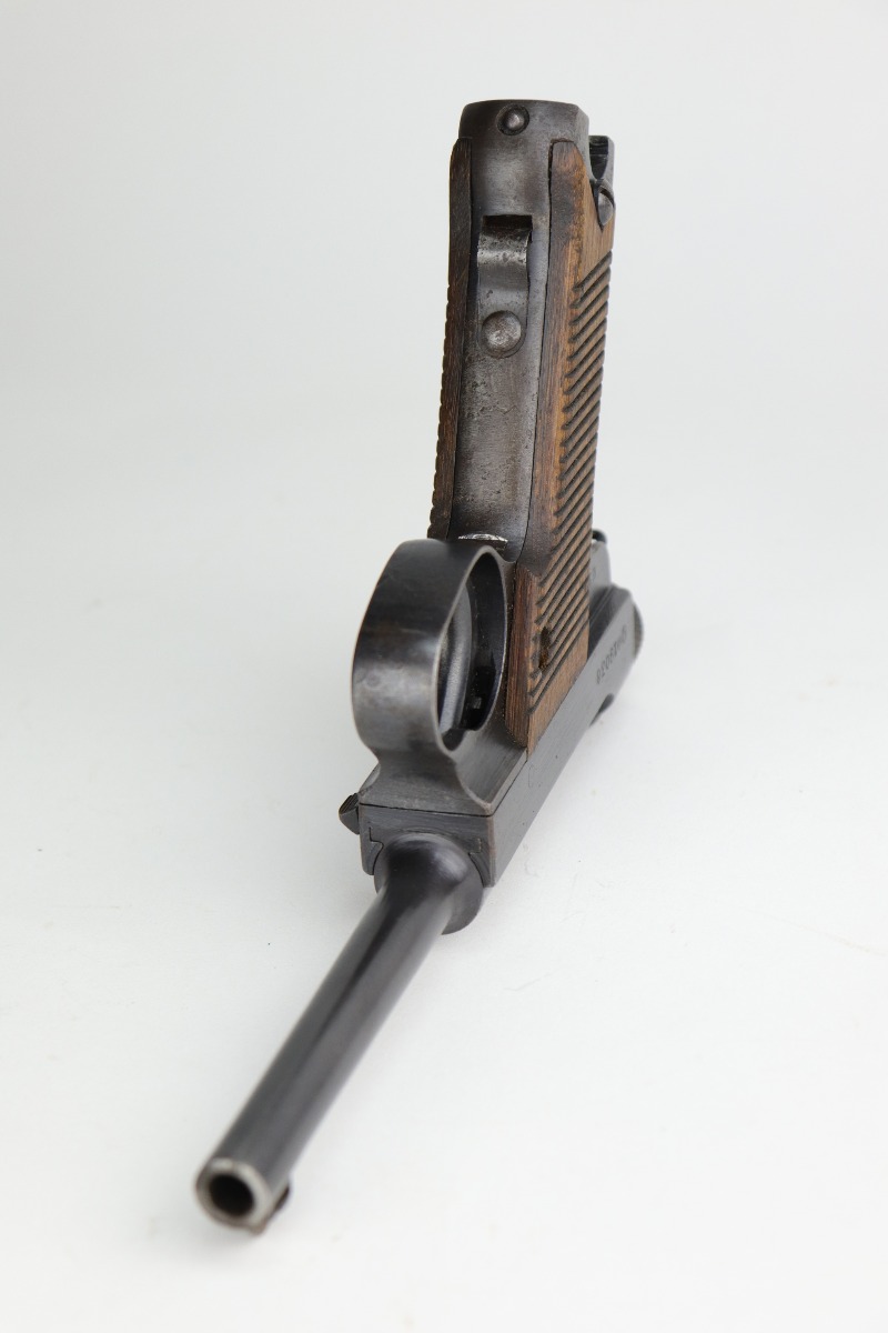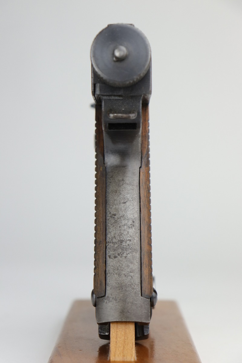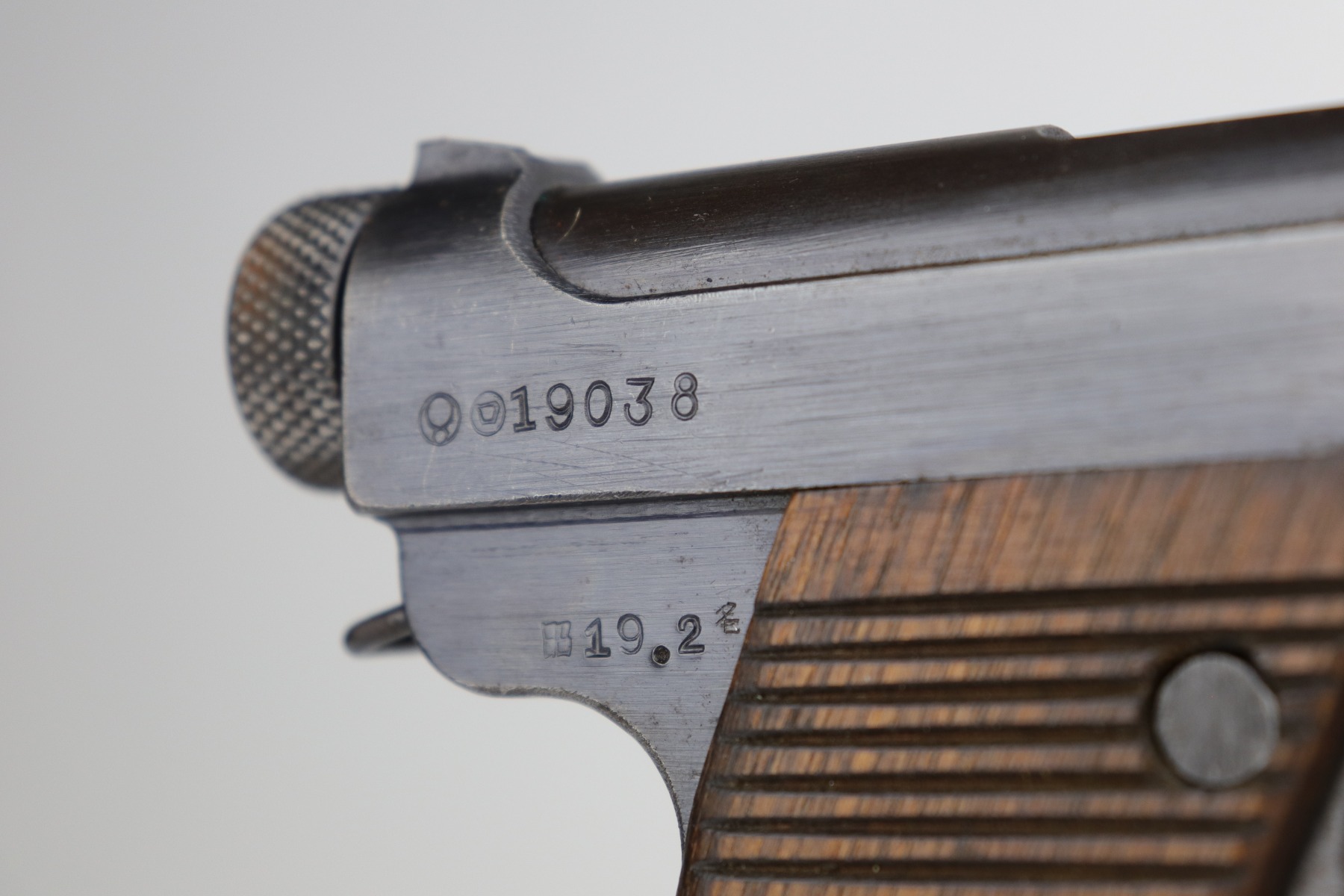 9/30/20 – This is a very nice example of a Nambu Type 14 rig issued to the Japanese military in February of 1944. The rig includes an original holster, an original cleaning rod, and a period-correct mismatched magazine. The gun has retained about 90% of its original bluing. Most of the wear is on the straps. There is also an area of discoloration toward the back of the left side of the frame. There is pitting here and there but most noticeable on the straps. The bore is mint.