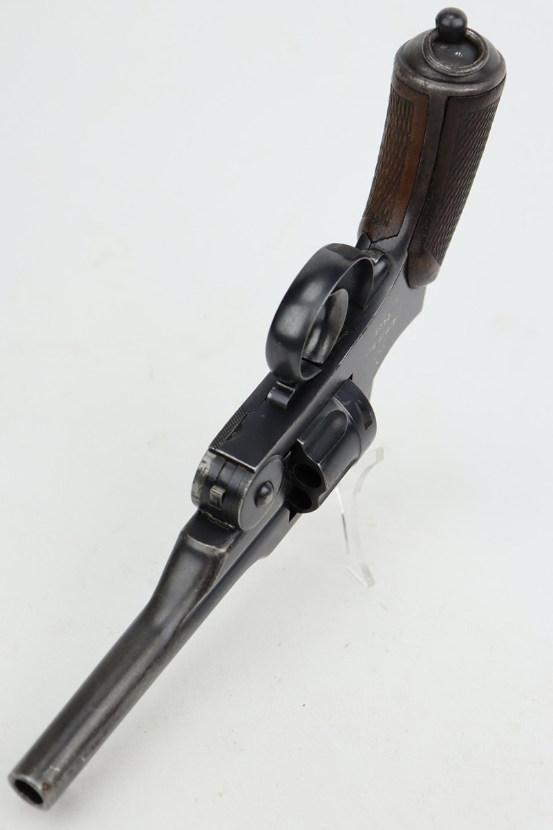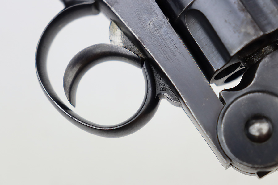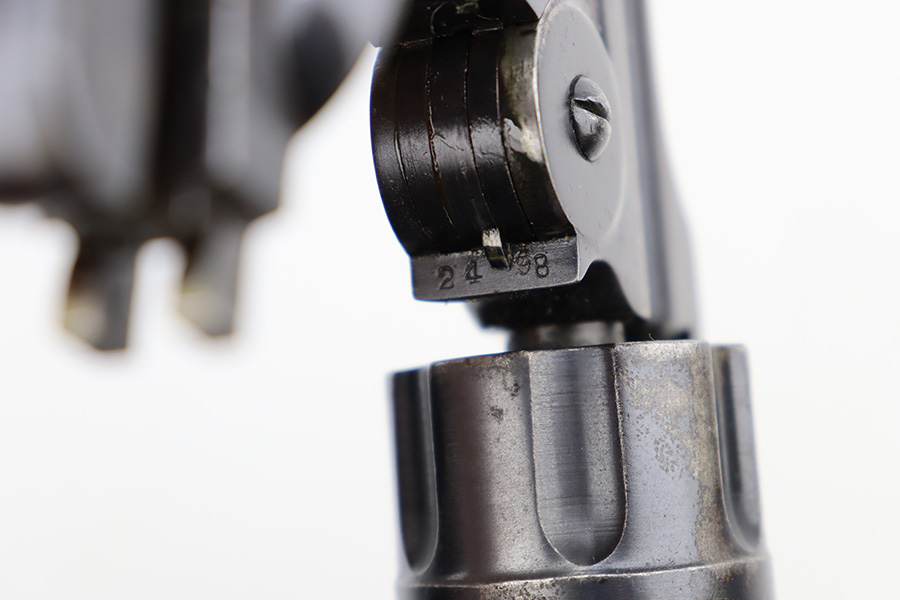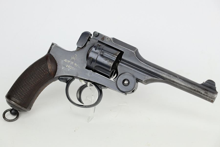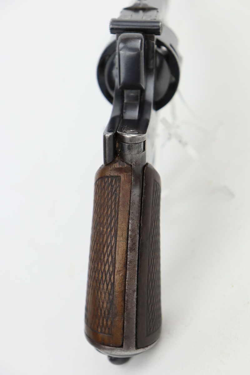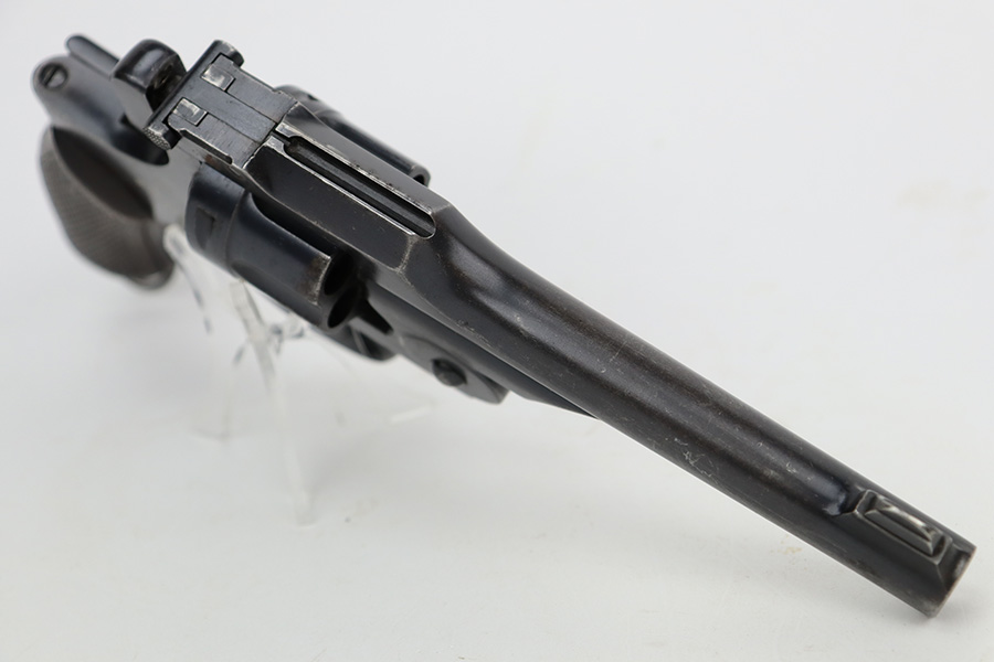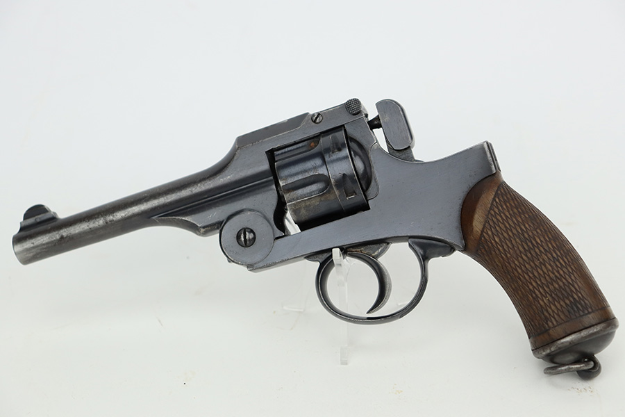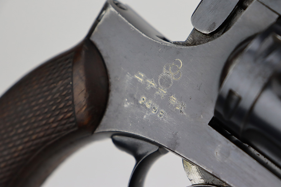 6/22/23 – This is a nice example of a Japanese Type 26 revolver. The Type 26 or Model 26 “hammerless” revolver was the first modern revolver adopted by the Imperial Japanese Army. It was developed at the Koishikawa Arsenal and is named for its year of adoption in the Japanese dating system (the 26th year of the reign of the Meiji emperor, i.e., 1893). The revolver saw action in conflicts including the Russo-Japanese War, World War I and World War II. This one has retained roughly 85% of its bluing. The majority of the wear is along the whole barrel, where there is also some light spotty oxidation. There is thinning, brown patina, and some pin-pricking on the grip straps. One small dot of surface rust on the cylinder. Fitted with nice period-correct wood grips. The bore is near-mint.