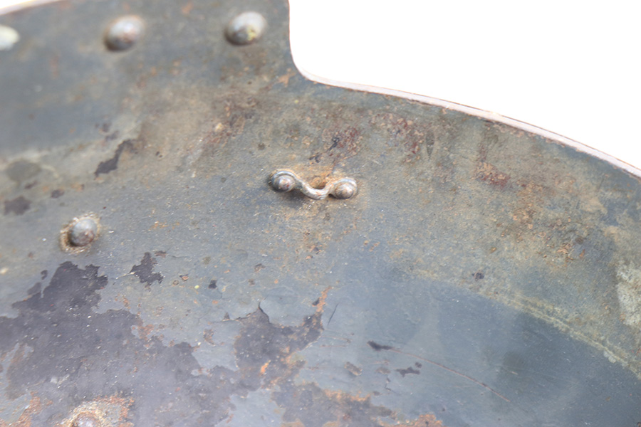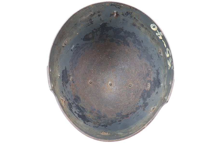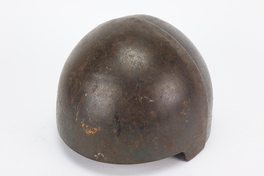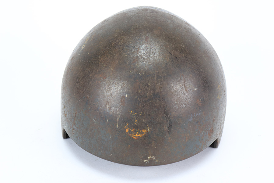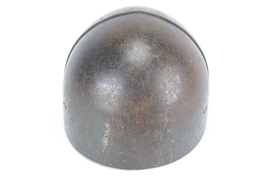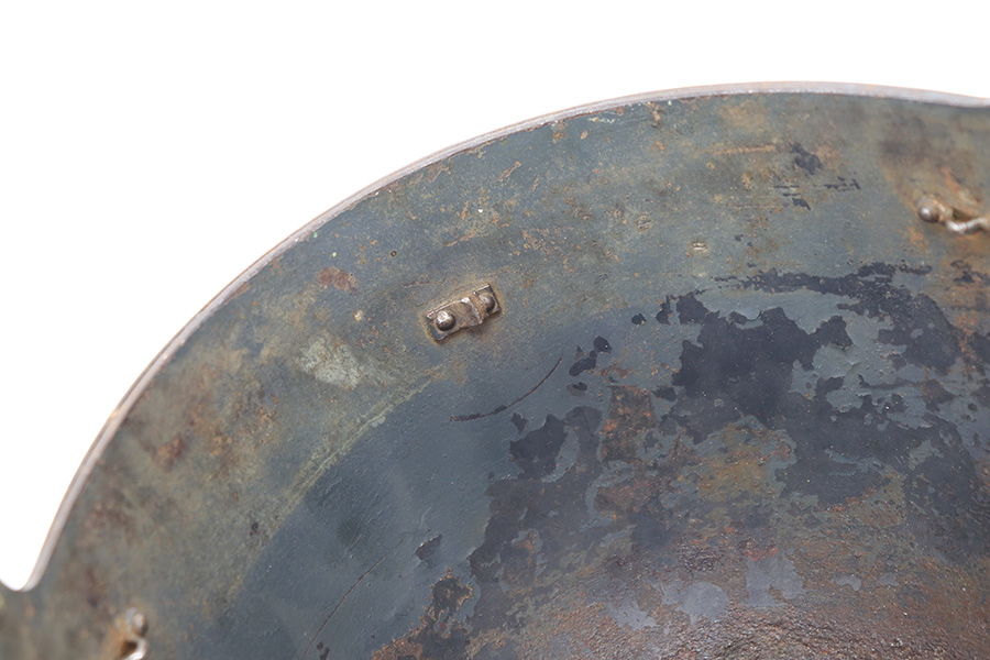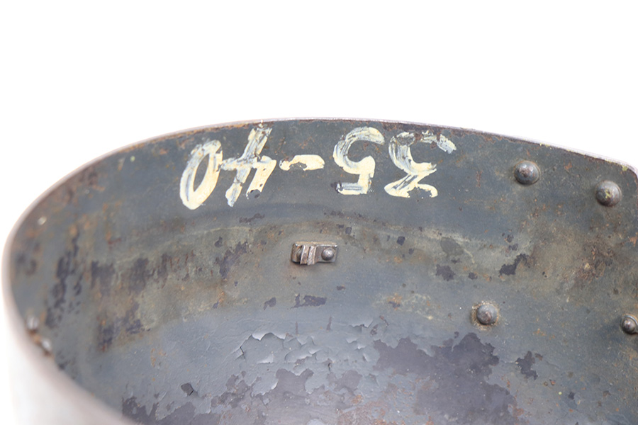 3/16/22 – This is a rare Japanese Naval Assault Helmet from WW2. These helmets were made for the front lines (landing forces) of the Japanese Navy, but the production of this helmet was short-lived as it required expensive raw materials to manufacture. The helmet features a reinforced steel plate over the front half of the helmet, as shown. This provided extra protection from enemy fire. The helmet has surface patina and paint loss throughout the shell, and no liner is present. The front exterior shows a faint Japanese navy anchor logo. The interior is marked “35-40” in paint, which is likely a size suggestion.