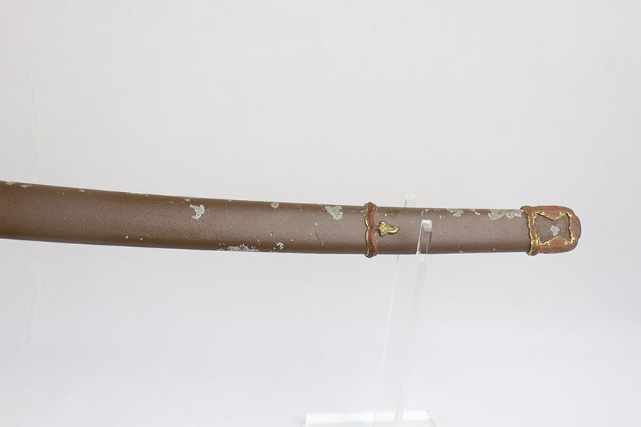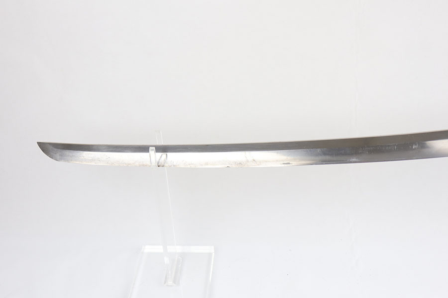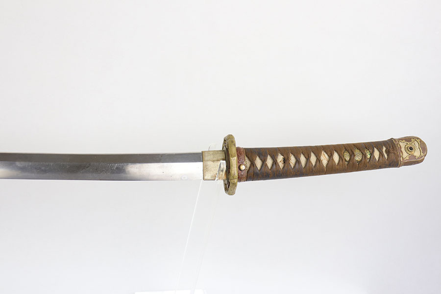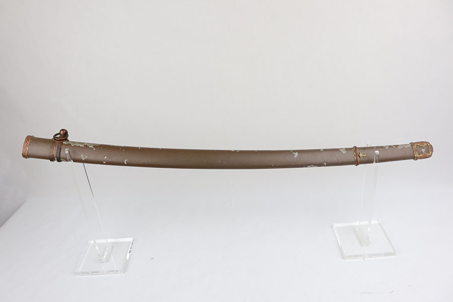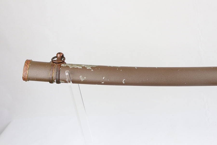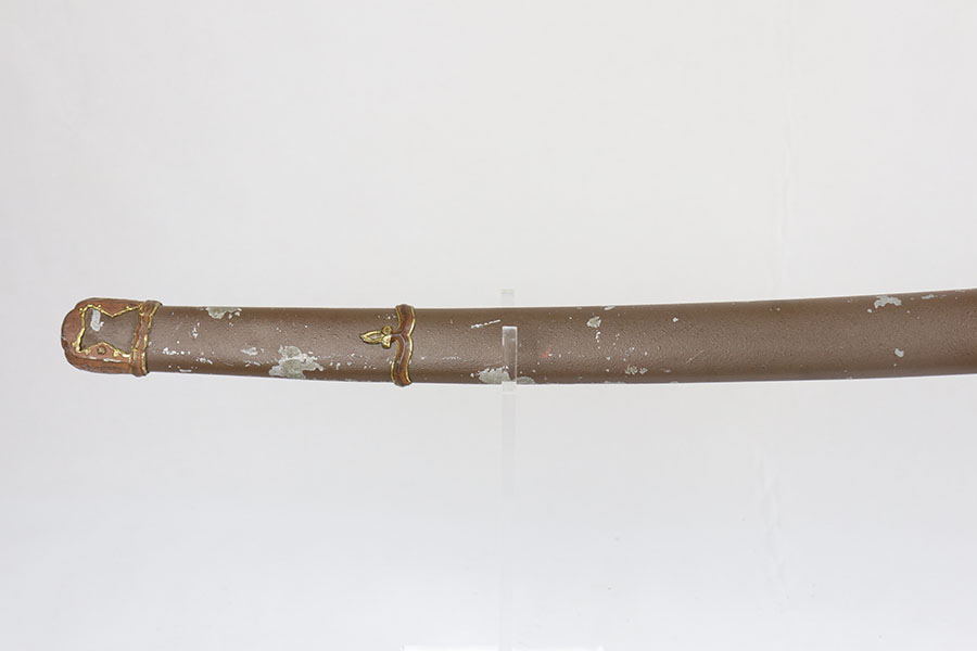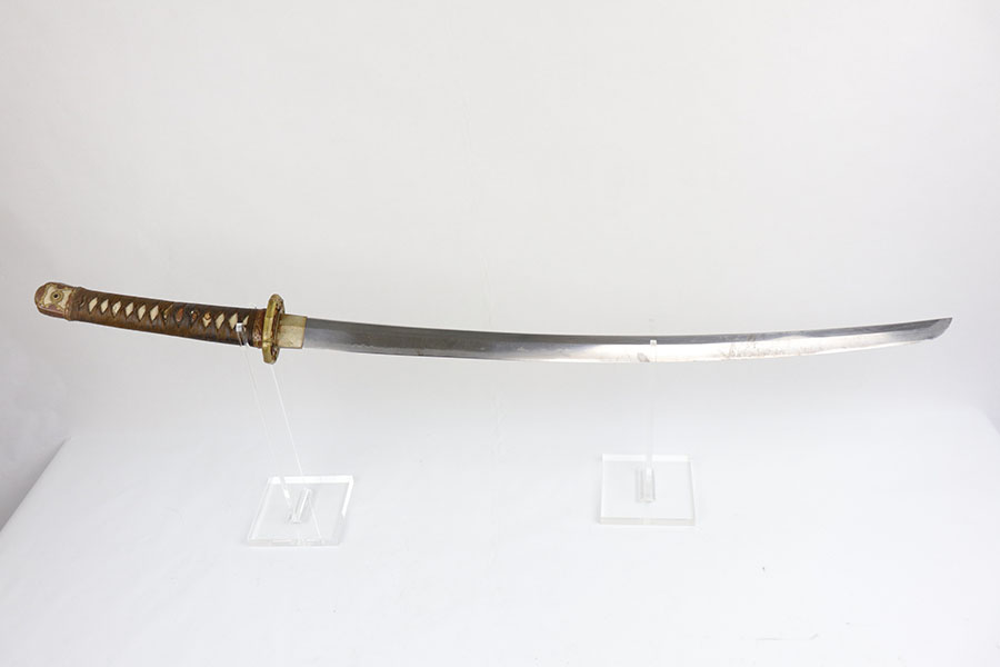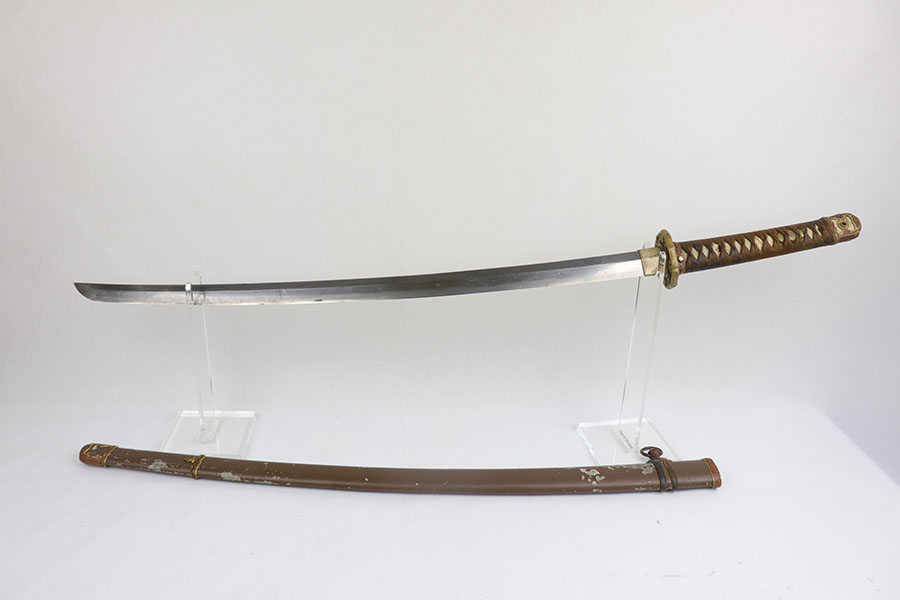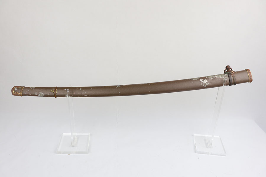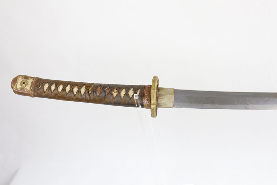 7/27/20 – This is an original late WW2 production Japanese Officer’s sword. The sword comes with the original scabbard. The katana blade was made by Kanetsugu in 1944. The edge has a few minor nicks / chips, and there is some surface wear near the edge towards the upper portion of the blade. There are also various small spots of oxidation. The hand guard has some mild “play” and can wiggle slightly in place. The mekugi is chipped slightly, and there is some light cracking in the white finish under the wrapping of the handle, but this is minor. The fittings are all original. The scabbard is original and metal for wearing in combat, and only has some minor paint / finish loss as shown in photos.