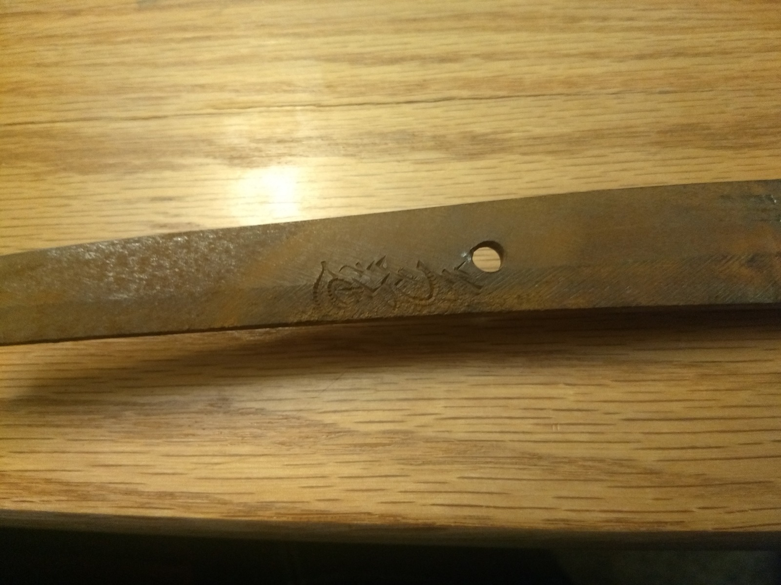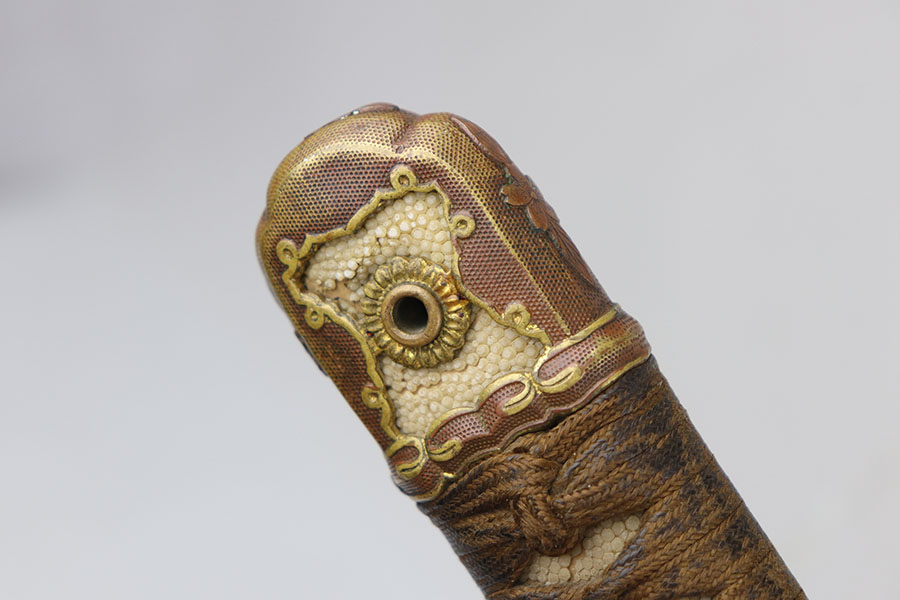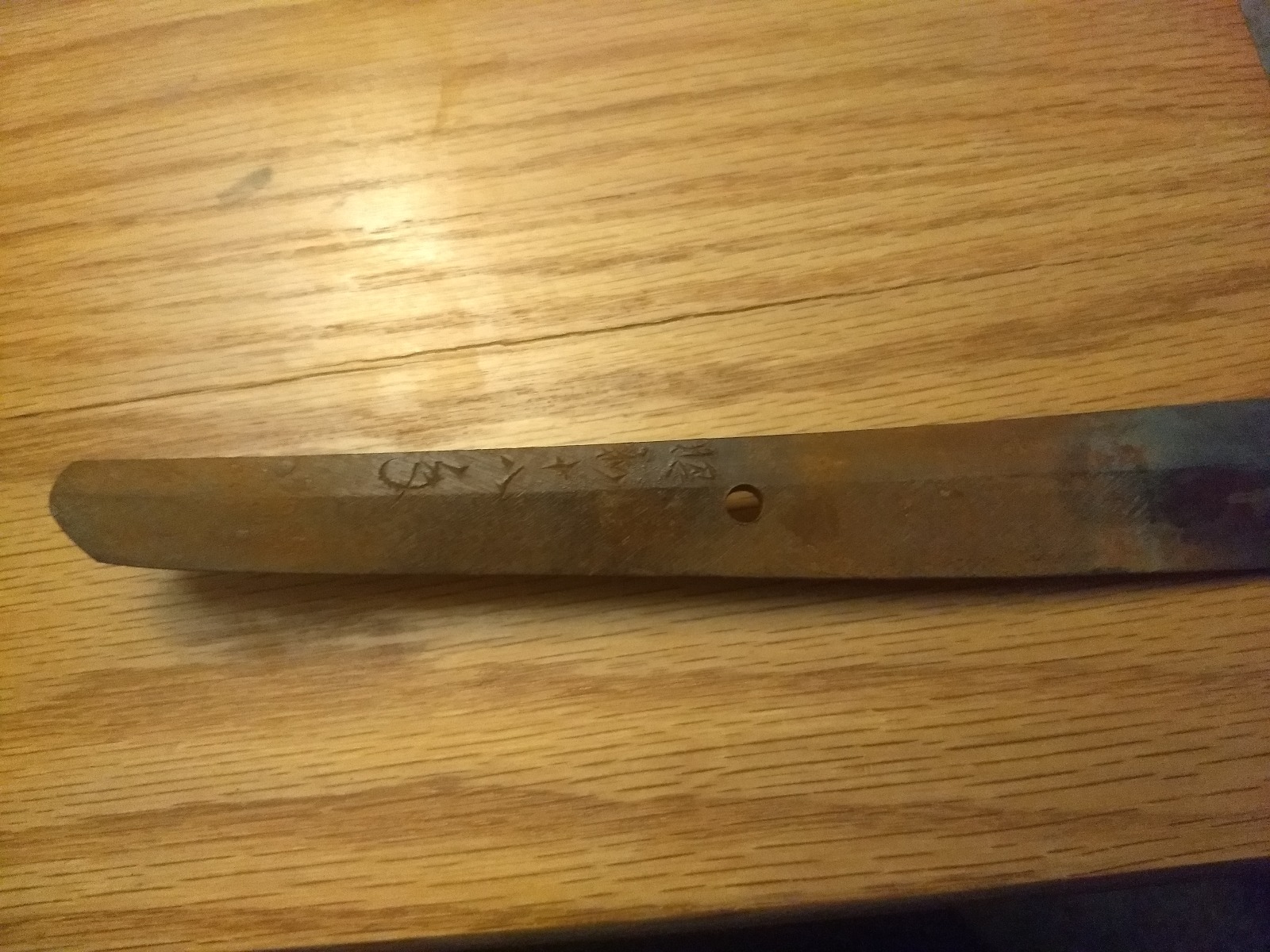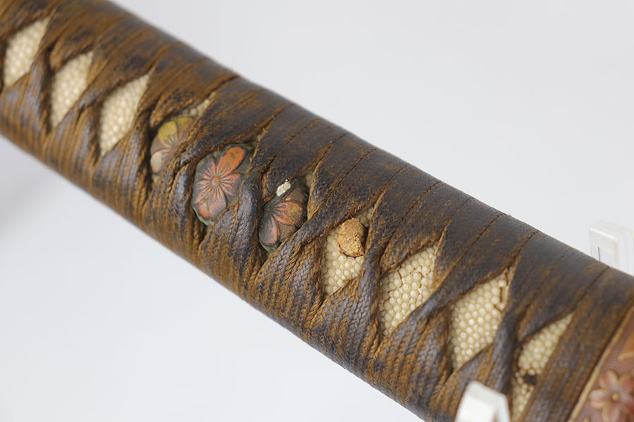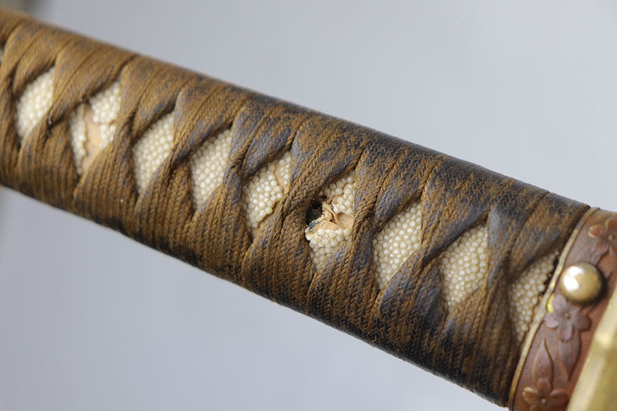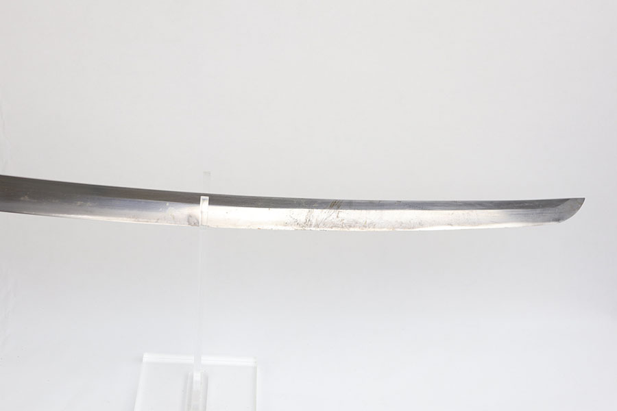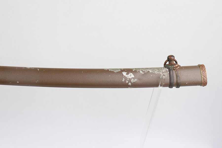 7/27/20 – This is an original late WW2 production Japanese Officer’s sword. The sword comes with the original scabbard. The katana blade was made by Kanetsugu in 1944. The edge has a few minor nicks / chips, and there is some surface wear near the edge towards the upper portion of the blade. There are also various small spots of oxidation. The hand guard has some mild “play” and can wiggle slightly in place. The mekugi is chipped slightly, and there is some light cracking in the white finish under the wrapping of the handle, but this is minor. The fittings are all original. The scabbard is original and metal for wearing in combat, and only has some minor paint / finish loss as shown in photos.