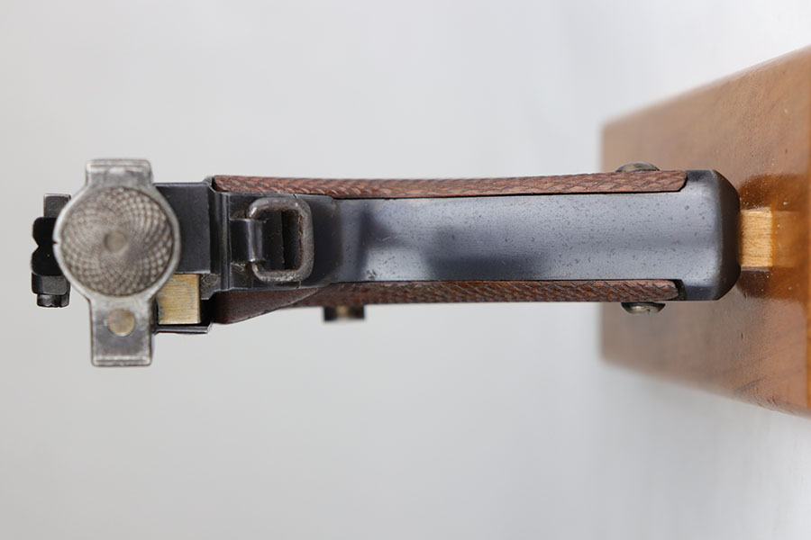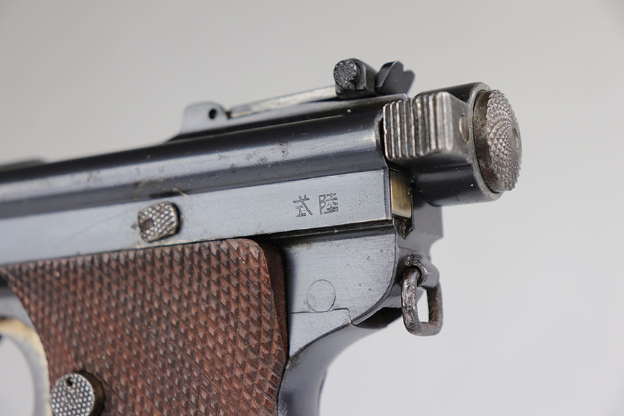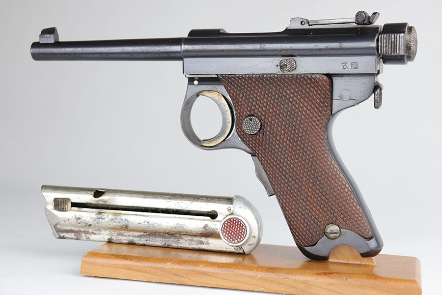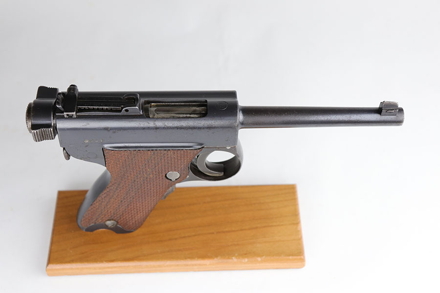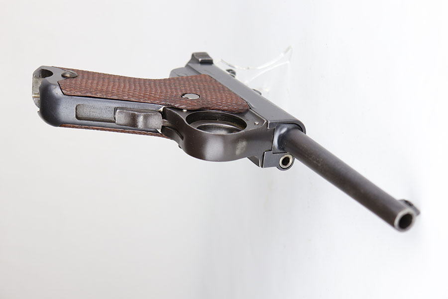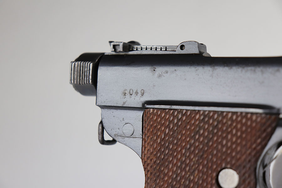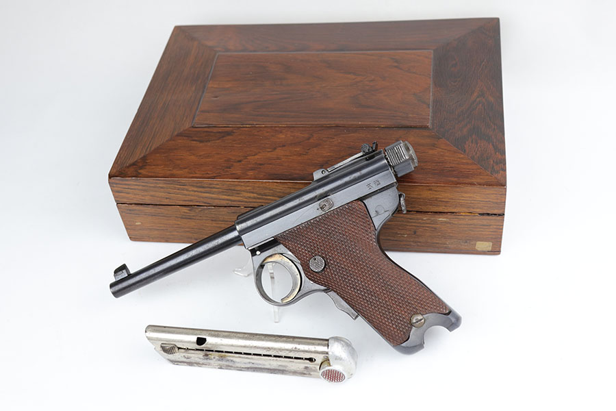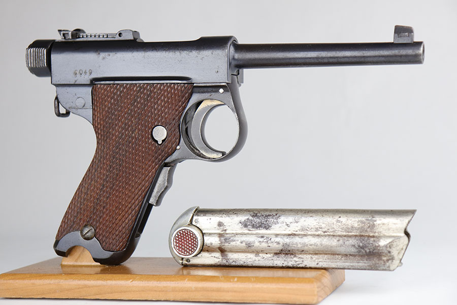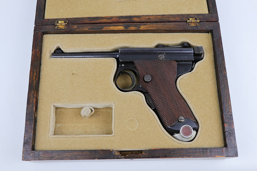 6/24/20 – This is a very rare Japanese Papa Nambu or Modified Type 1902 that appears to be a private purchase example. It was manufactured by Tokyo Gas & Electric, and there were only ever about 10,000 Papa’s ever produced, but Derby & Brown’s book on Japanese handguns states there are only about 10 known private purchase TGE examples. They have no Naval proof or markings in general next to the serial number. This one was arsenal refurbished with mismatched numbered parts throughout. Note that the first digit in the serial appears a double strike but not renumbered. The bluing is excellent overall but there are areas of patina/oxidation and some freckling. The grips are in excellent condition but unnumbered, so also likely replaced at some point. Rare, original magazine that is mismatched to the gun. The bore is shiny with strong rifling but does have some pitting throughout. The pistol also comes with a custom fitted case.