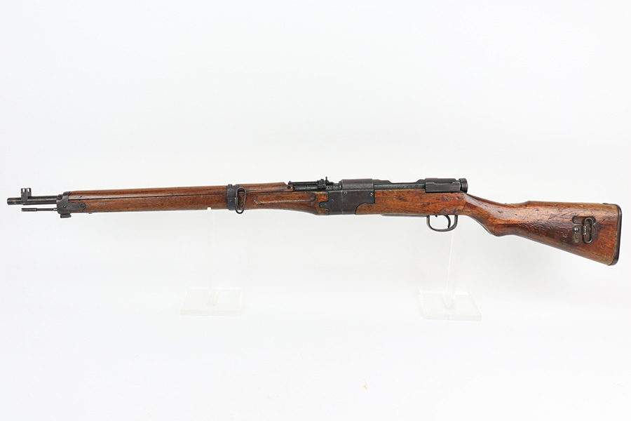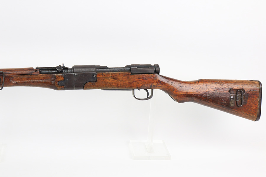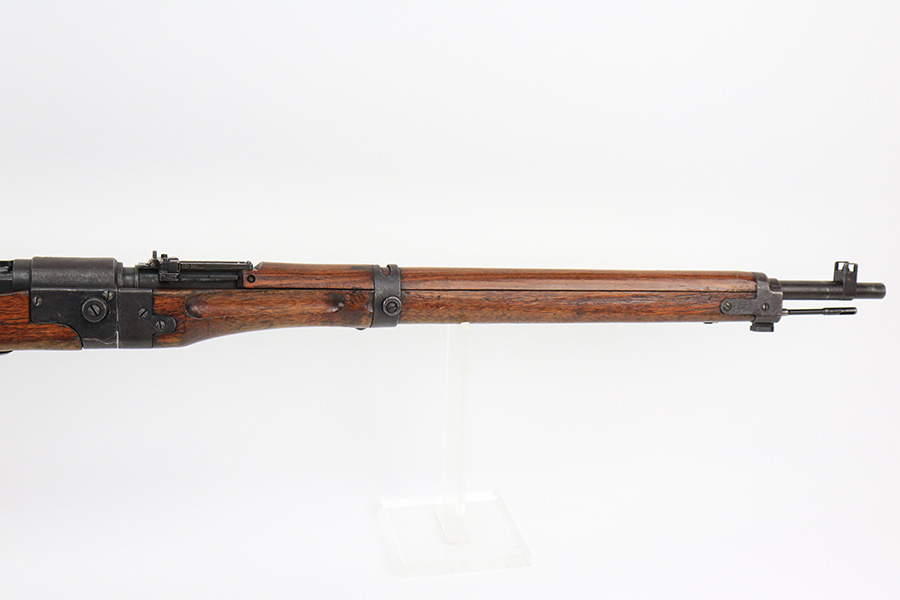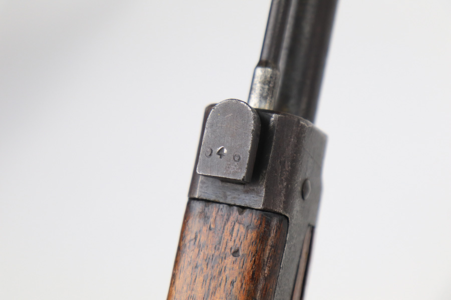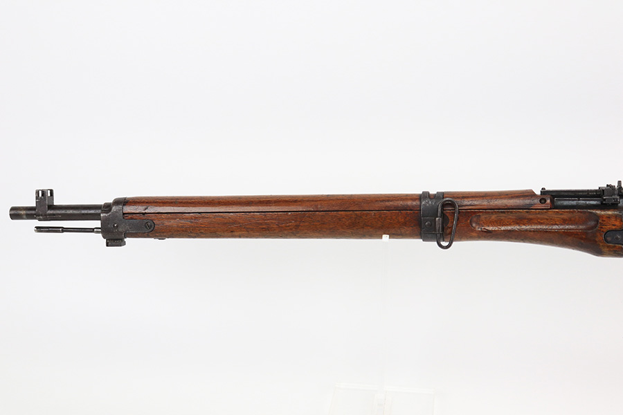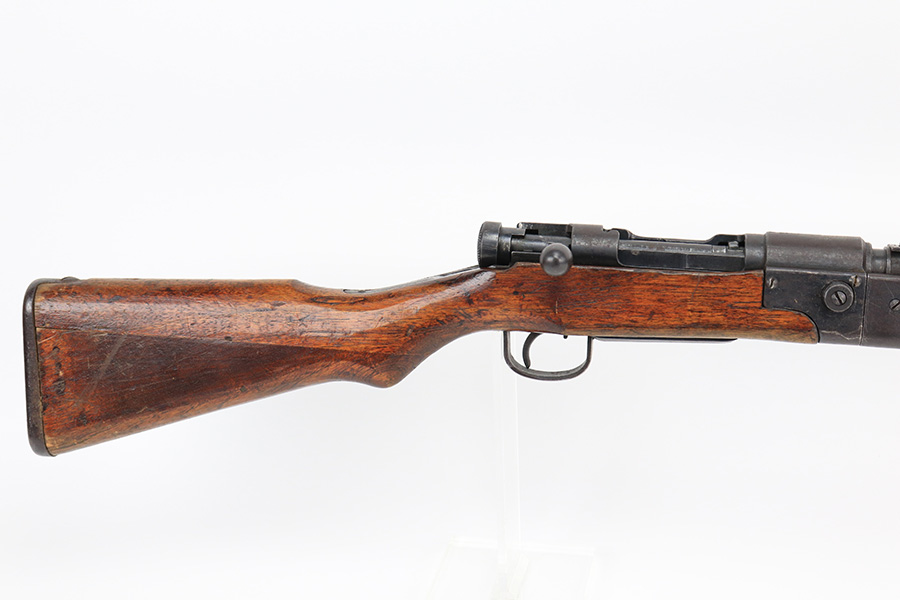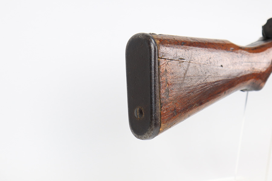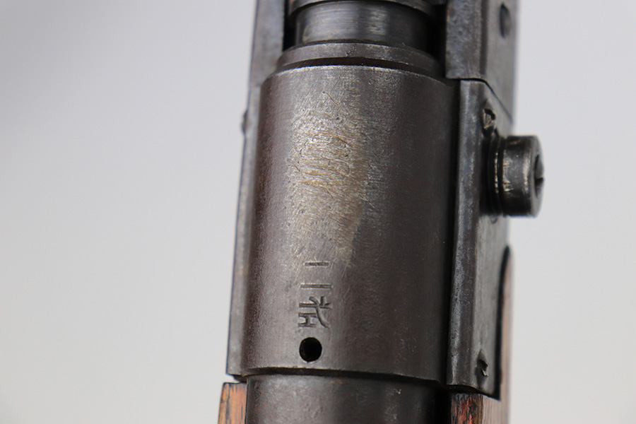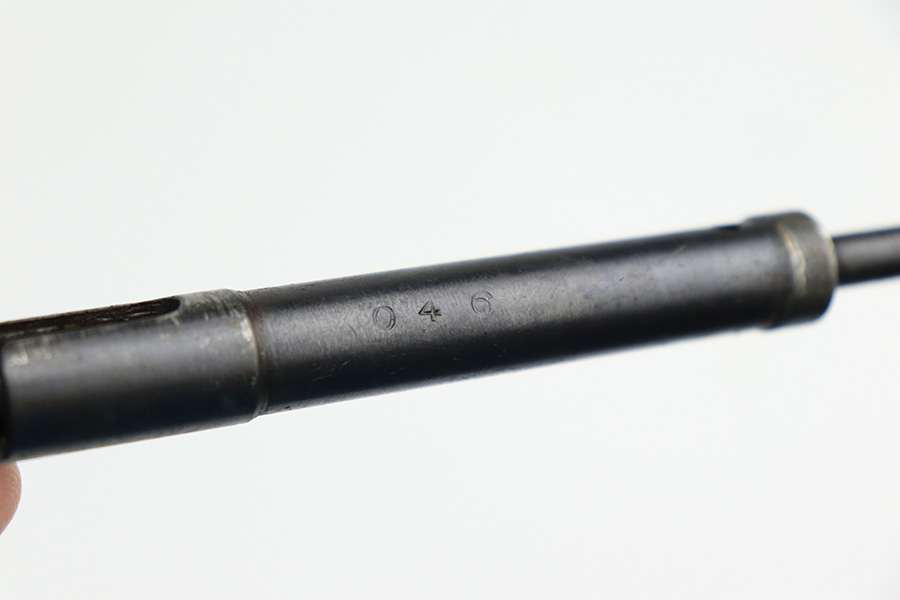 5/5/22 – This is a nice example of a Type II Paratrooper rifle issued to the Japanese military during WW2. The gun is all matching, including the conjoining parts in the middle Unfortunately, the original Imperial mum stamp on the receiver has been ground. The gun is in nice condition overall, but there is noticeable brown patina covering all of the metal parts. There is some finish loss where the mum was ground and some thinning on the floor plate. There are noticeable dings, bruises, and scratches on the stock throughout, but there is no serious damage. The bore is very shiny with strong rifling, but there are a few areas of very light oxidation.