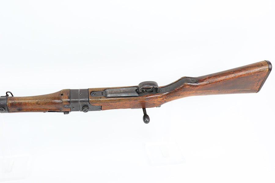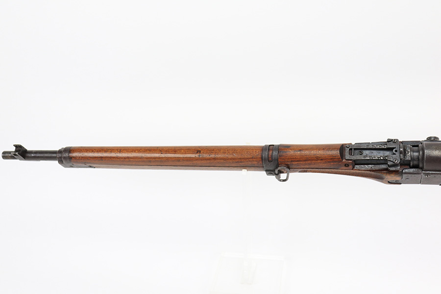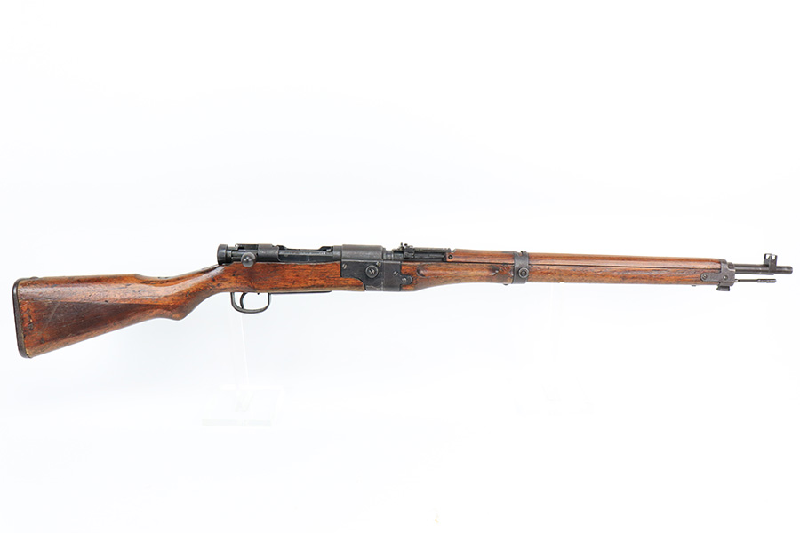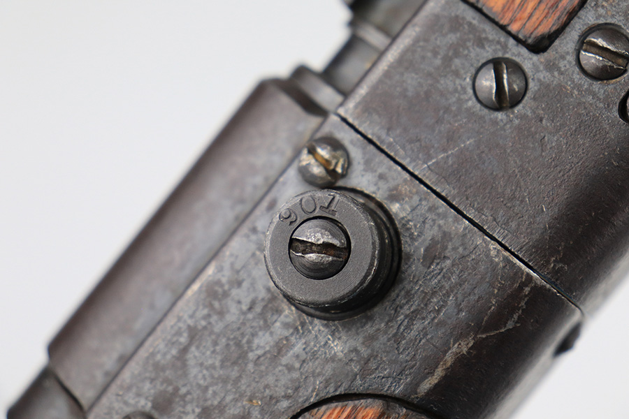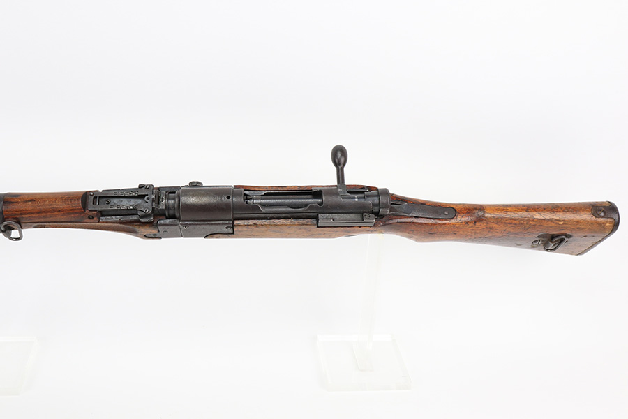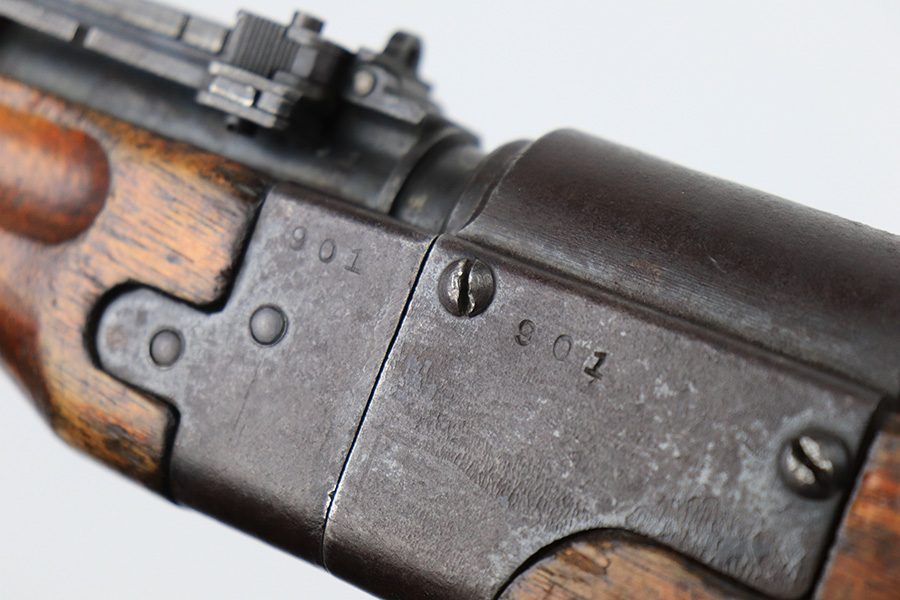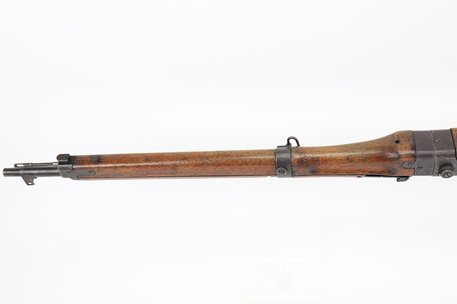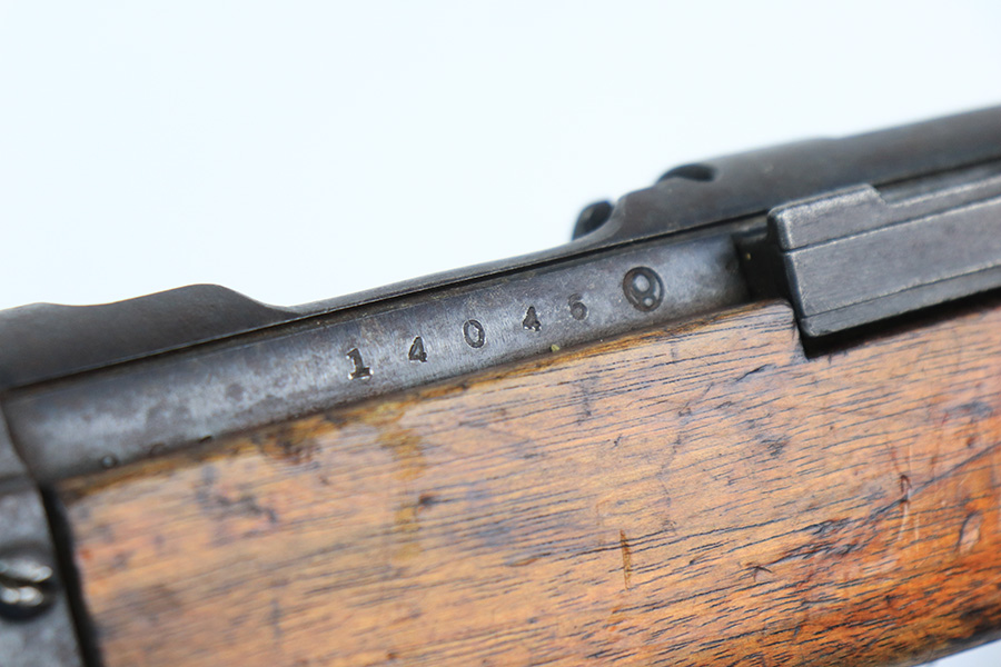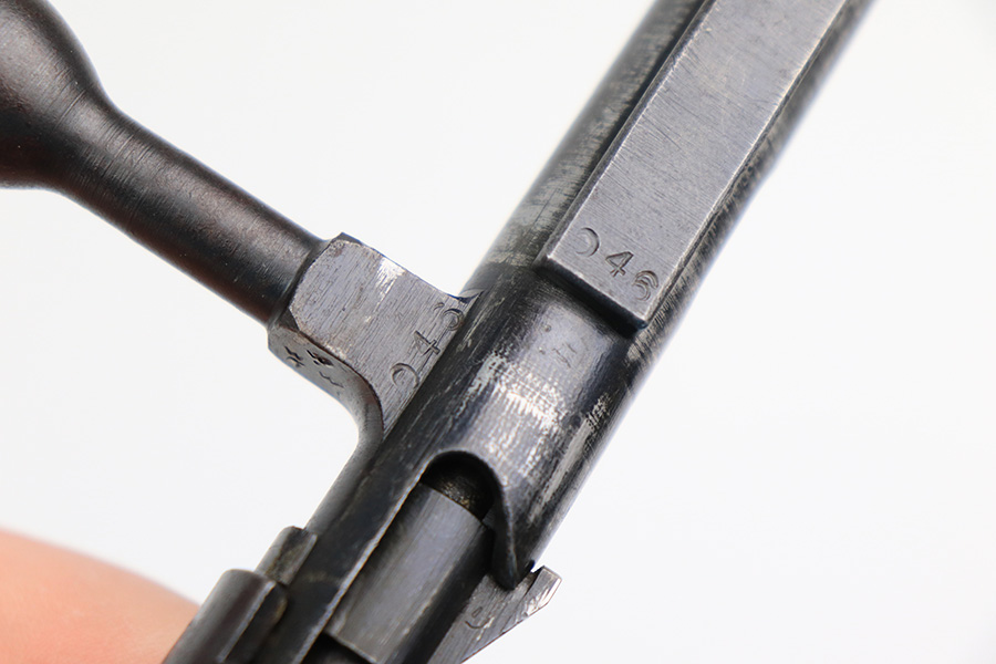 5/5/22 – This is a nice example of a Type II Paratrooper rifle issued to the Japanese military during WW2. The gun is all matching, including the conjoining parts in the middle Unfortunately, the original Imperial mum stamp on the receiver has been ground. The gun is in nice condition overall, but there is noticeable brown patina covering all of the metal parts. There is some finish loss where the mum was ground and some thinning on the floor plate. There are noticeable dings, bruises, and scratches on the stock throughout, but there is no serious damage. The bore is very shiny with strong rifling, but there are a few areas of very light oxidation.