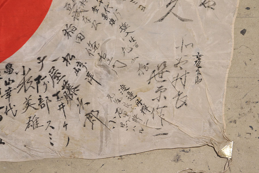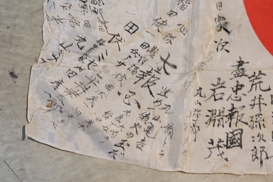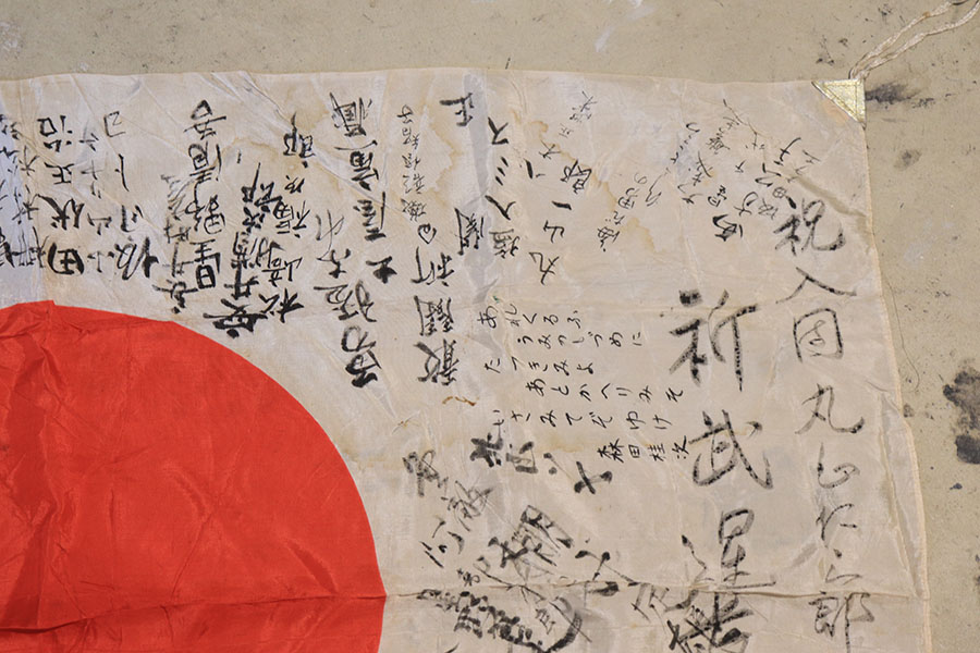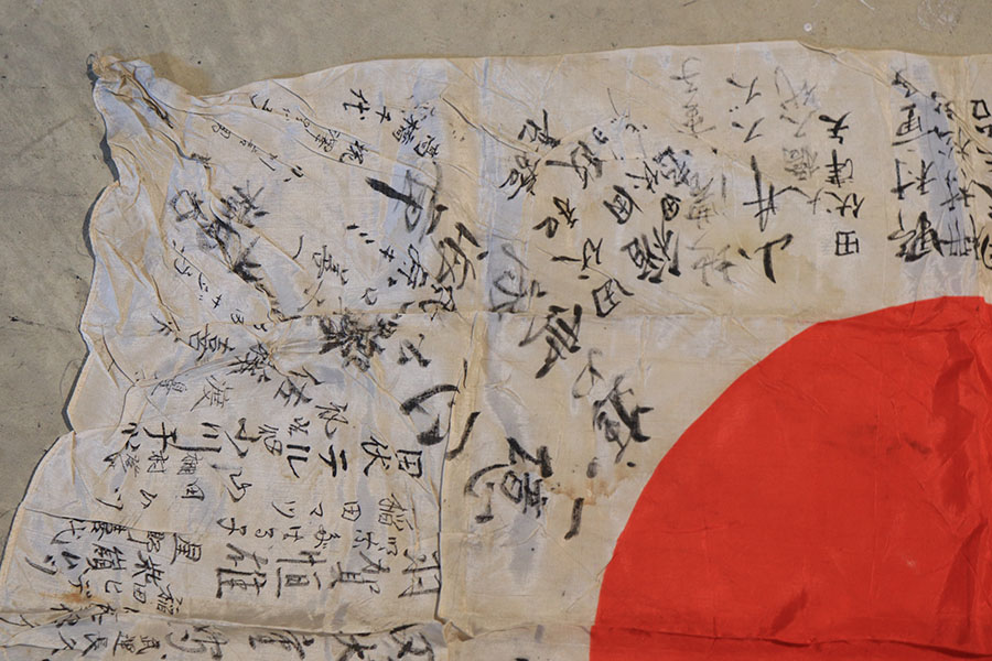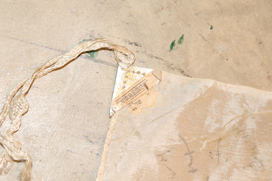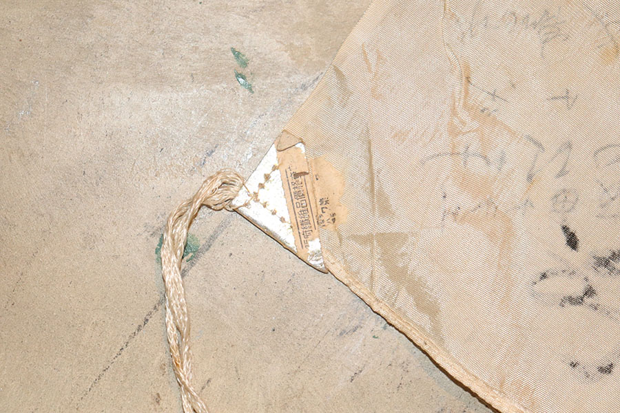 9/3/21 – This is an original WW2 Japanese silk prayer flag. The flag is a little wrinkled and bunches up slightly in one corner, as shown in photos. There are mild stains throughout but no notable rips or tares. Measures 39×25.5 inches approximately. The backside of one corner shows part of the original tag is still in tact. See photos.