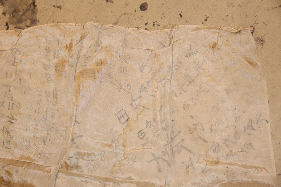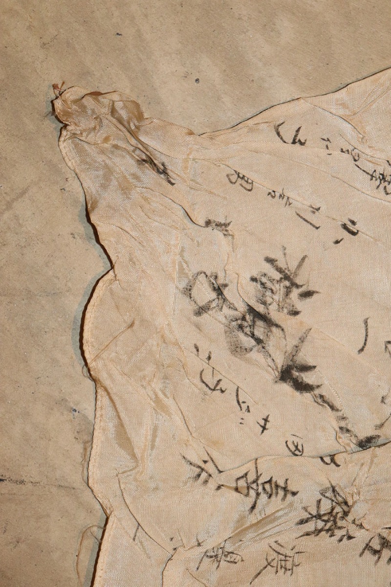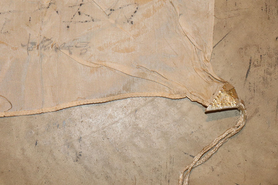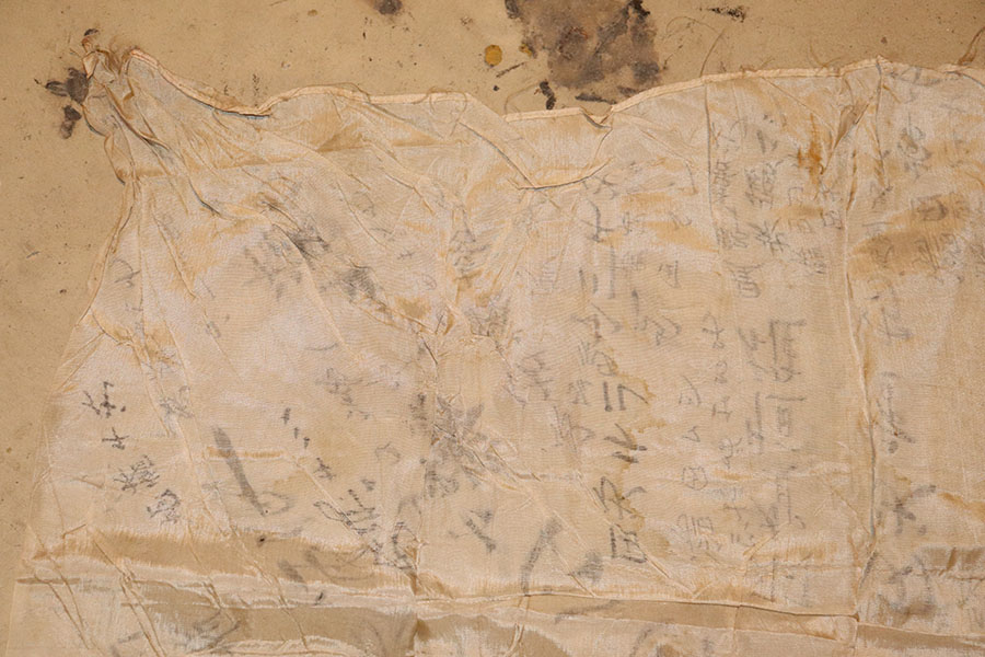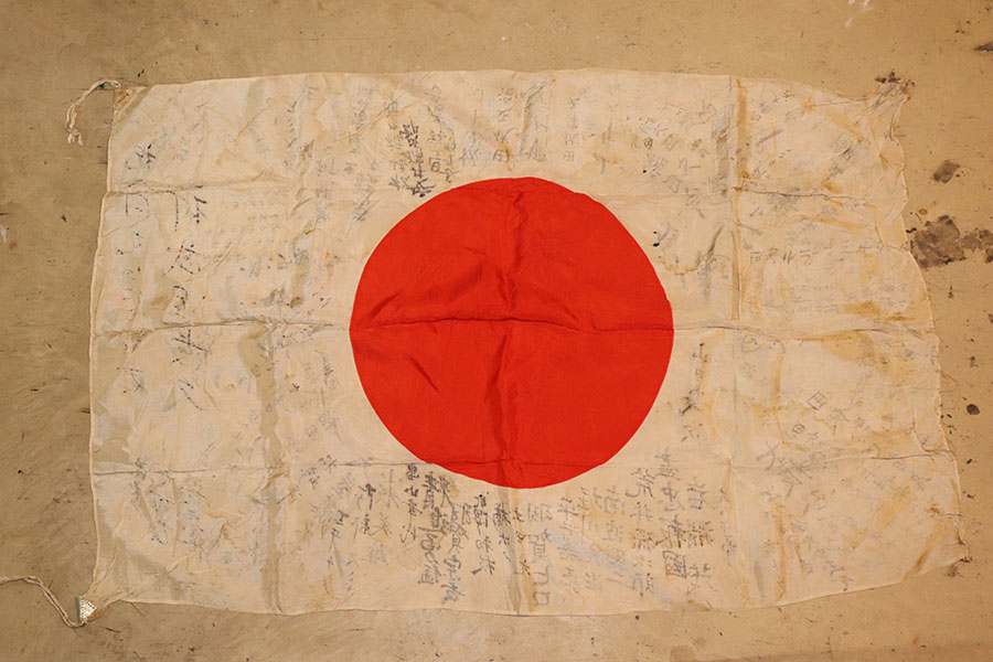9/3/21 – This is an original WW2 Japanese silk prayer flag. The flag is a little wrinkled and bunches up slightly in one corner, as shown in photos. There are mild stains throughout but no notable rips or tares. Measures 39×25.5 inches approximately. The backside of one corner shows part of the original tag is still in tact. See photos.