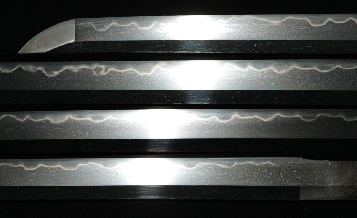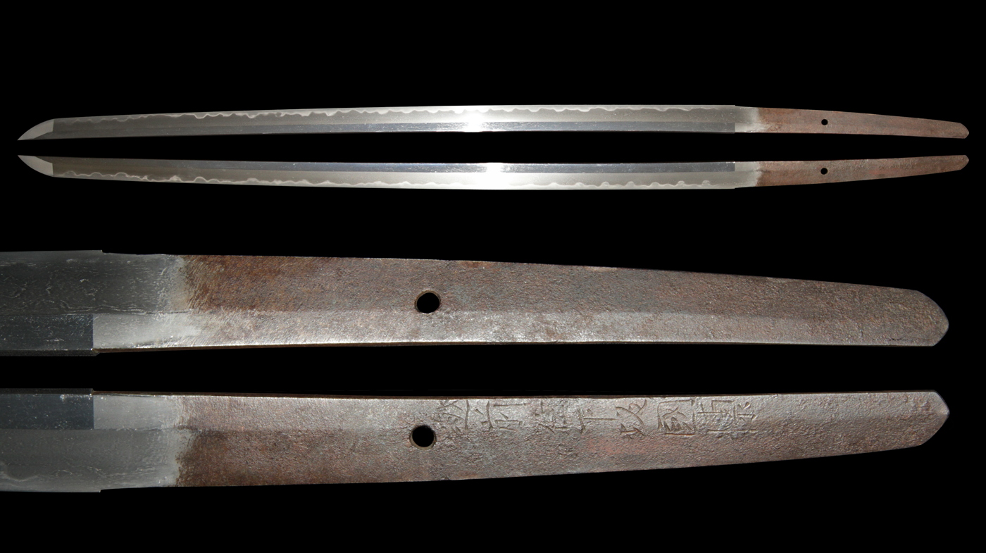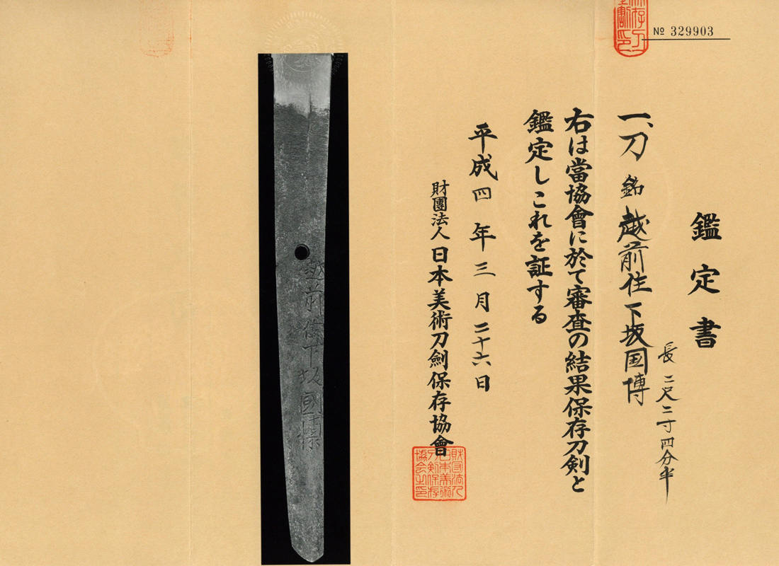 1/13/17 – Early Edo Katana with a highly coveted Nihonto Origami (Japanese Sword Authentication Paper) from the Society for the Preservation of Japanese Art Swords (NBTHK).  The “Brown Paper” certificate grades the blade as Tokubetsu Hozon (Especially Worthy of Preservation).  The Tokubetsu Hozon rating is the second of four current certification levels and is very difficult to achieve.  The Nakago (tang) is completely unaltered and signed by swordsmith “Echizen-Ju Shimosaka Kunihiro,” which translates to “Shimosaka Kunihiro, resident of Echizen.”  Kunihiro, whose original name was Shimosaka Gorobei, was a student of Omura Kabuko, a high ranking smith based in Edo (Tokyo).  Kunihiro worked in Edo and the provinces of Mito and Echizen during the period 1624 – 1661.  He is well known for the prominent Jihada (surface grain) easily visible in his blades.  The condition of this Katana is exceptional.  The length of the blade remains unaltered with a cutting edge of 26.87 inches. The Hamon (tempered cutting edge) is Gunome (wave of semi-circles).  The blade is housed in a traditional wooden storage scabbard (Shirasaya).  A rare opportunity to purchase a collector-grade Japanese sword with NBTHK papers!